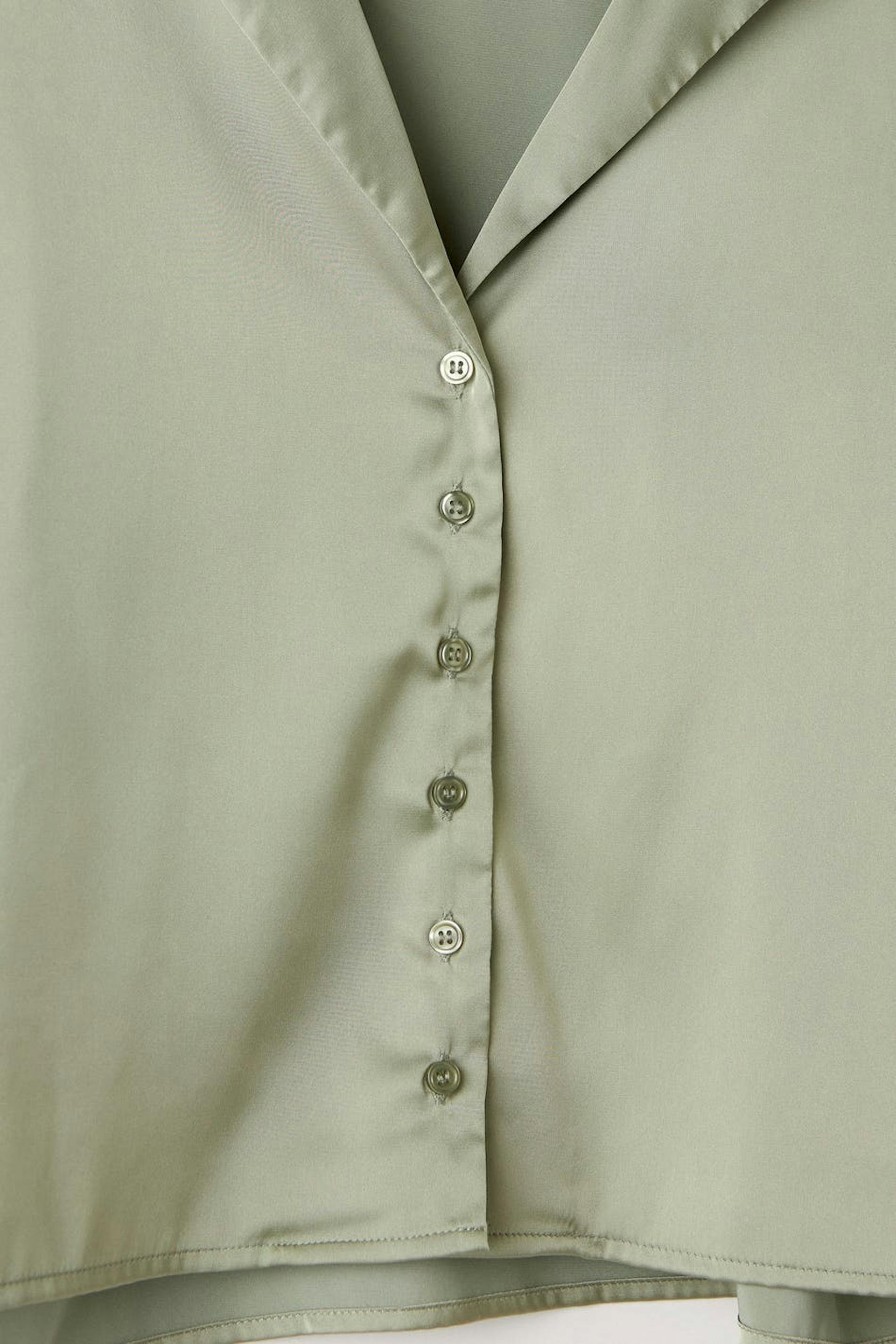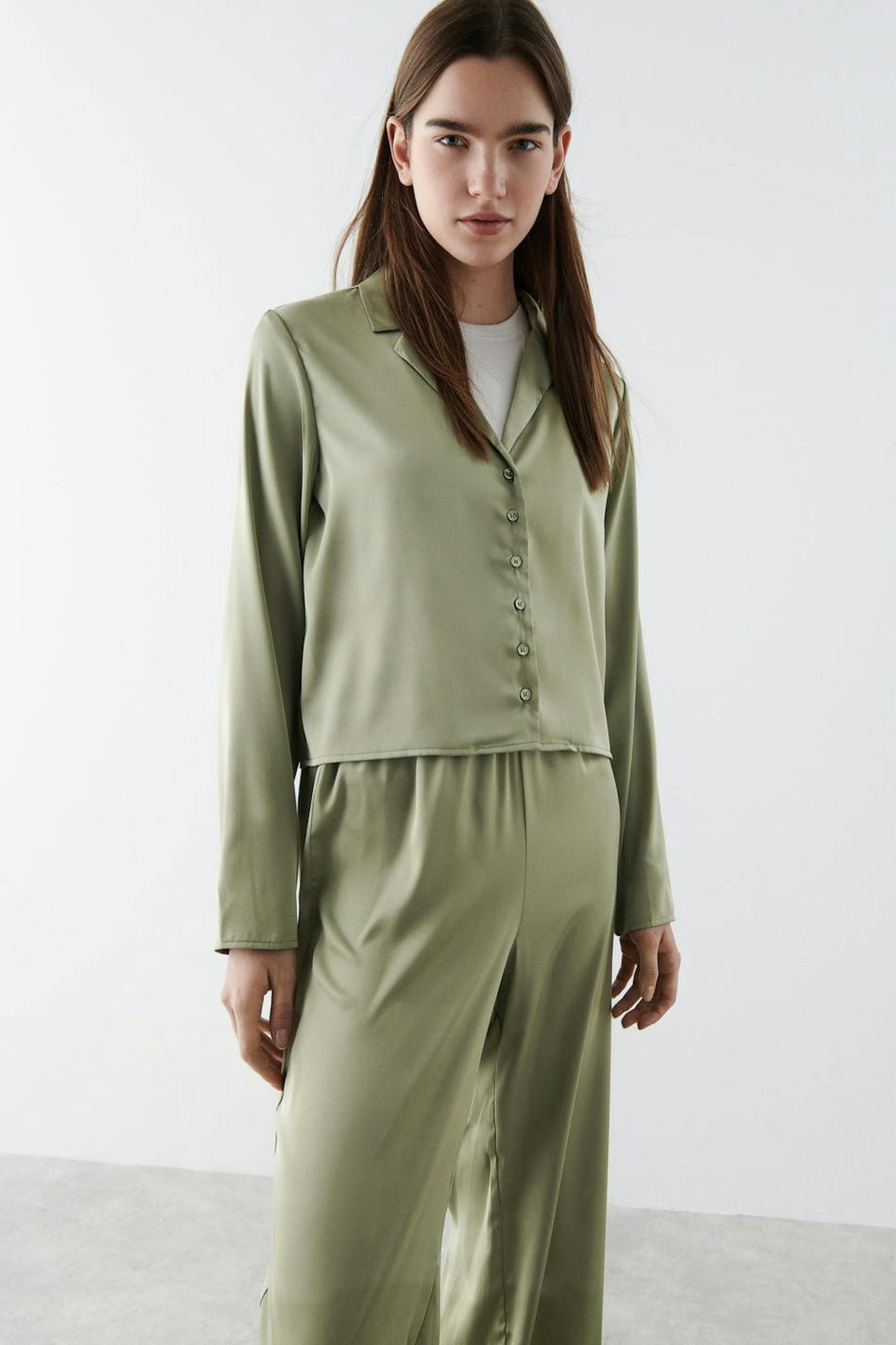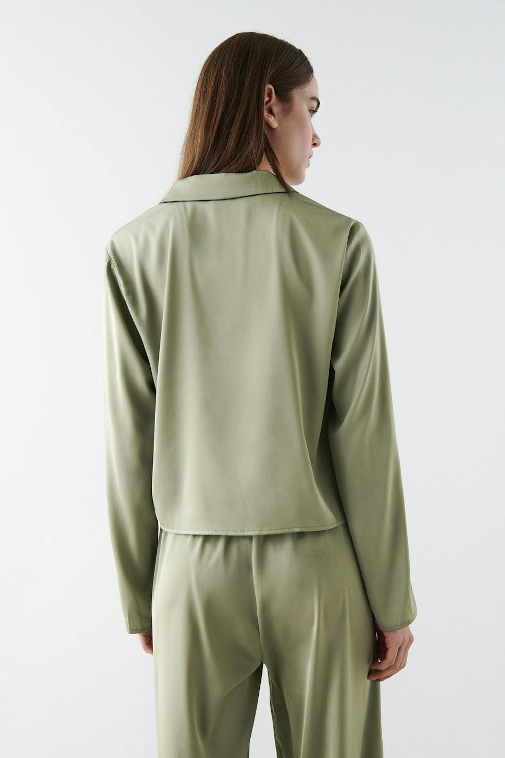 Satiininen pyjamapaita normaalilla istuvuudella. Paita on vihreä ja siinä on napituslista edessä. Siinä on klassinen paidan kaulus käänteillä ja hieman lyhempi pituus.