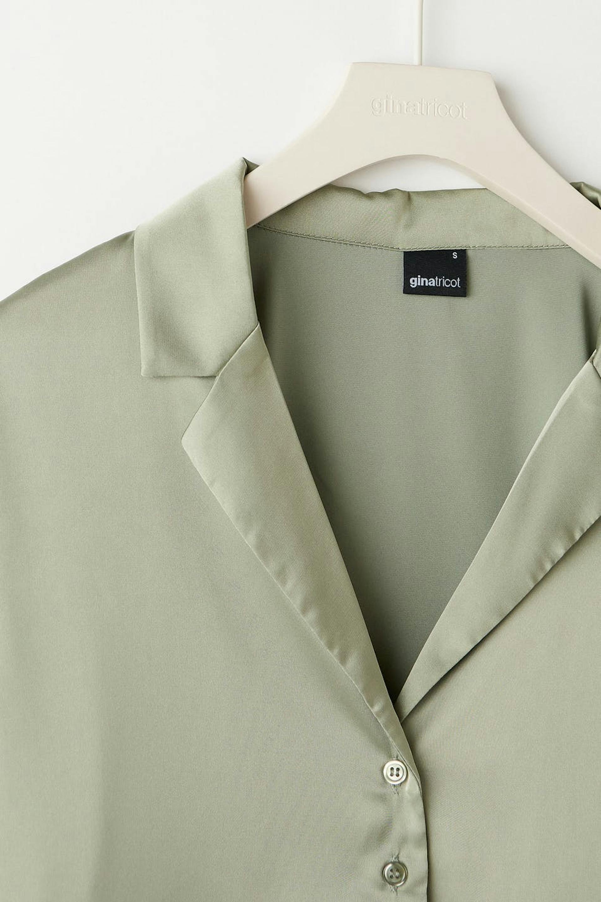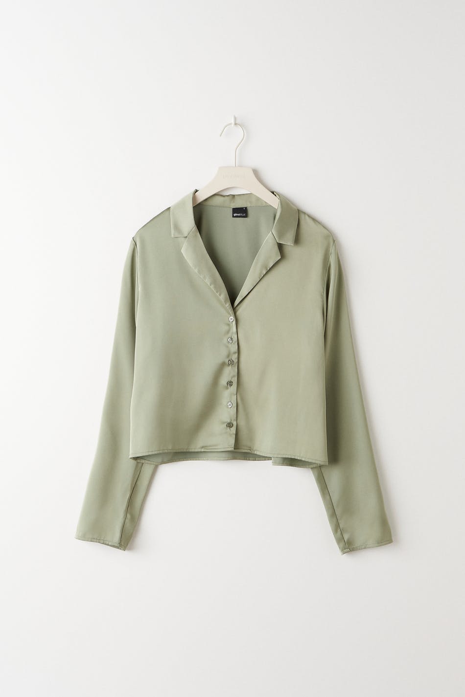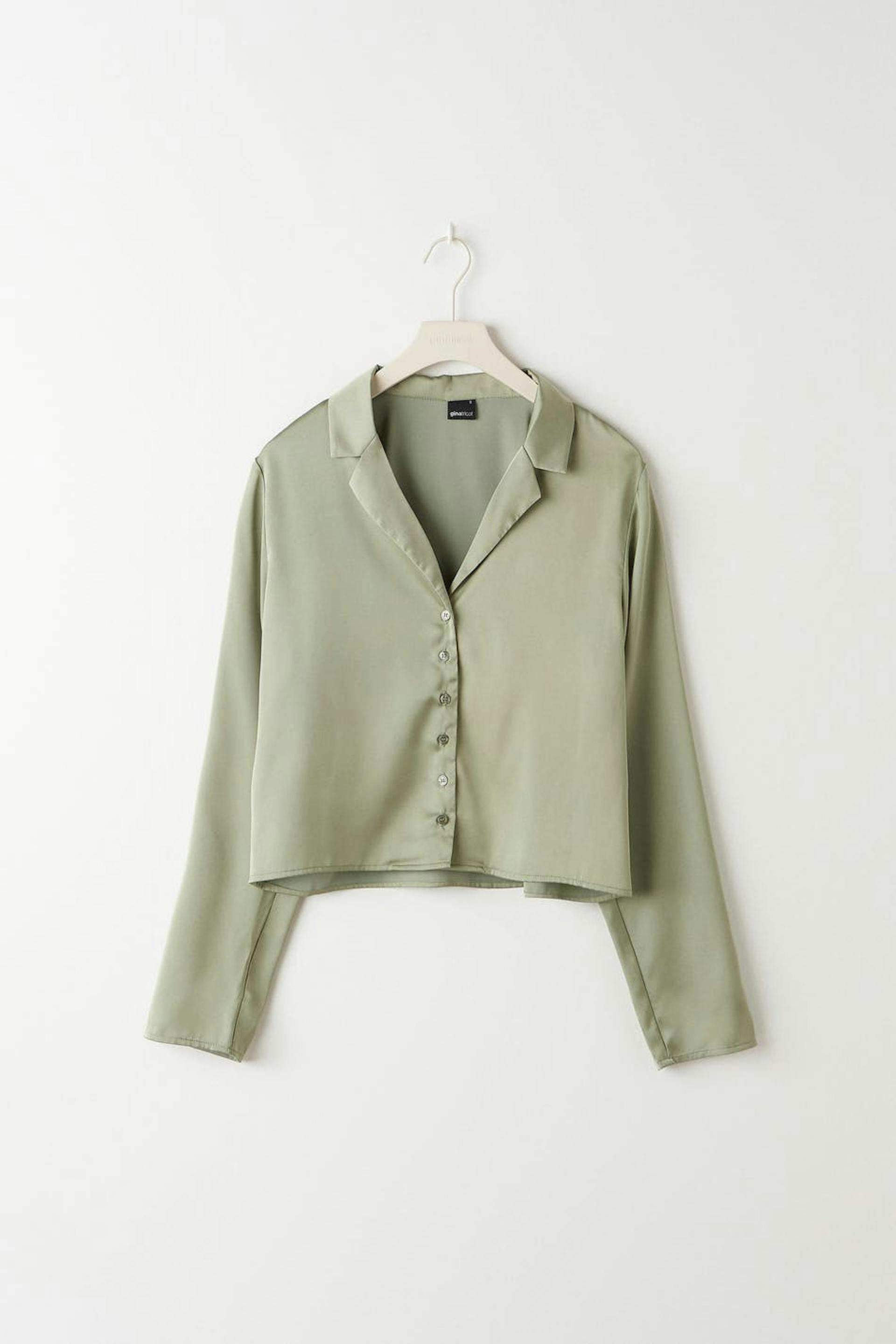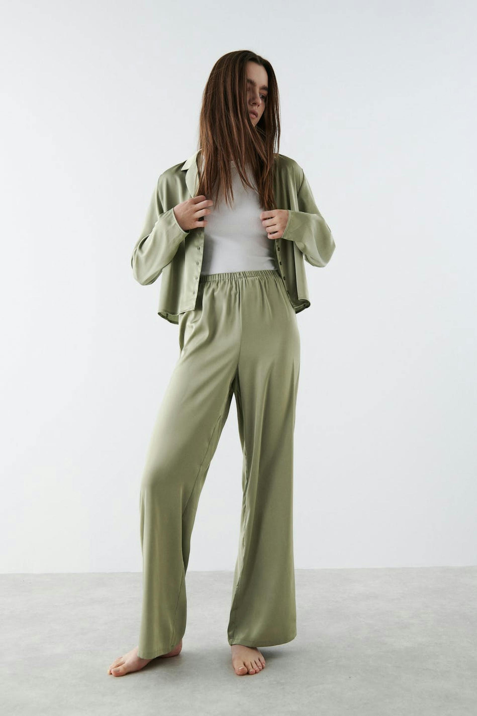 Satiininen pyjamapaita normaalilla istuvuudella. Paita on vihreä ja siinä on napituslista edessä. Siinä on klassinen paidan kaulus käänteillä ja hieman lyhempi pituus.