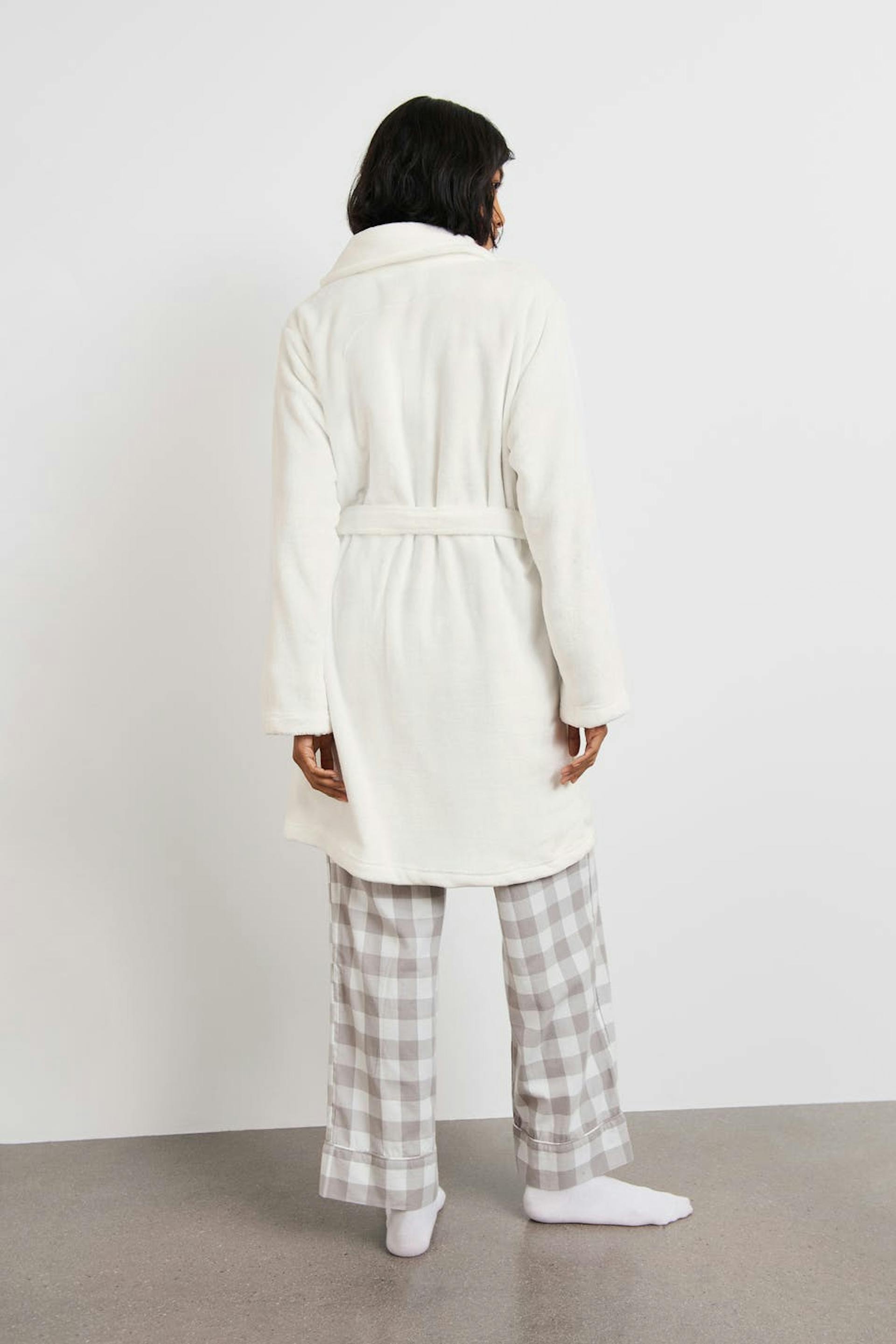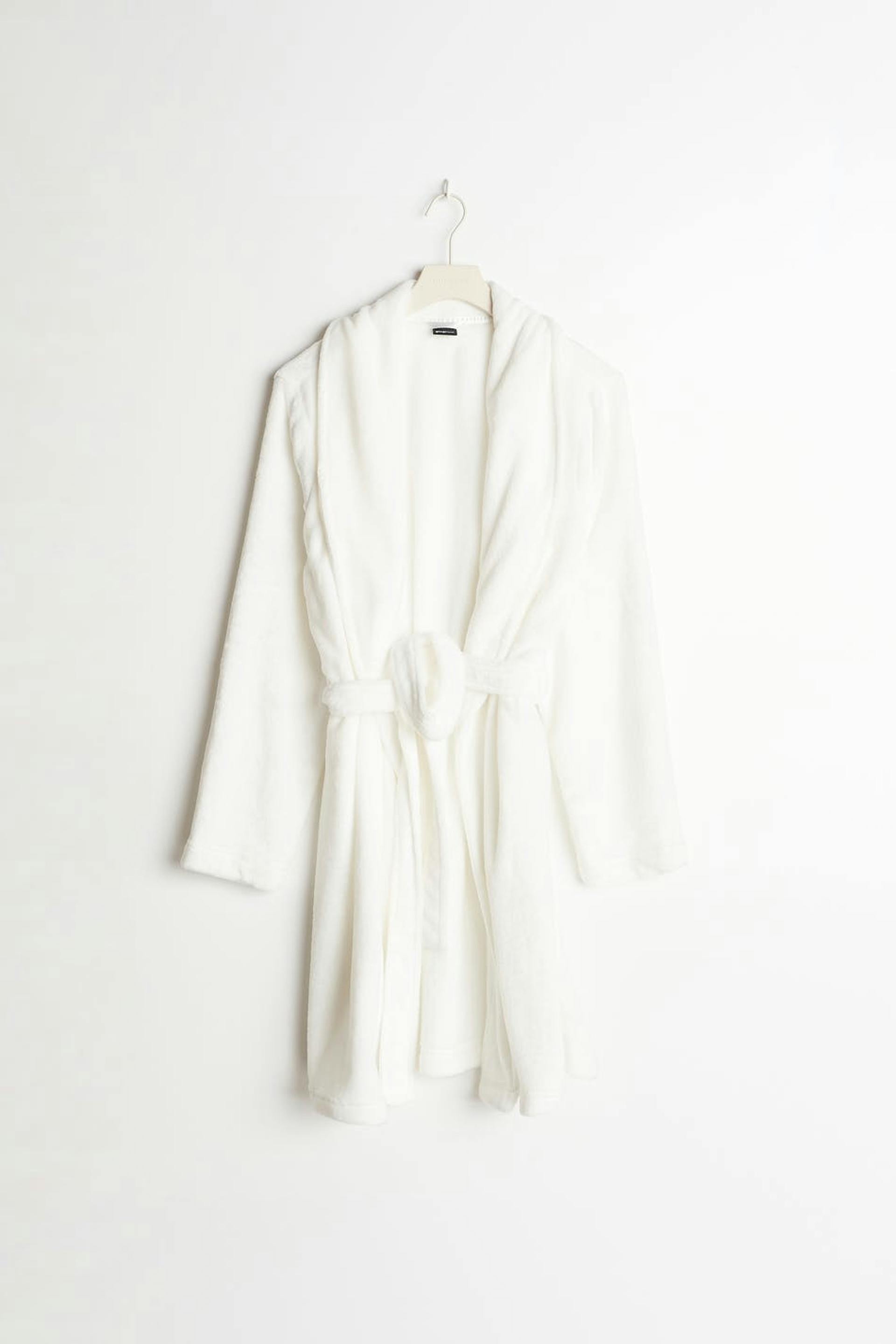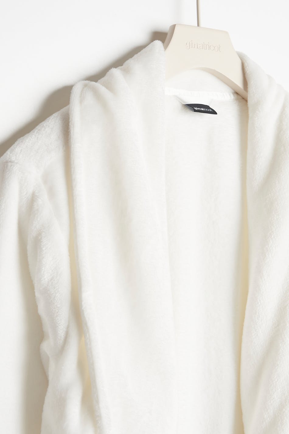 Lyhyt aamutakki sidottavalla hihnalla vyötäröllä. Aamutakki on valkoinen ja siinä on pehmeä laatu fleeceestä. Helposti syttyvää materiaalia.
