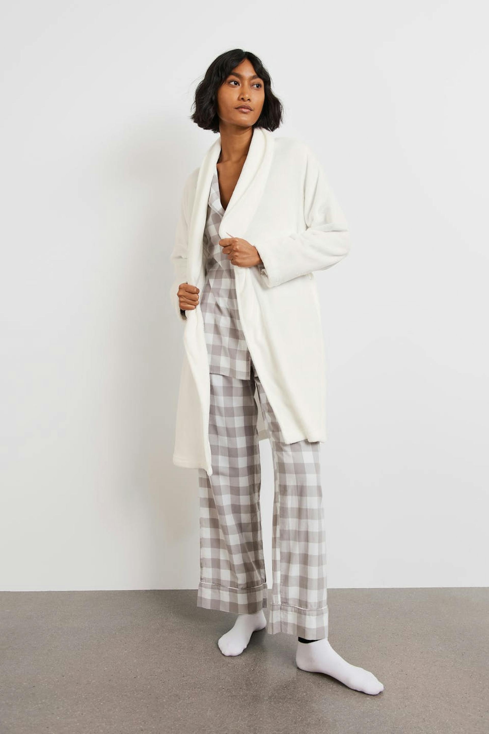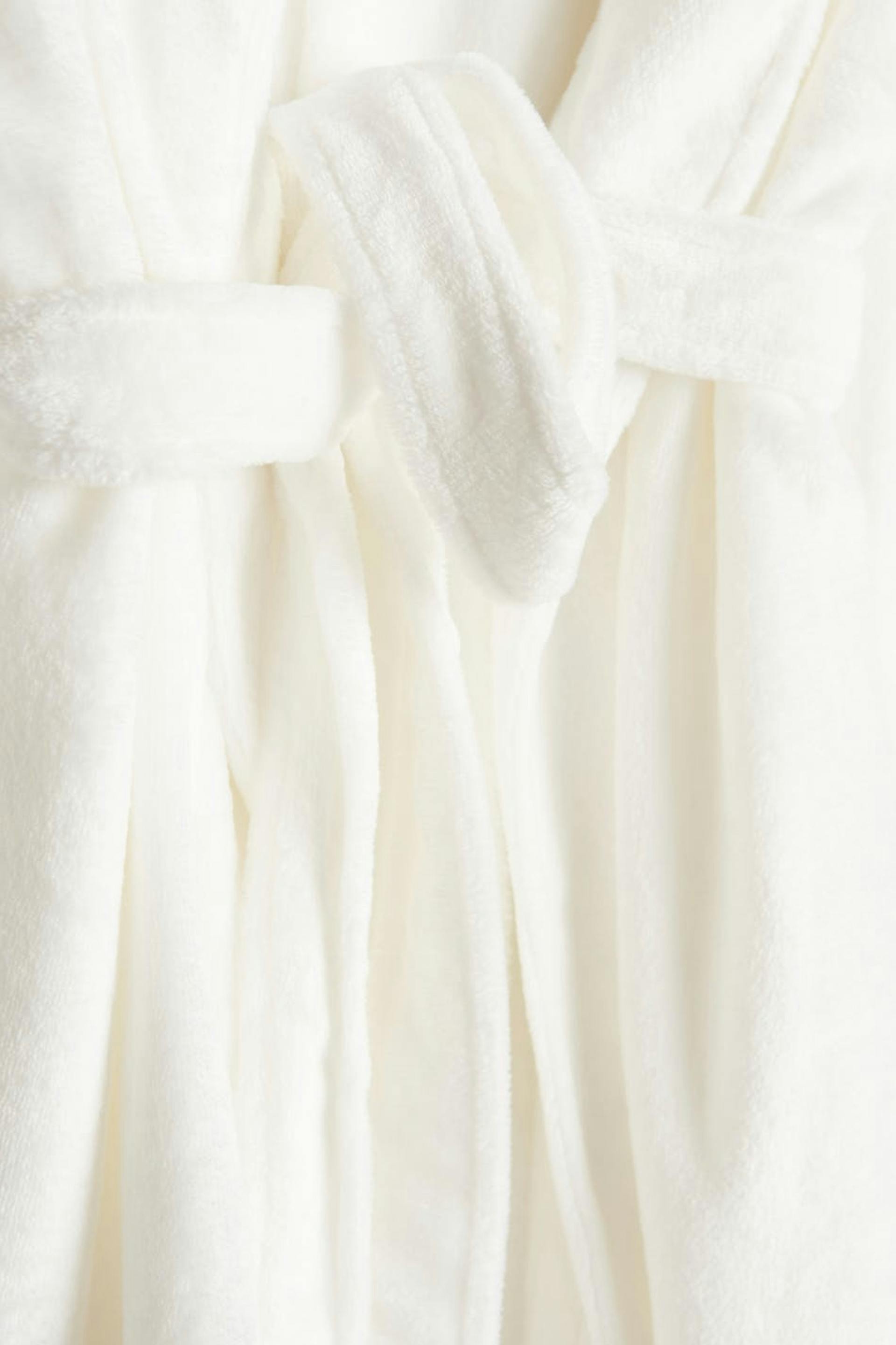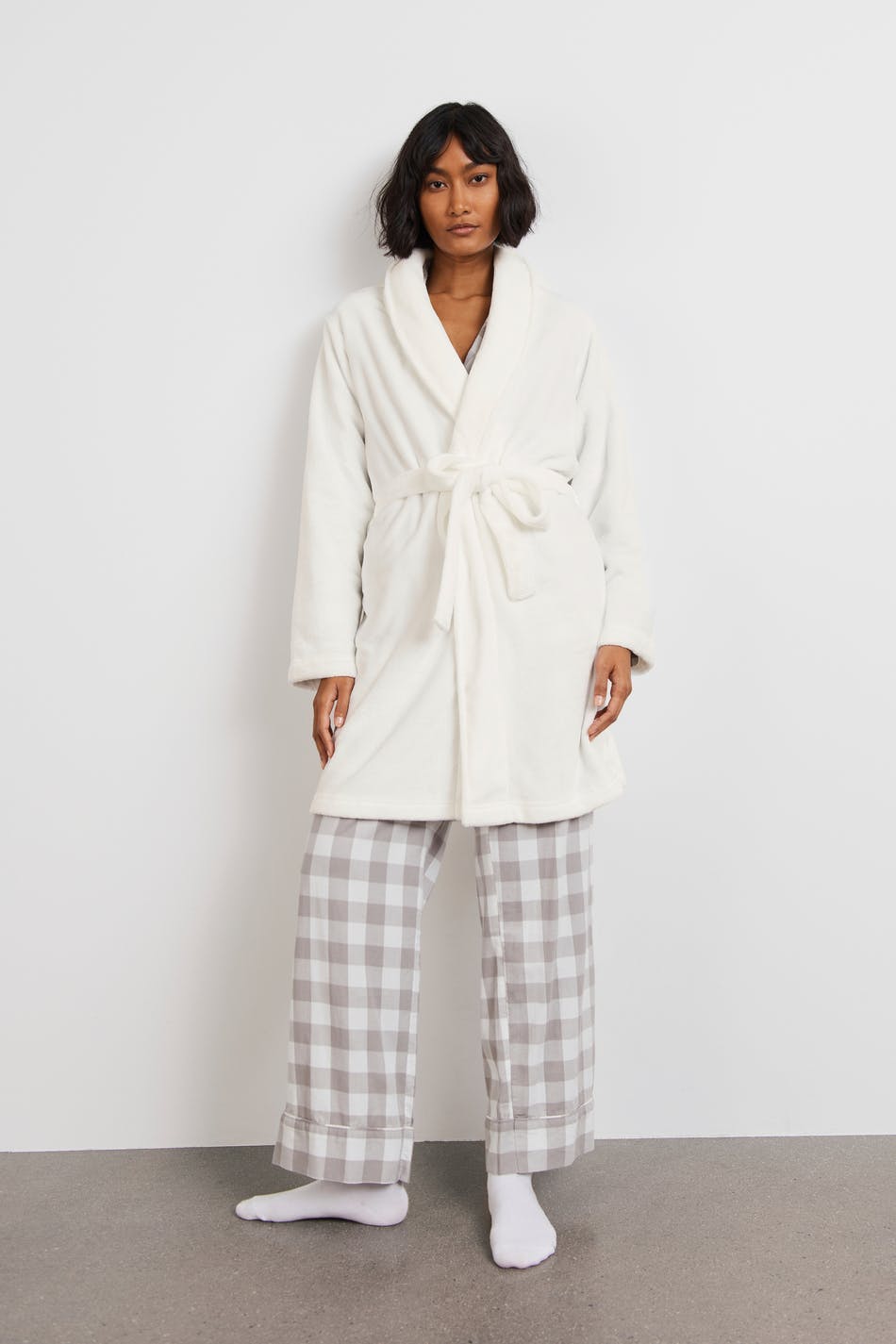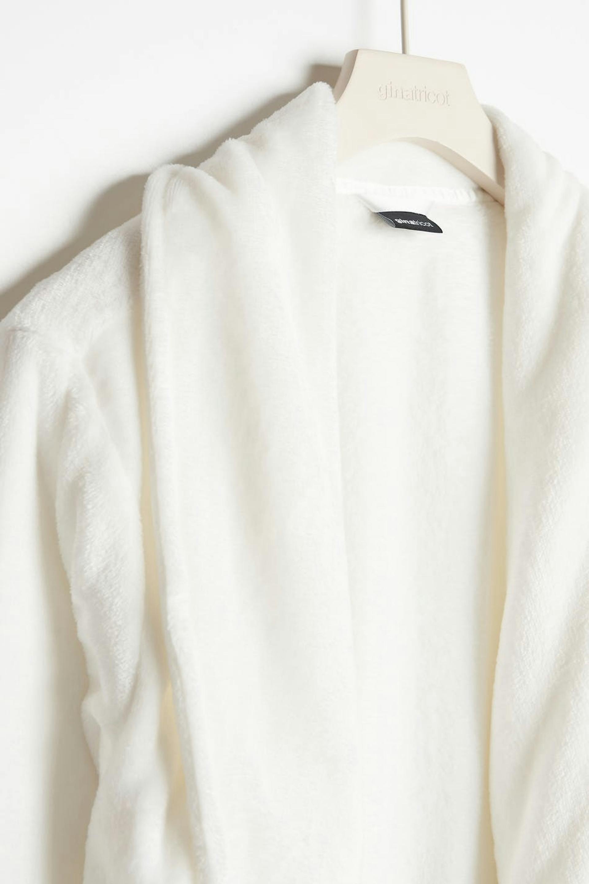 Lyhyt aamutakki sidottavalla hihnalla vyötäröllä. Aamutakki on valkoinen ja siinä on pehmeä laatu fleeceestä. Helposti syttyvää materiaalia.