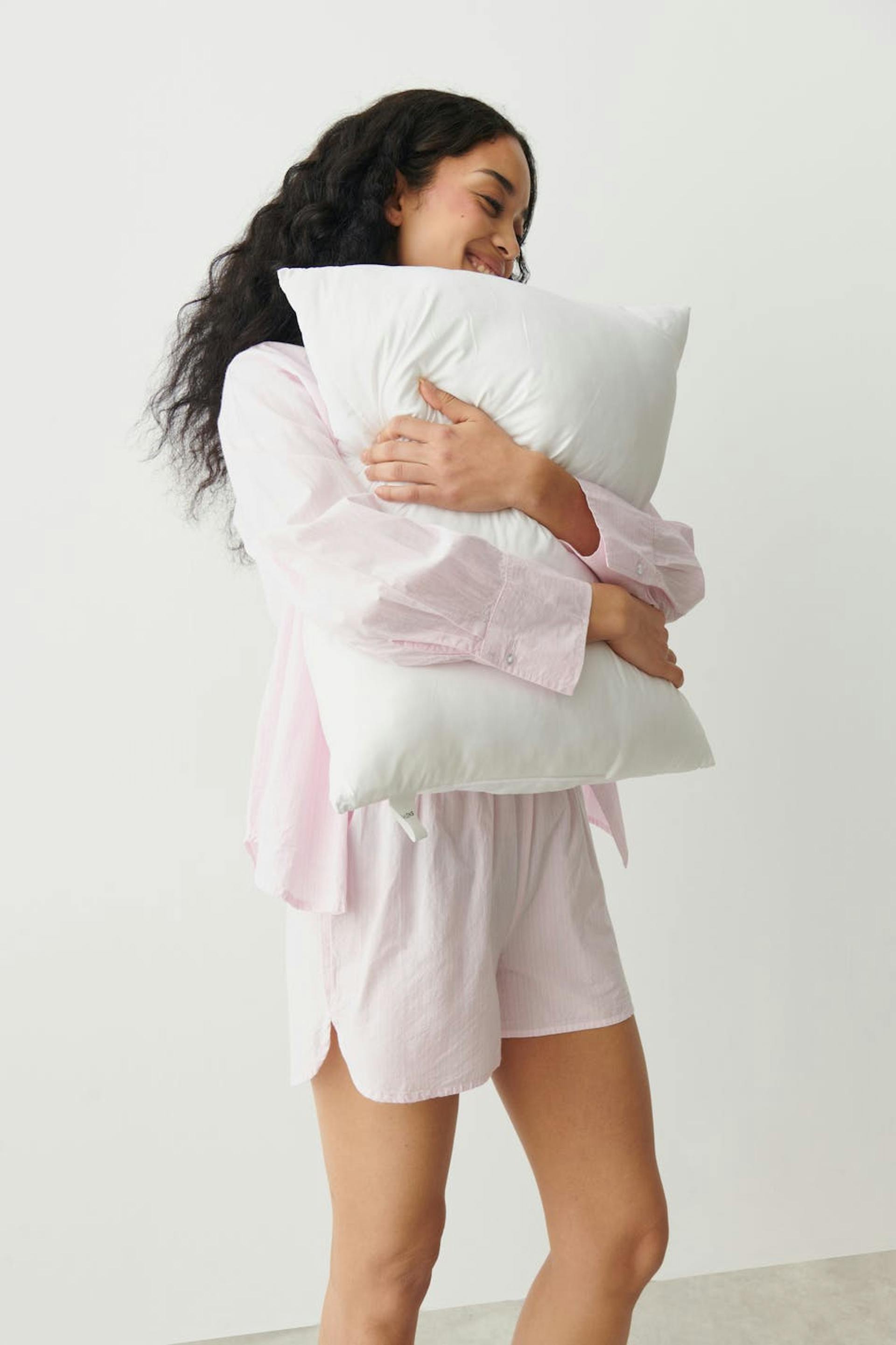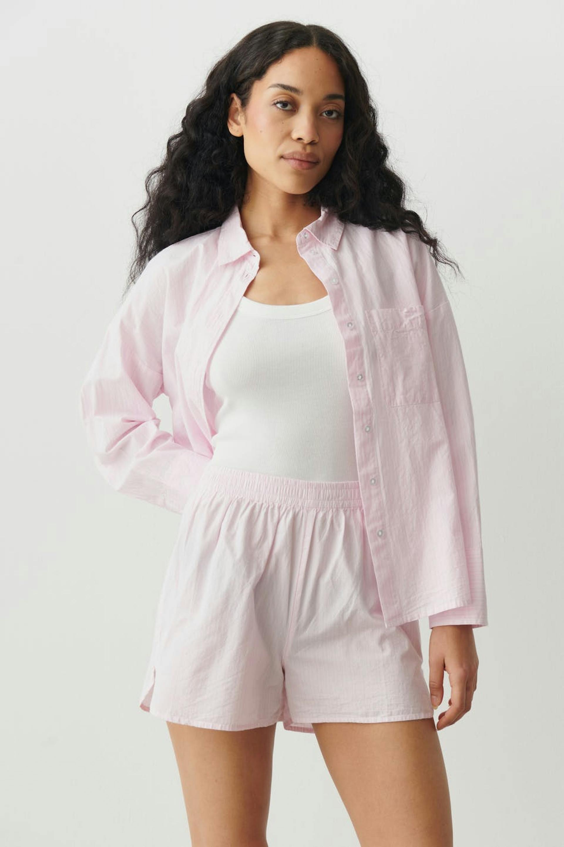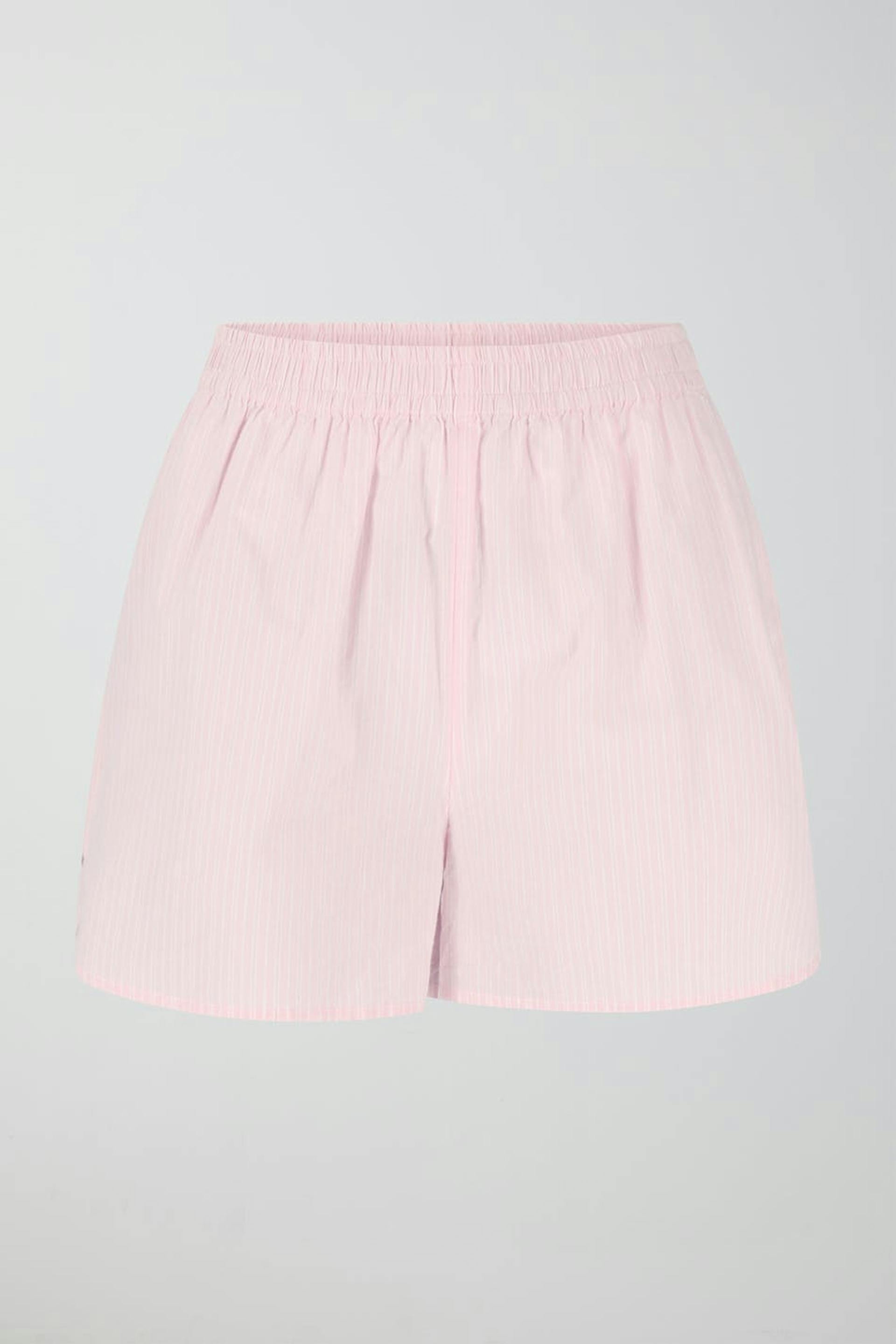 Raidalliset pyjamashortsit pehmeällä, rapealla puuvillalaadulla. Shortsit ovat pinkkejä ja niissä on kuminauha vyötäröllä.