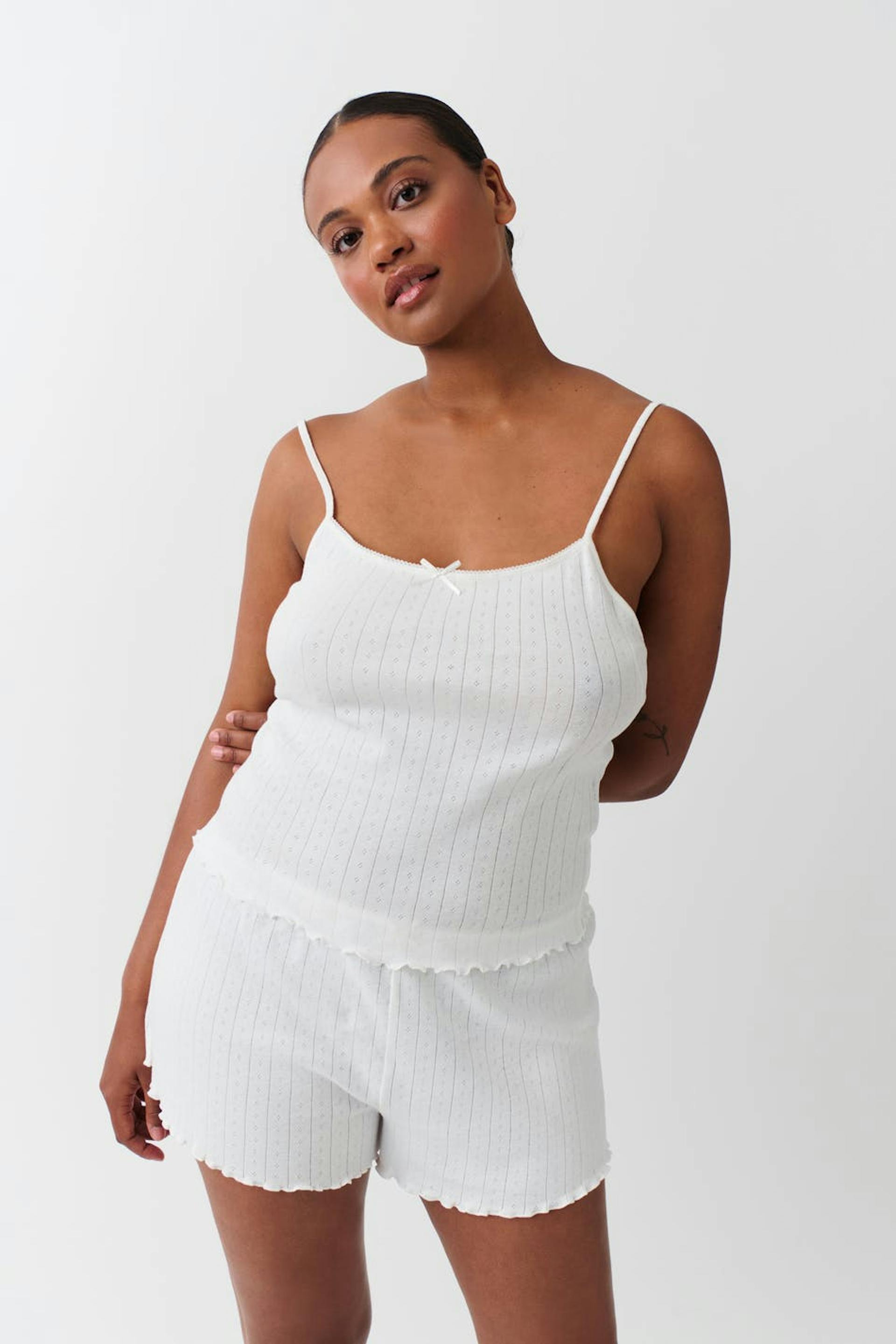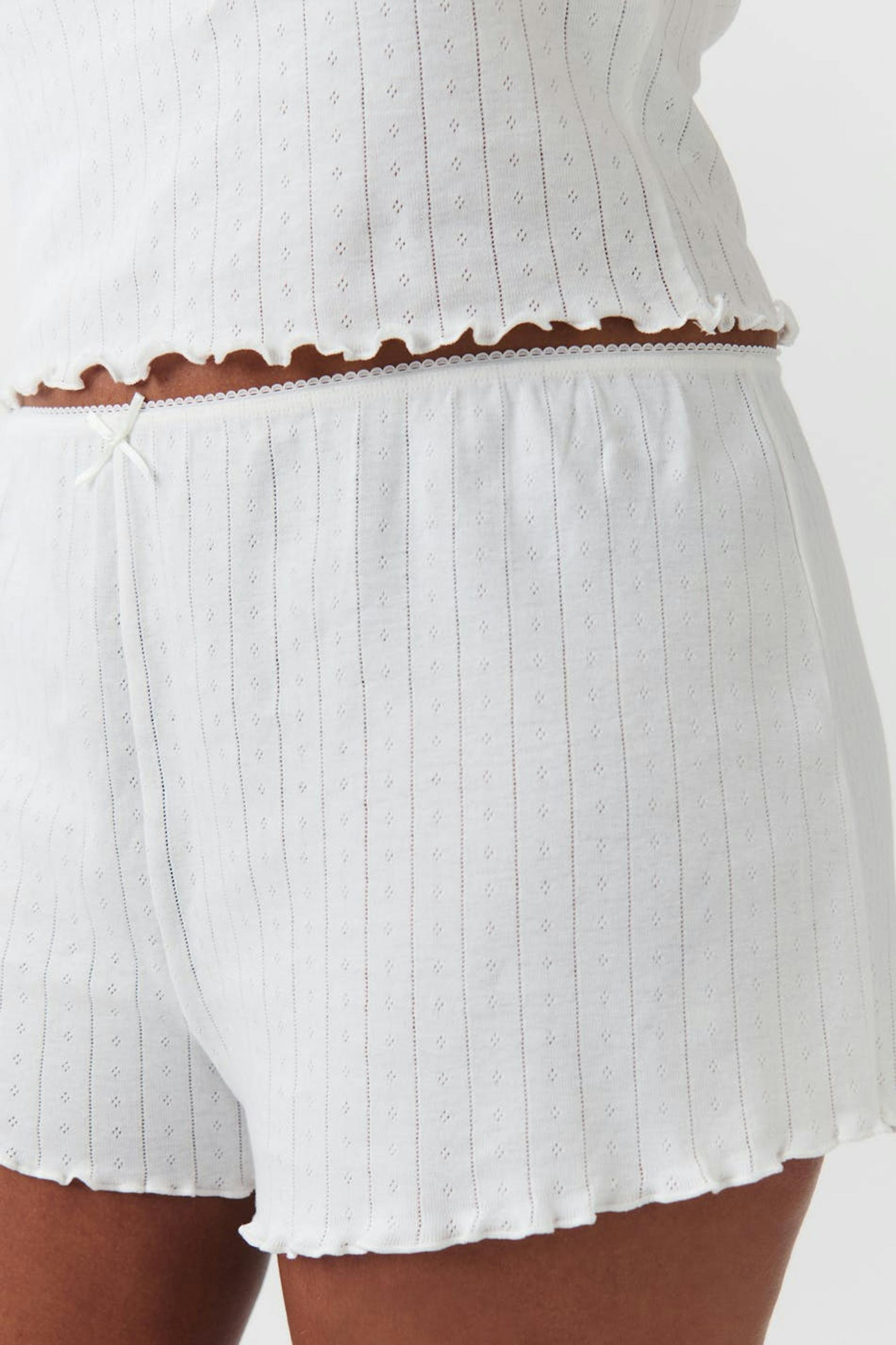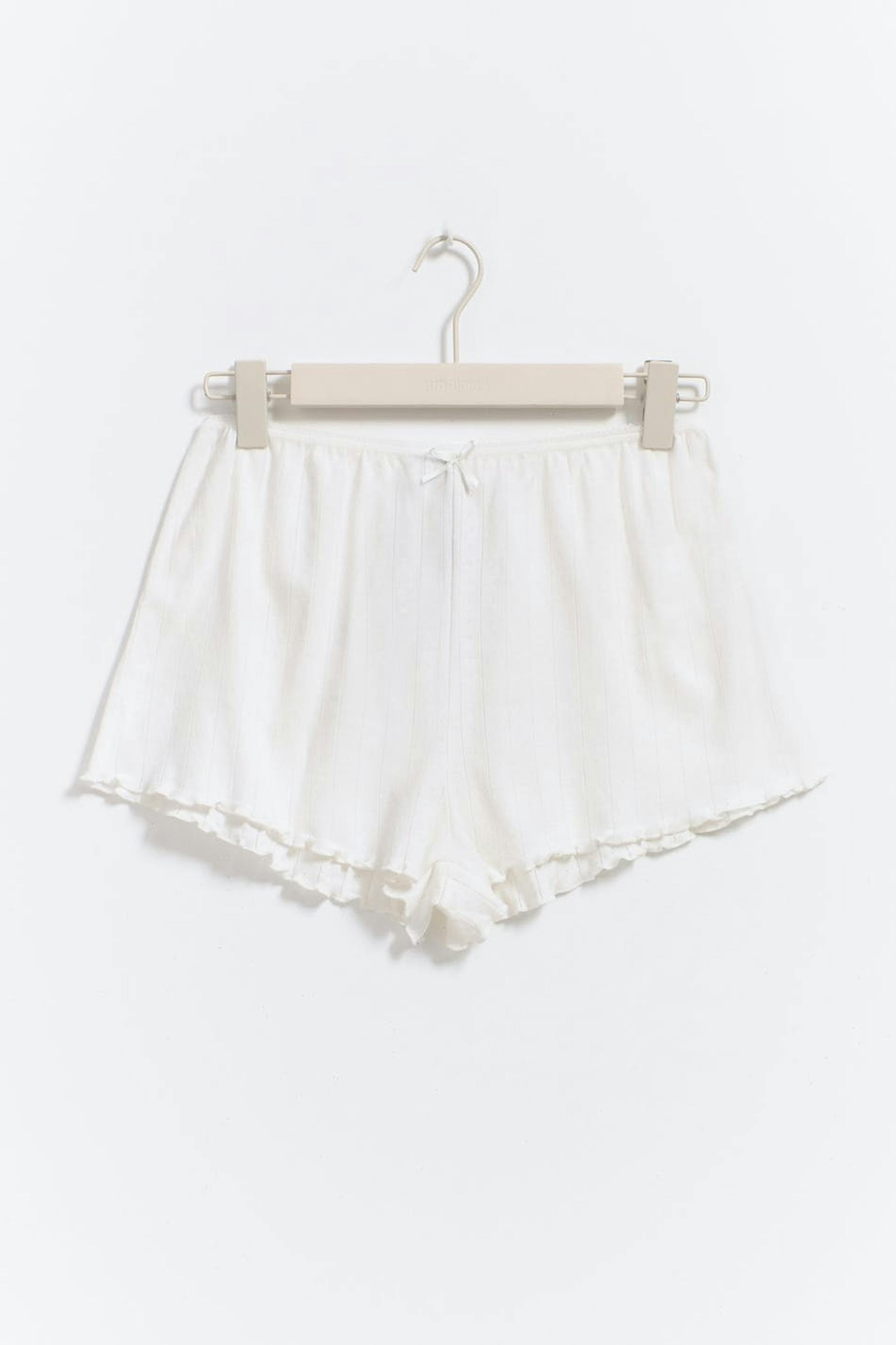 Pointelleneulotut pyjamashortsit rusettiyksityiskohdalla edessä. Shortsit ovat valkoisia ja lyhyitä ja niissä on kuminauha vyötäröllä. Niissä on overlock-helma.