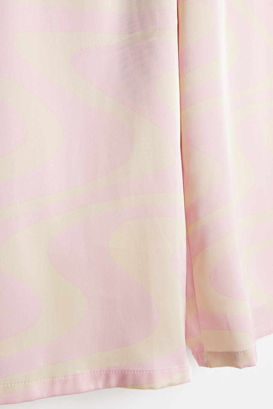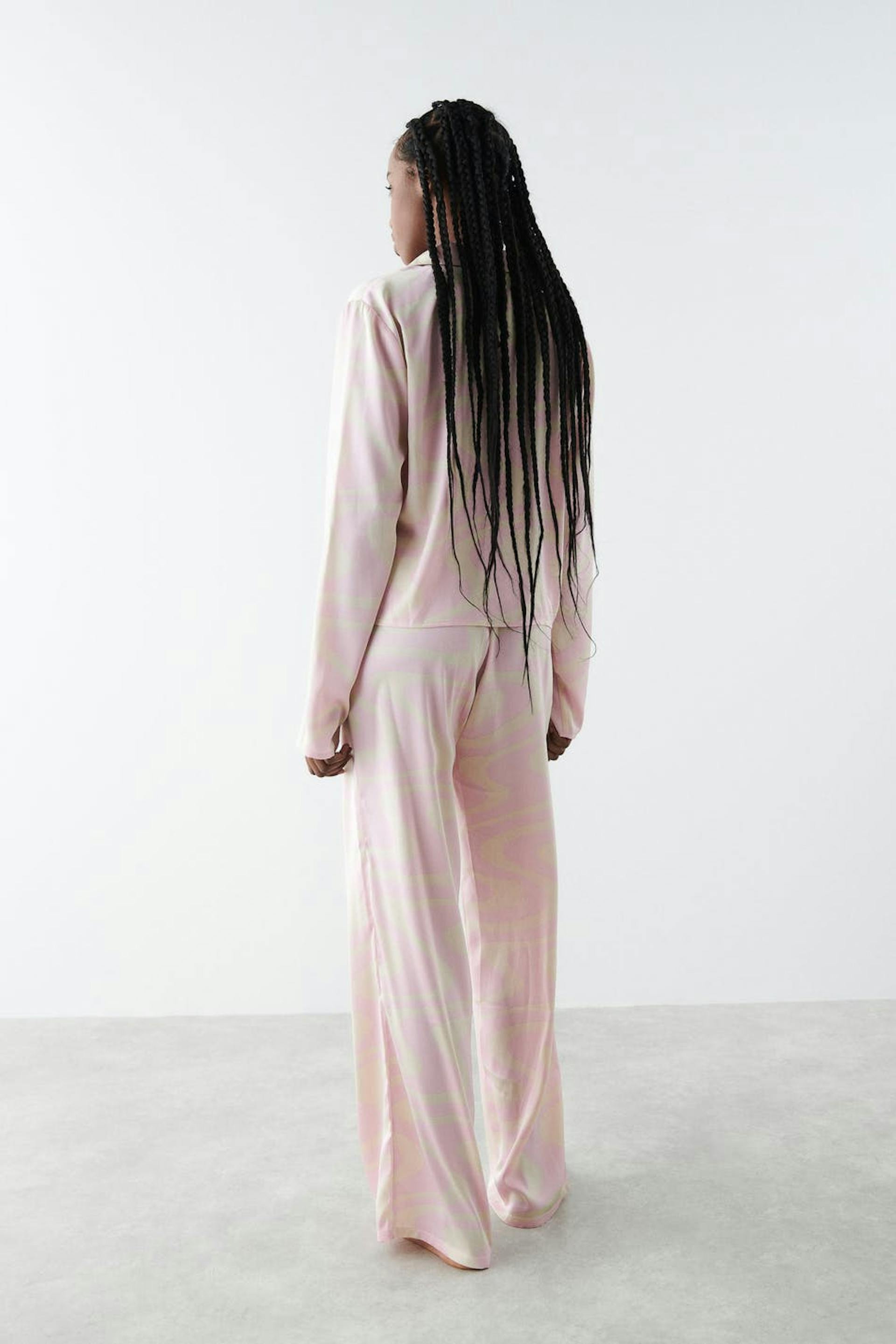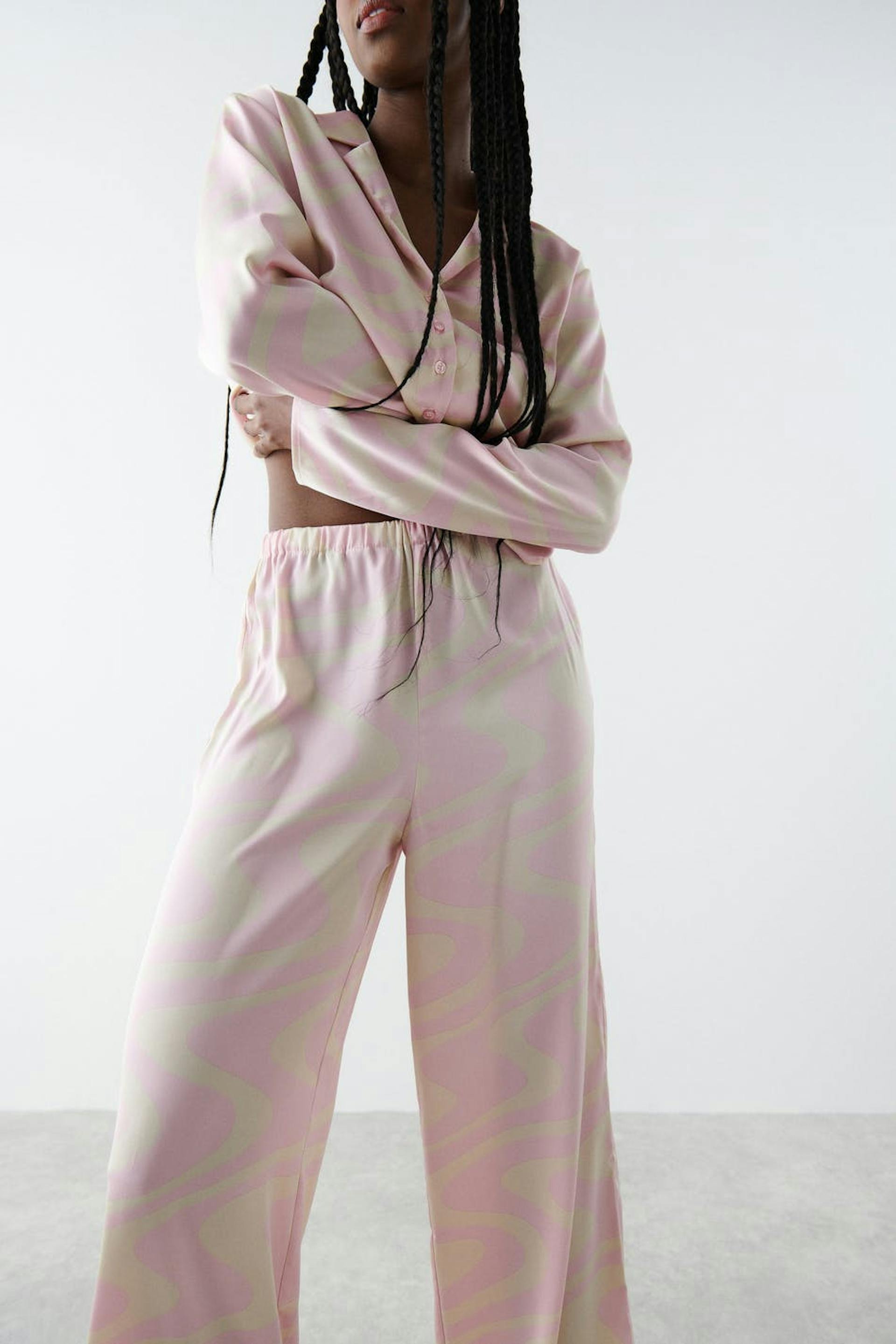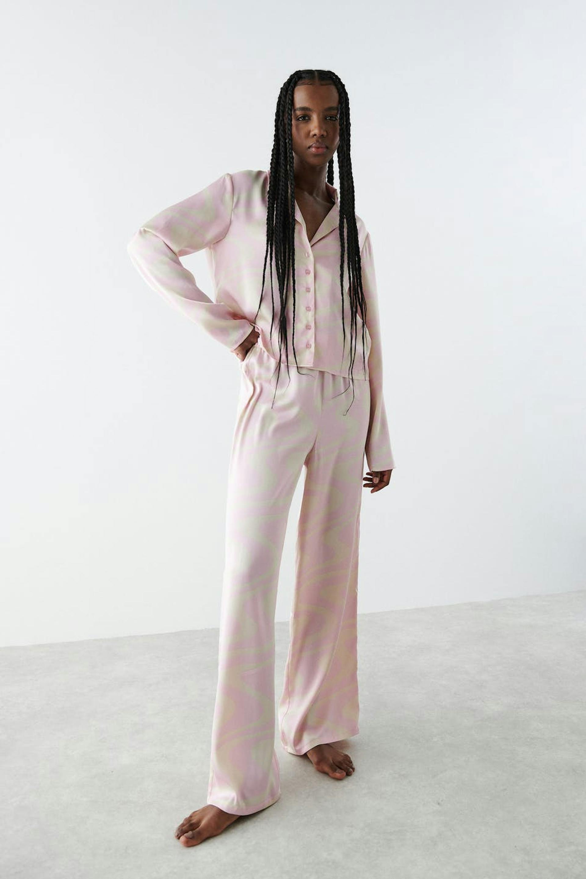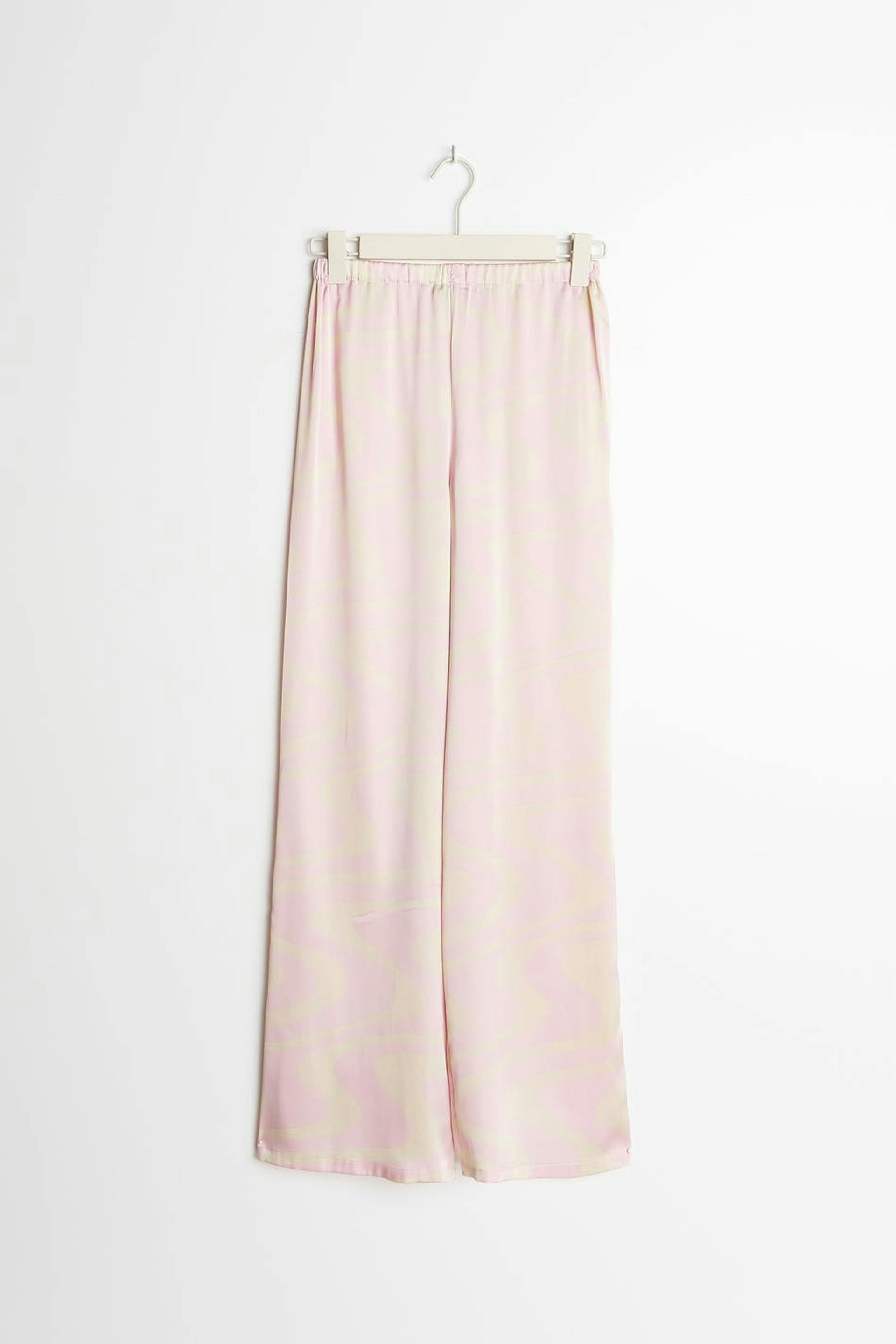 Pehmeät pyjamahousut kudotulla laadulla satiinista. Pyjamahousut ovat pinkkejä ja niissä on suorat lahkeet kuminauhalla vyötäröllä.