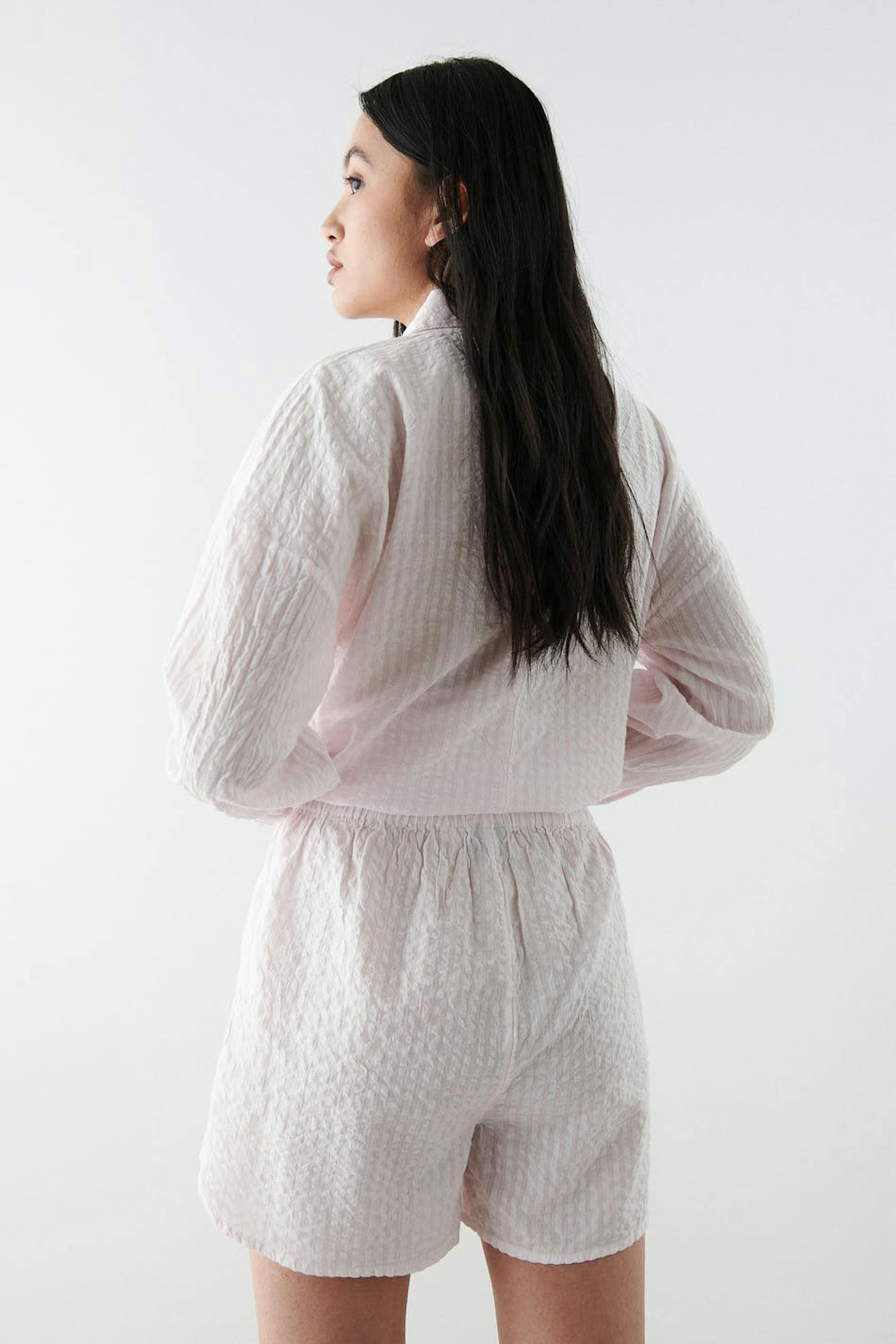 Lyhyet pyjamashortsit normaalilla leikkauksella. Shortsit ovat pinkkejä ja niissä on pehmeä seersucker-laatu. Niissä on kuminauha vyötäröllä ja halkio sivuilla.
