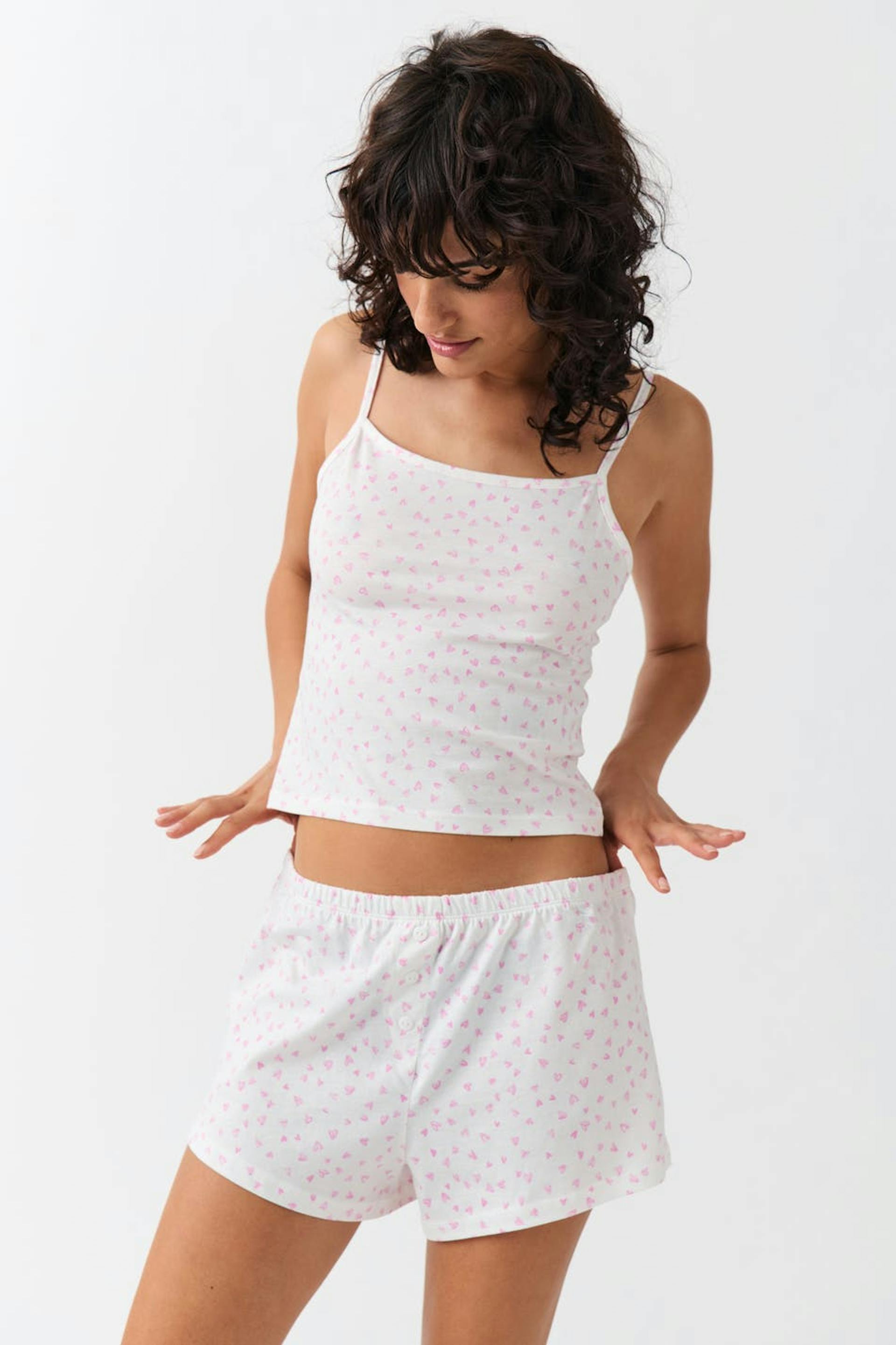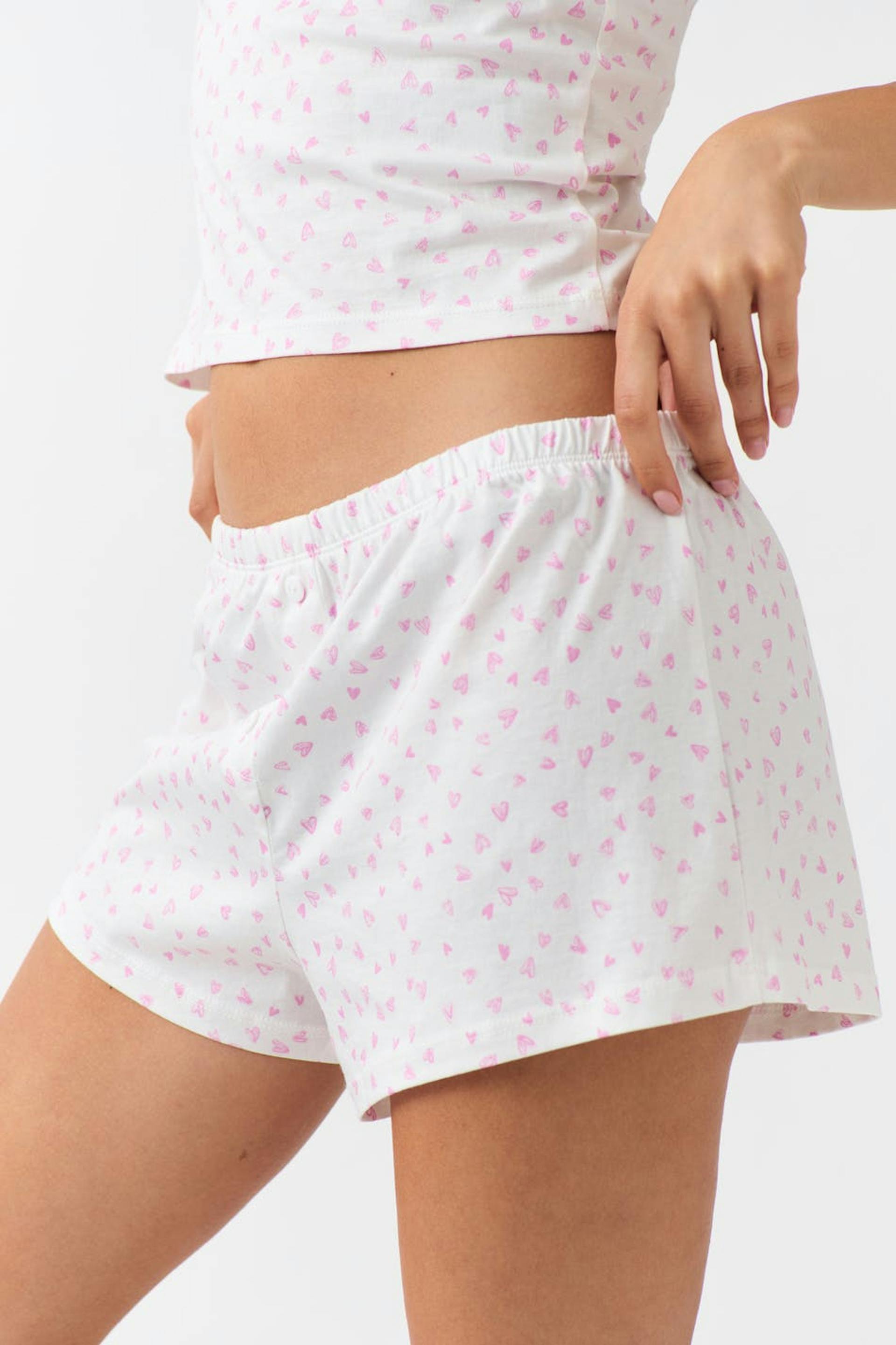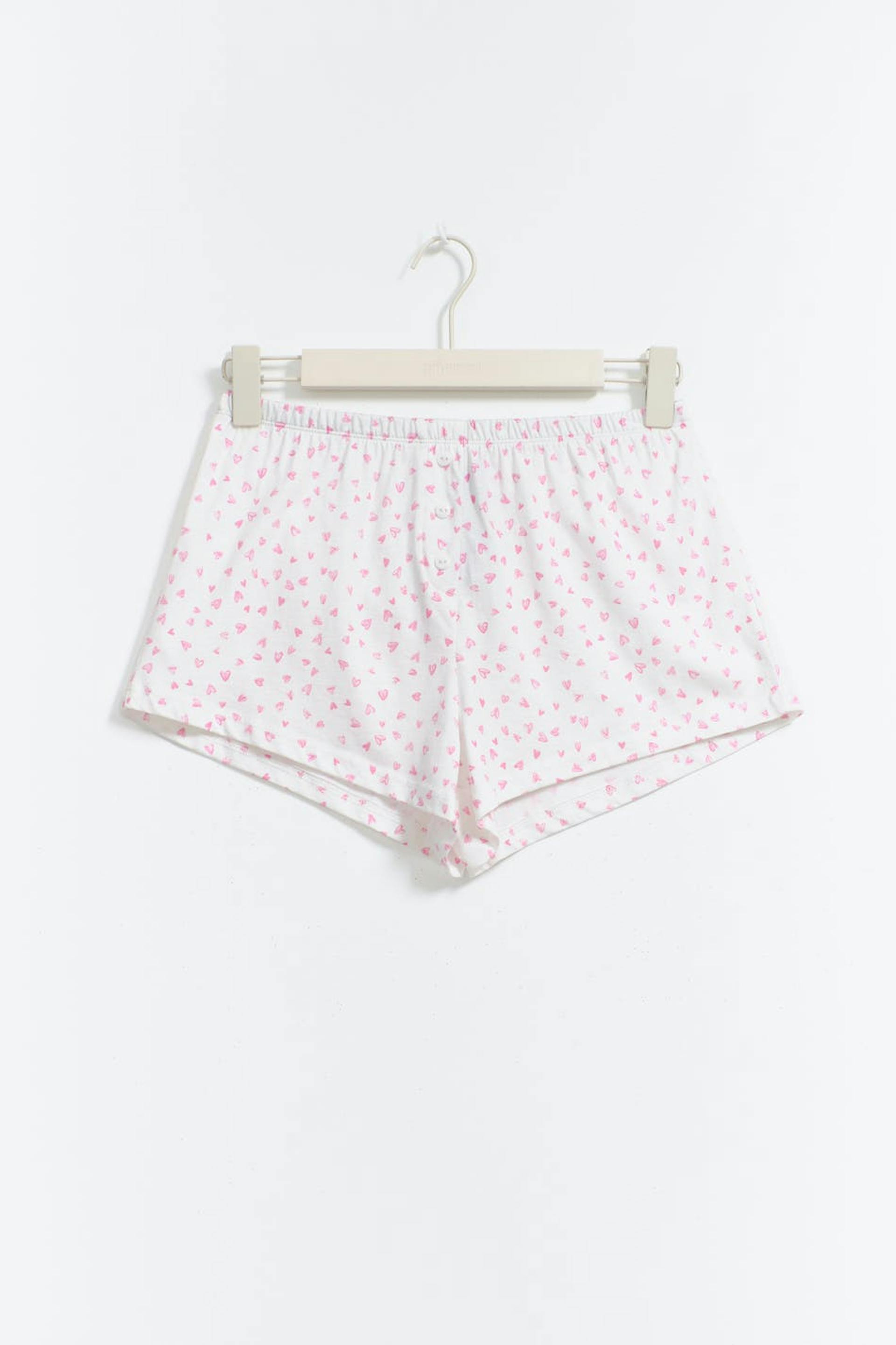 Lyhyet pyjamashortsit pienillä sydäneillä. Shortsit ovat pinkkejä ja niissä on koristeelliset napit edessä. Niissä on pehmeä laatu ja kuminauha vyötäröllä.