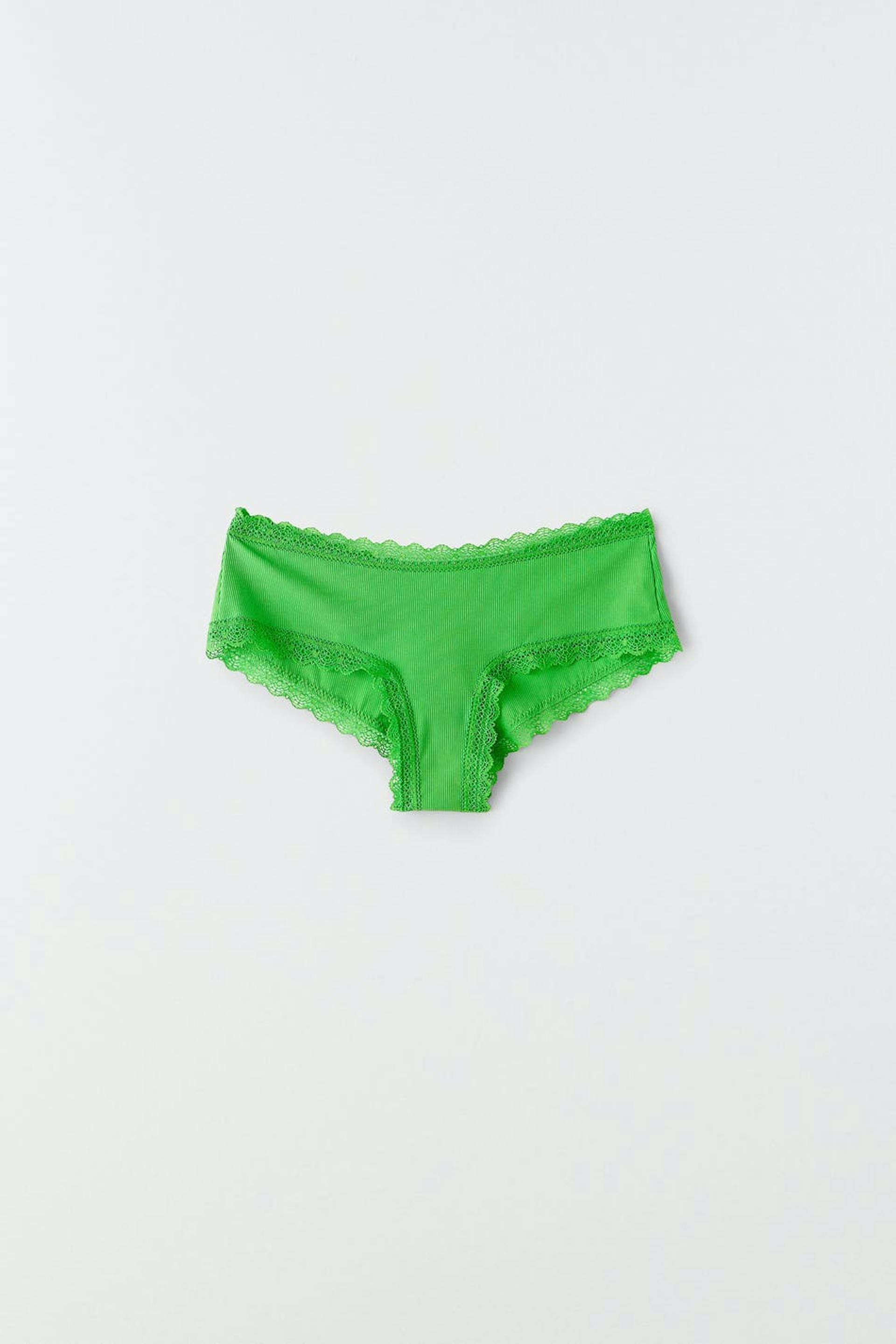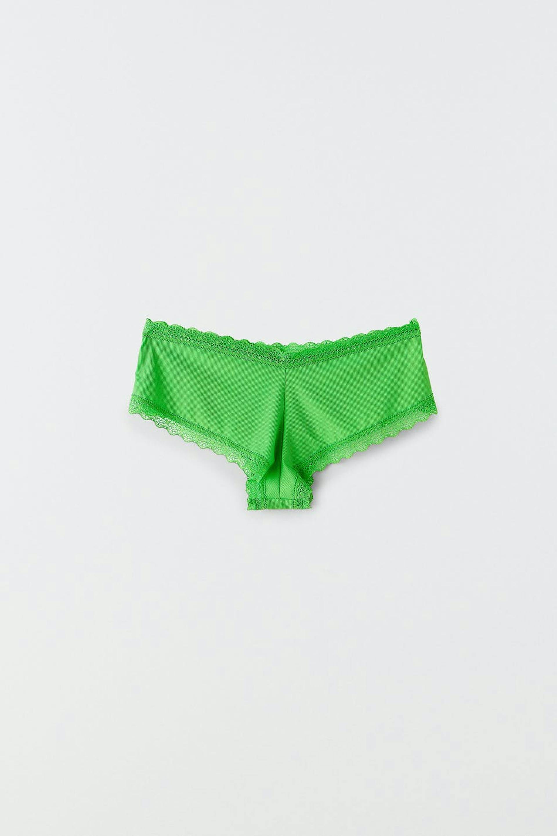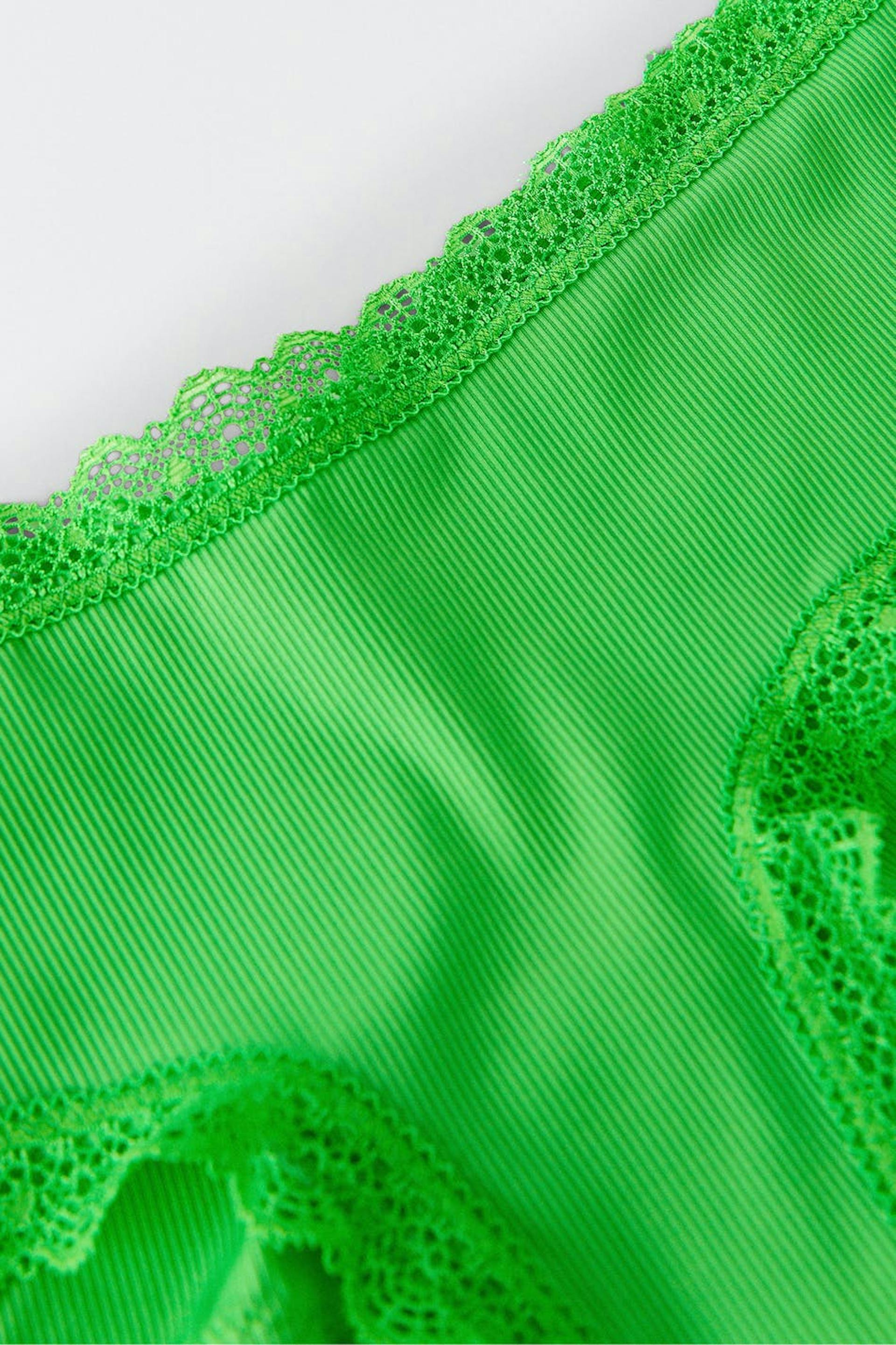 Pehmeät brasilialaiset alushousut pitsireunoilla. Brasilialaiset alushousut ovat vihreitä ja niissä on ribattu laatu mikrokuidusta.