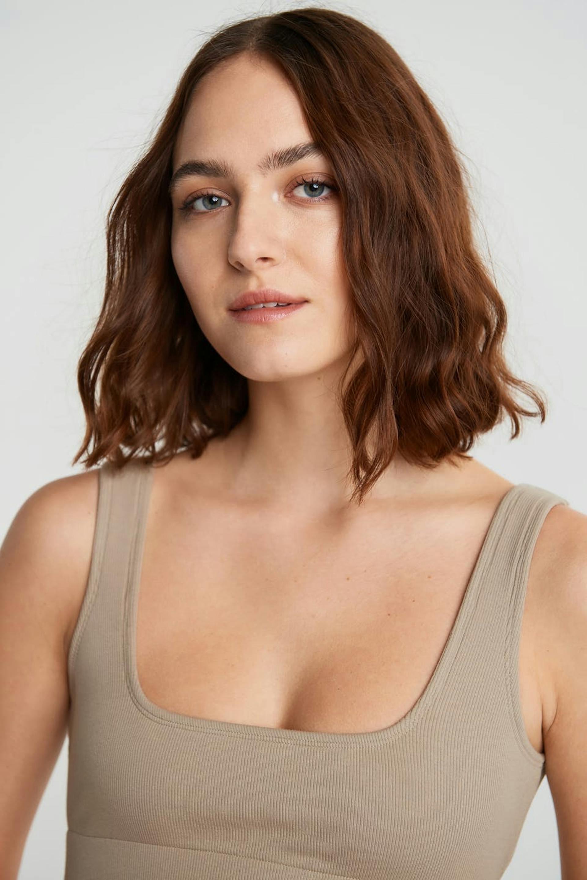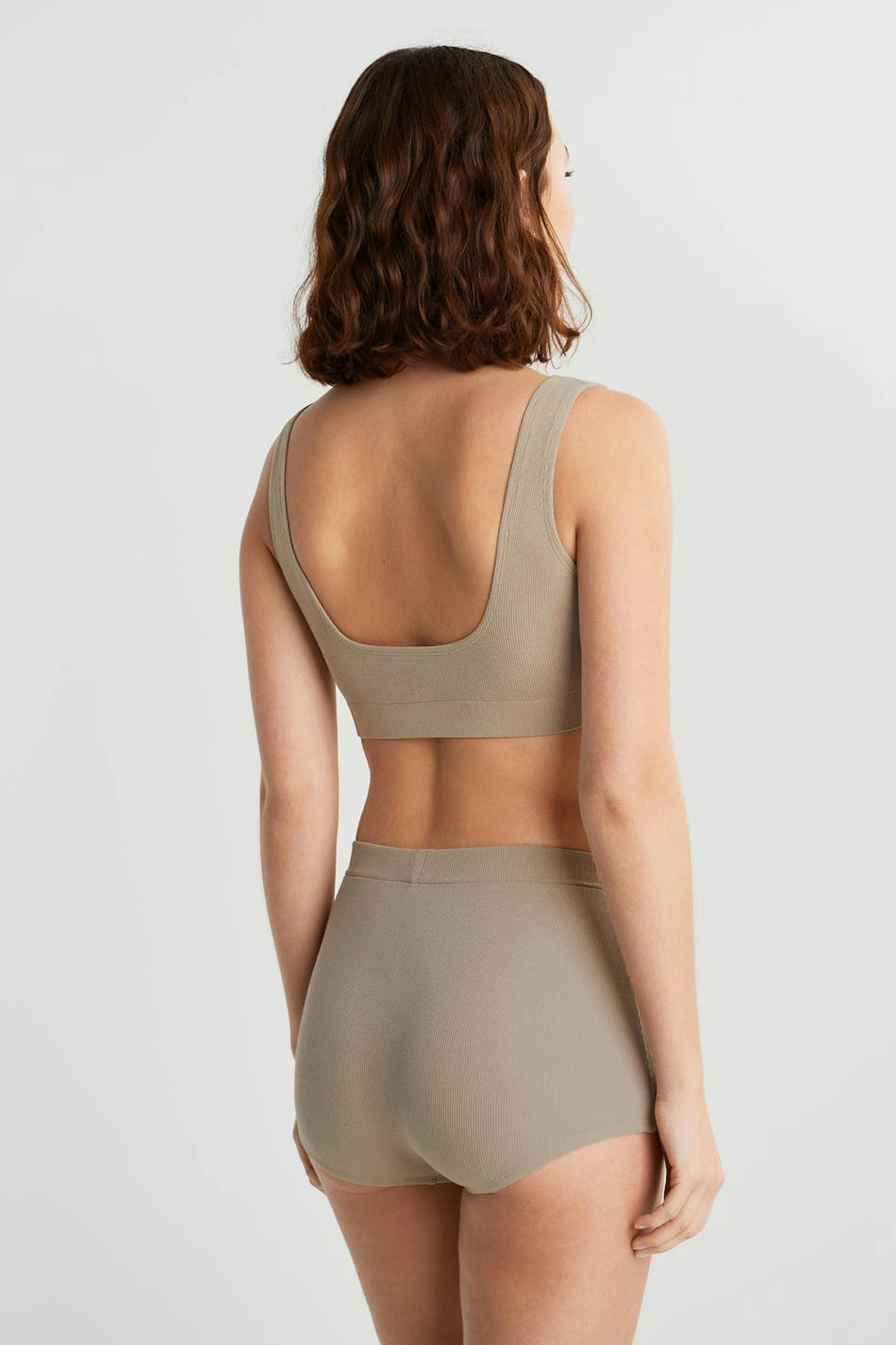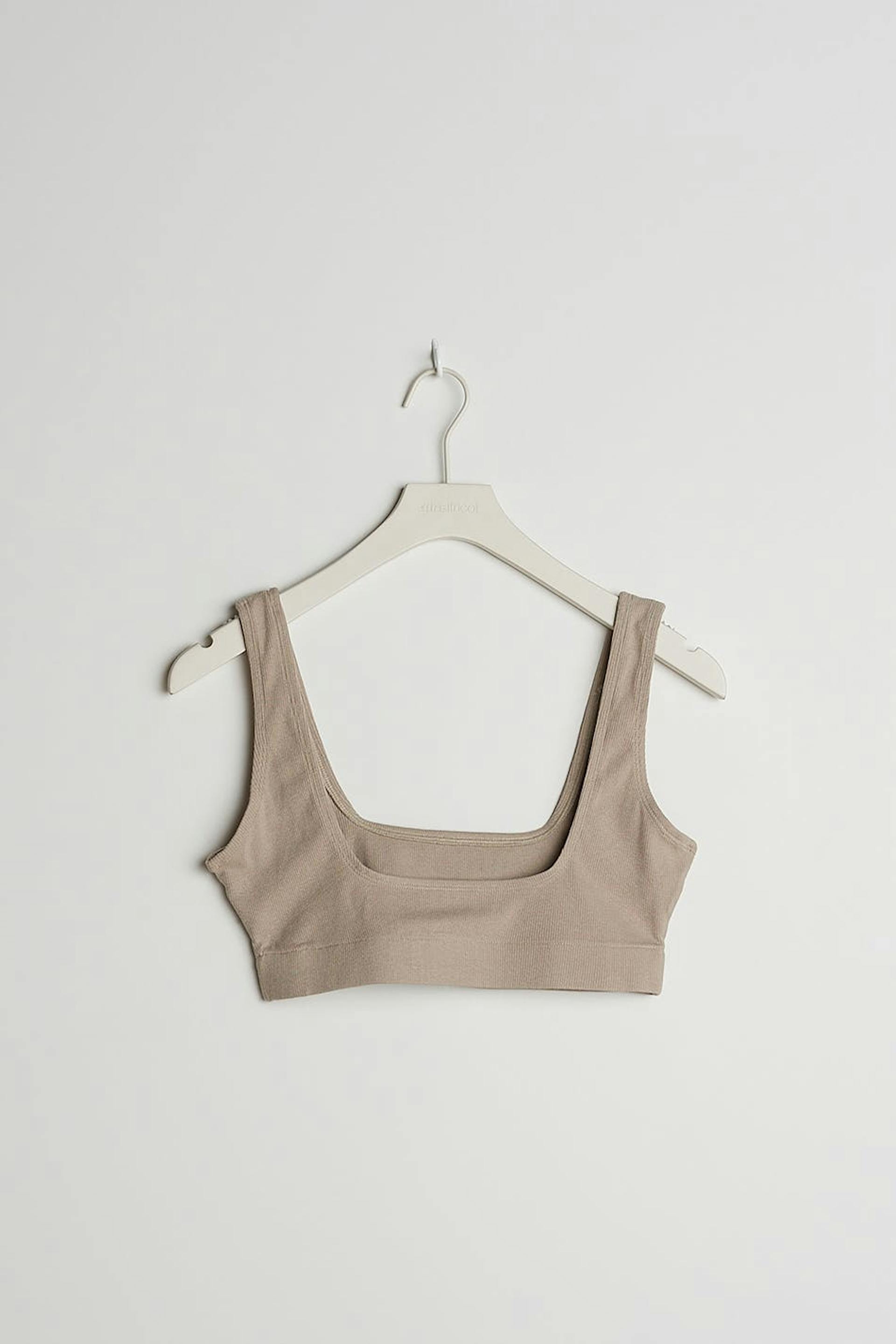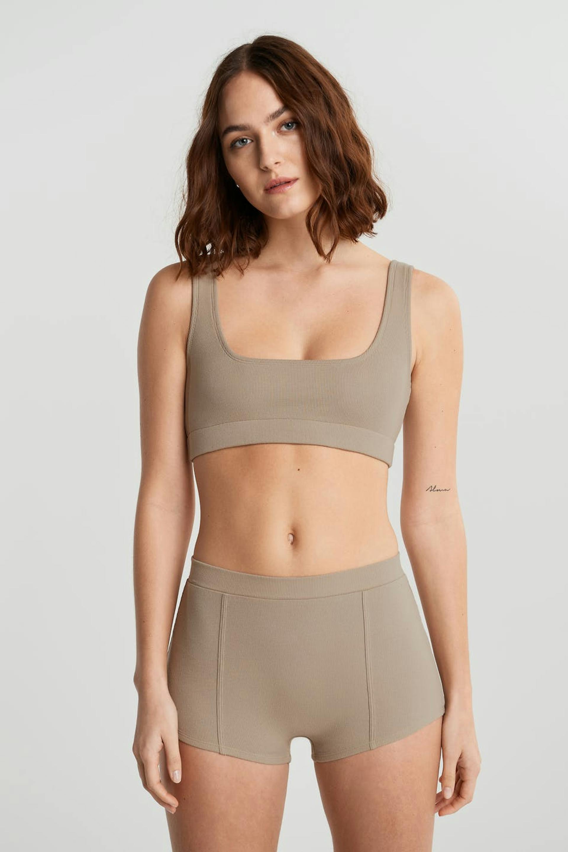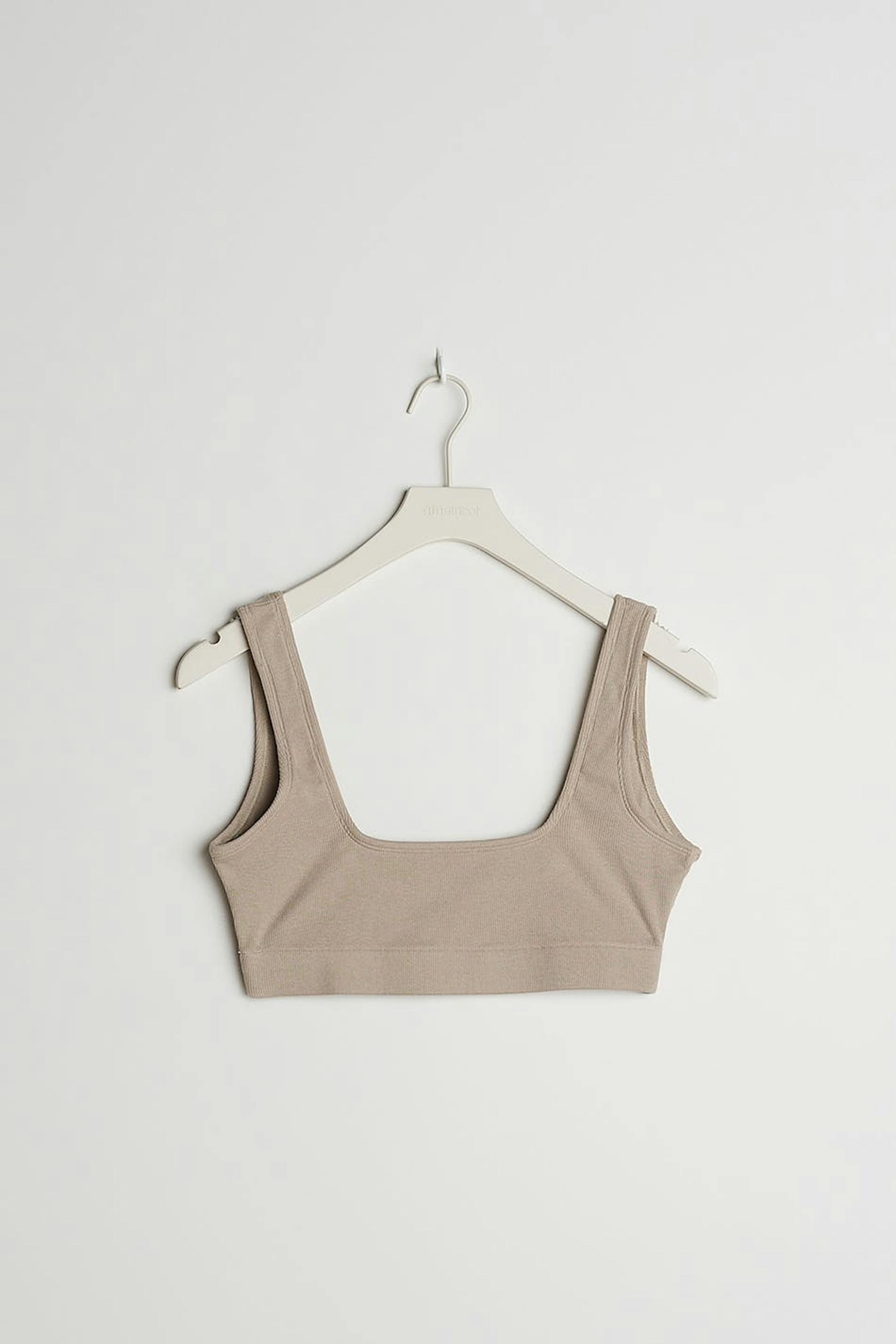 Resorimaiset rintaliivit. Rintaliivit ovat beigejä ja pehmeitä. Ne valmistetaan puuvillasta.