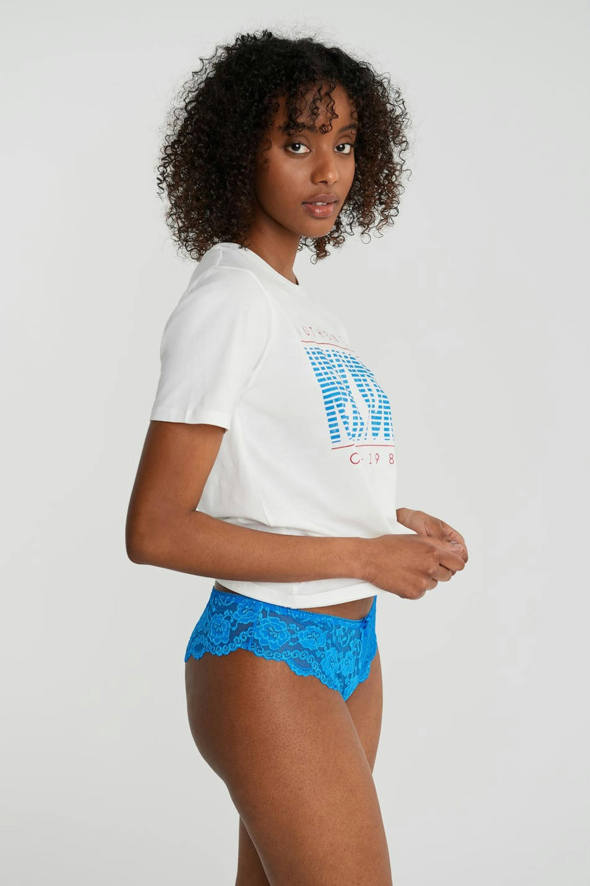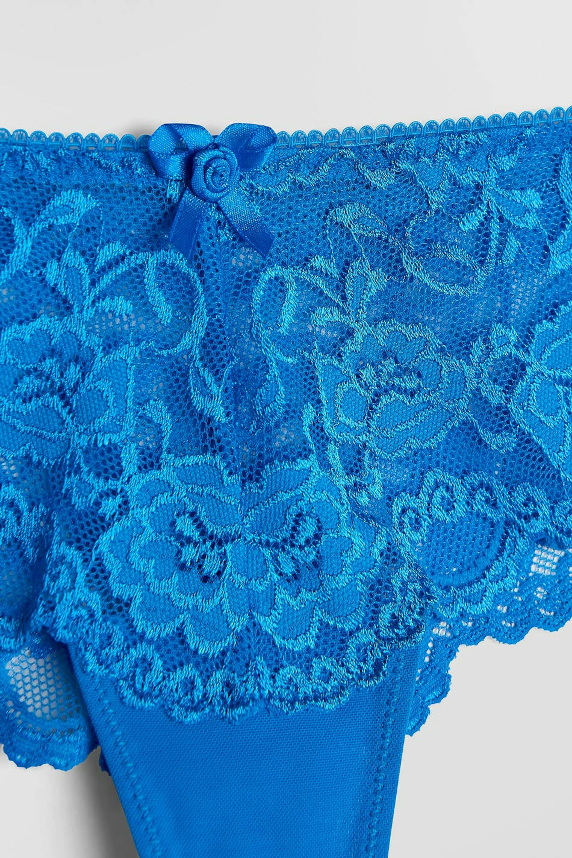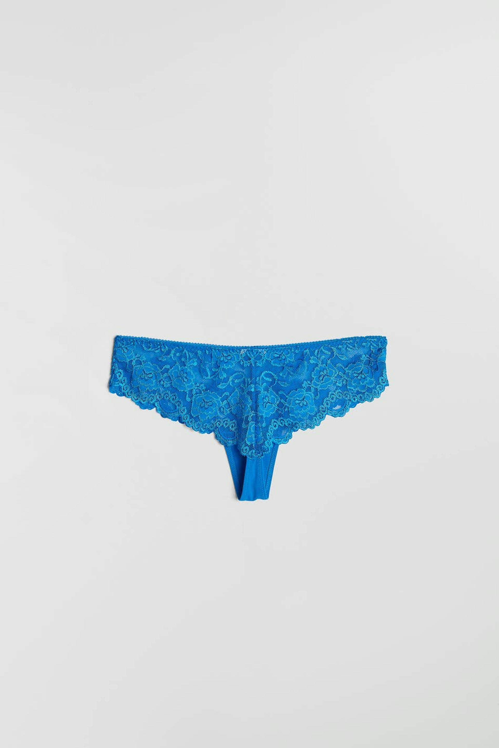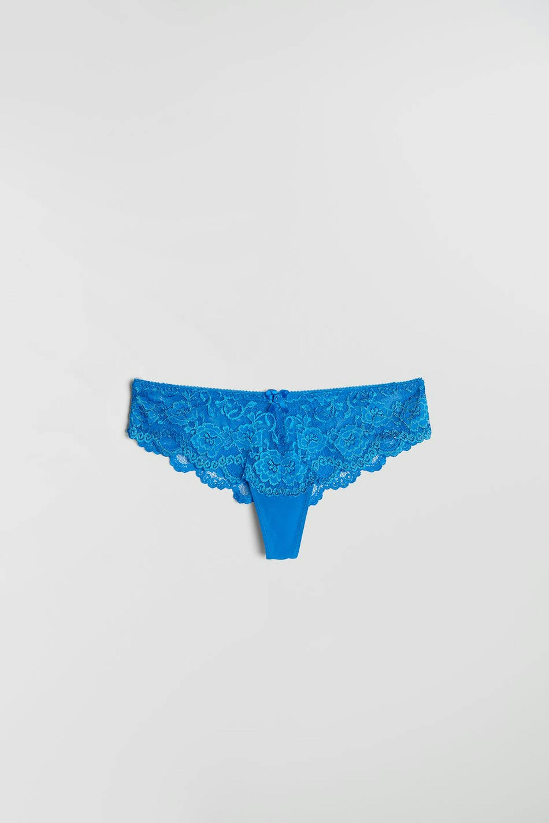 Stringit vuorilla puuvillasta jalkovälissä. Stringit ovat sinisiä. Ne valmistetaan pitsistä.