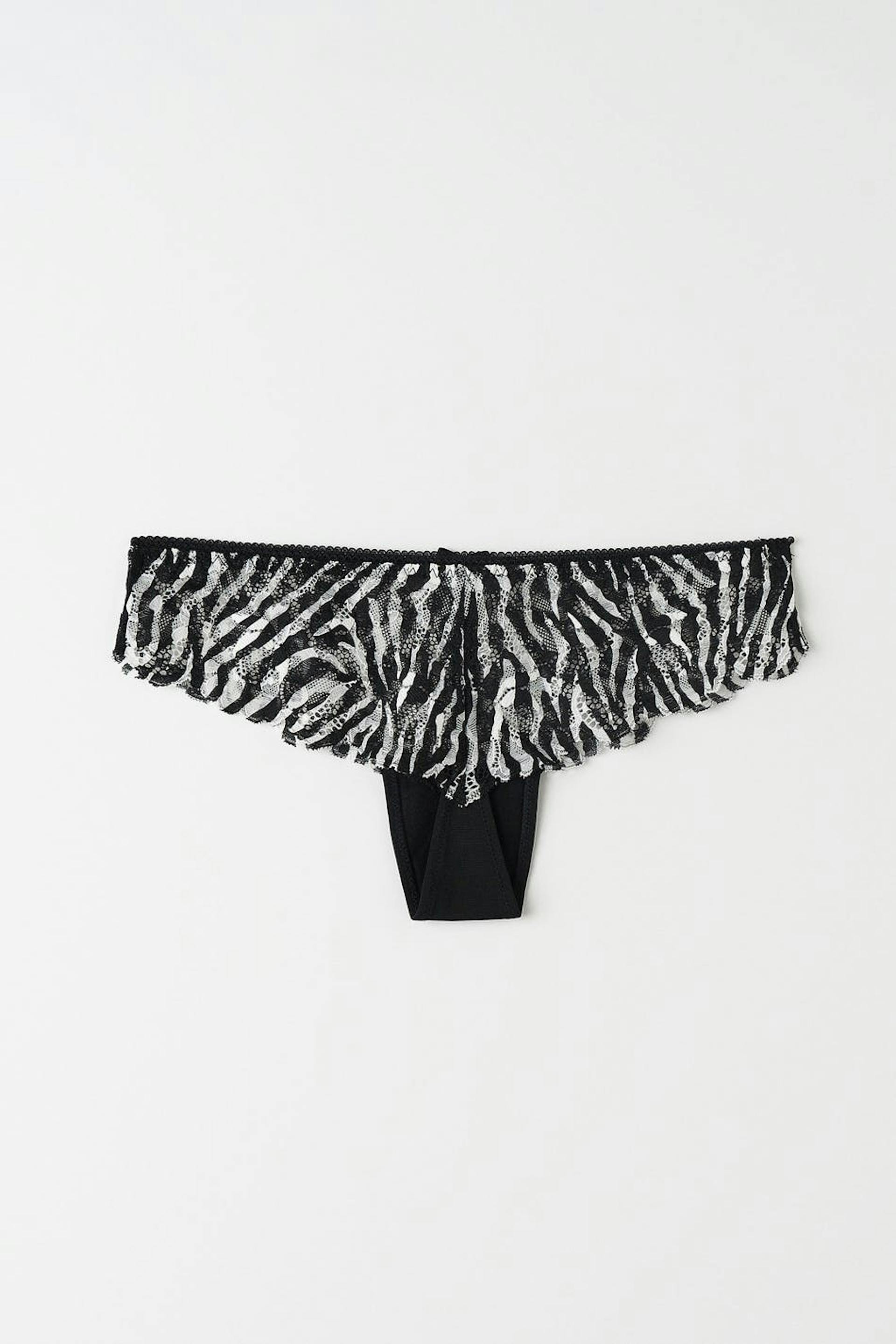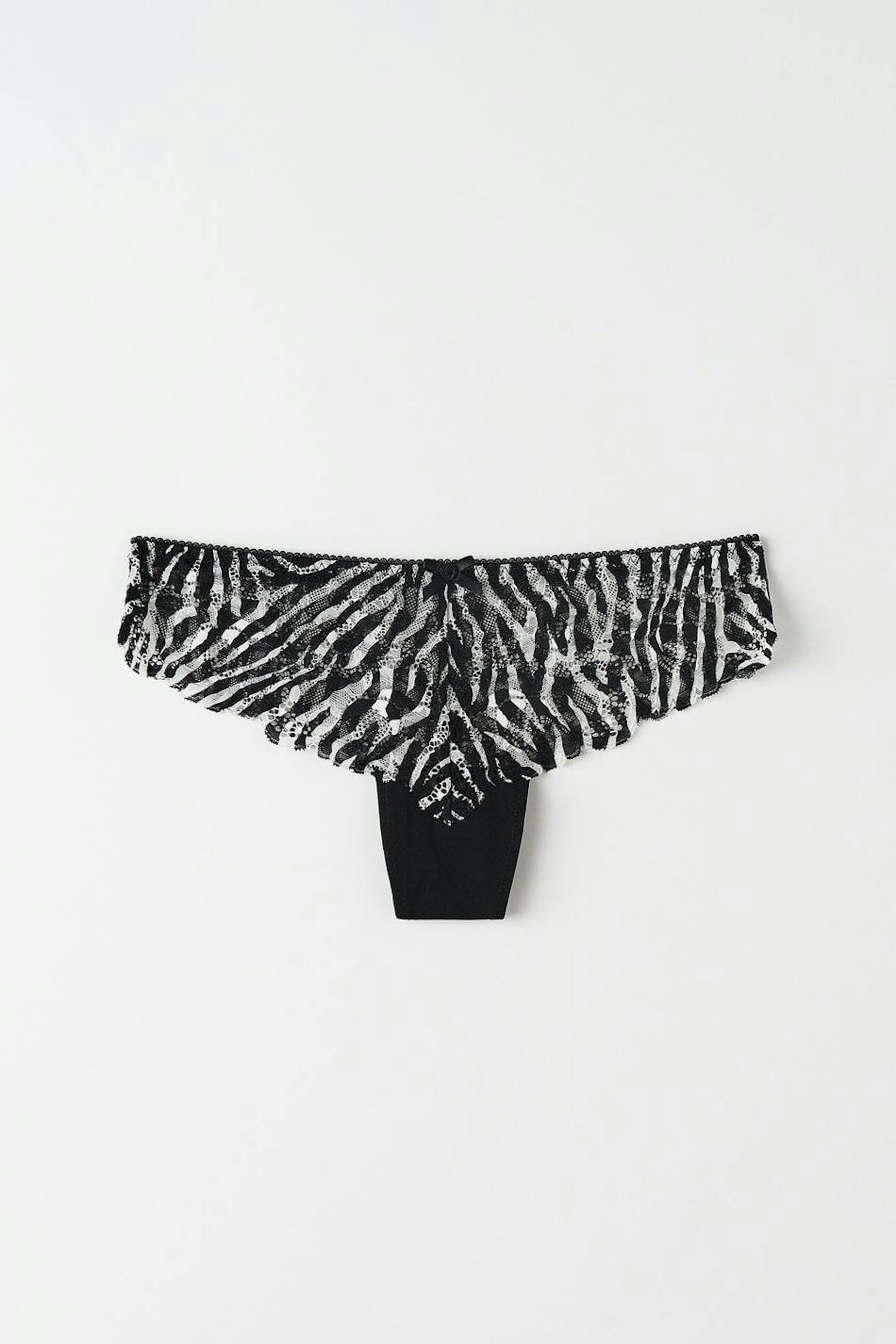 Seeprakuvioidut stringit pitsistä vuoratulla haaralla. Stringit ovat pehmeitä ja niissä on rusettiyksityiskohta edessä.