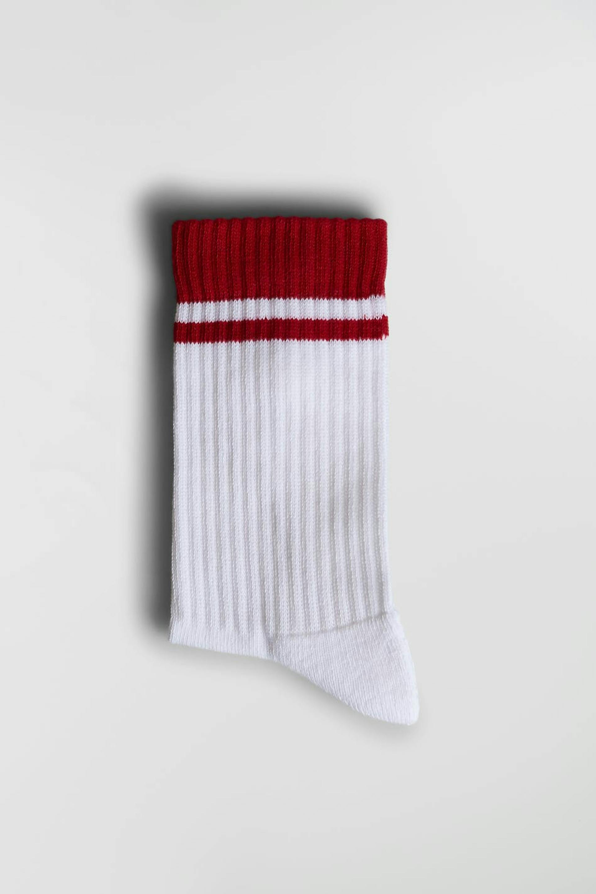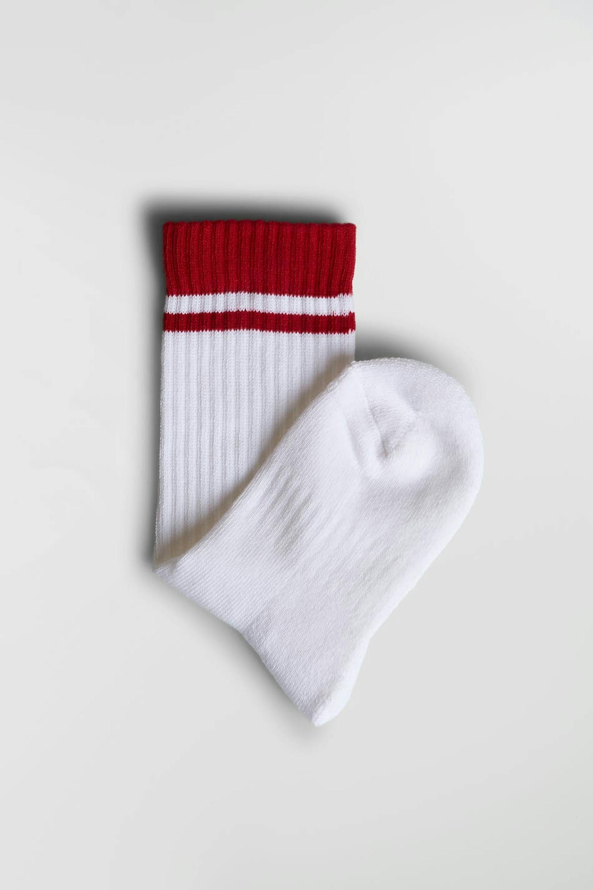 Sukat punaisella reunalla. Sukat ovat valkoisia.