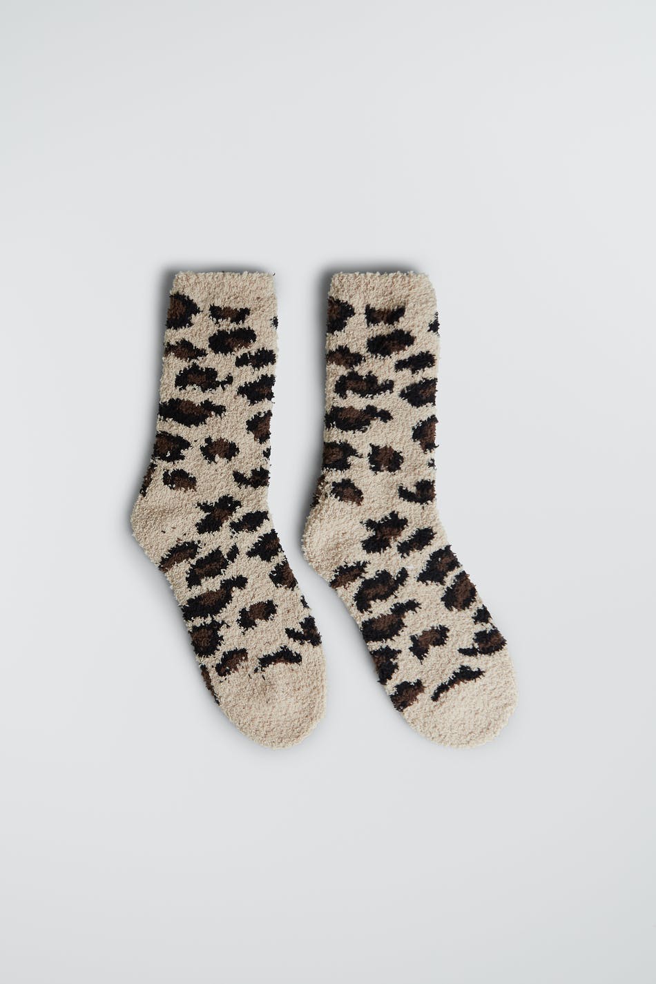 Pörröiset sukat 2 kpl -pakkauksella. Sukat ovat leopardi.