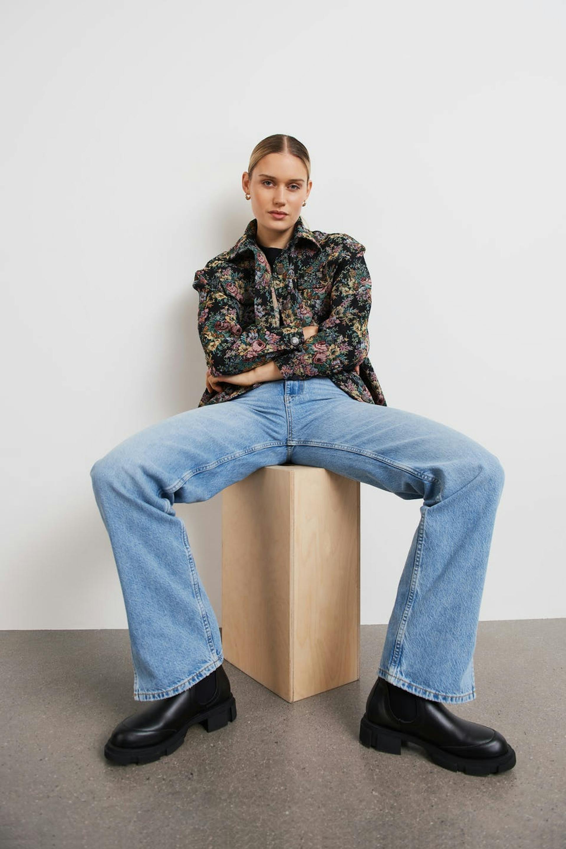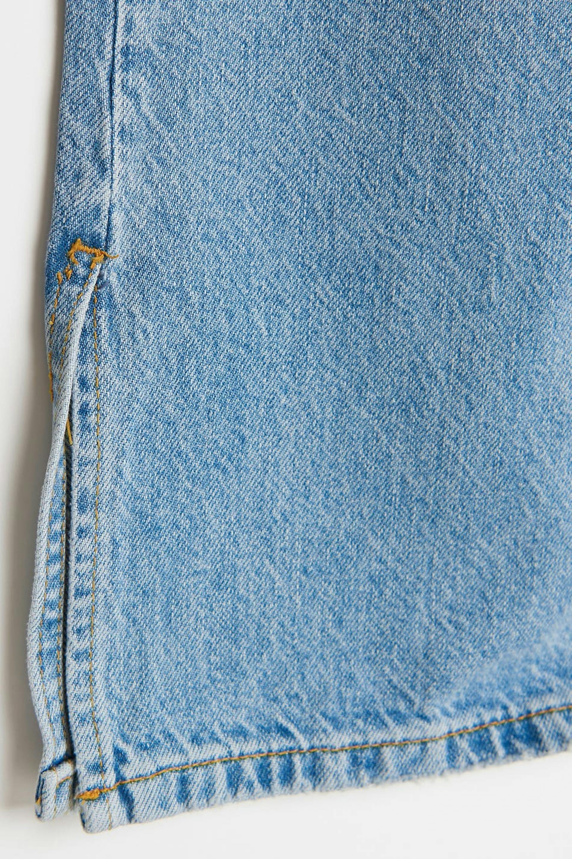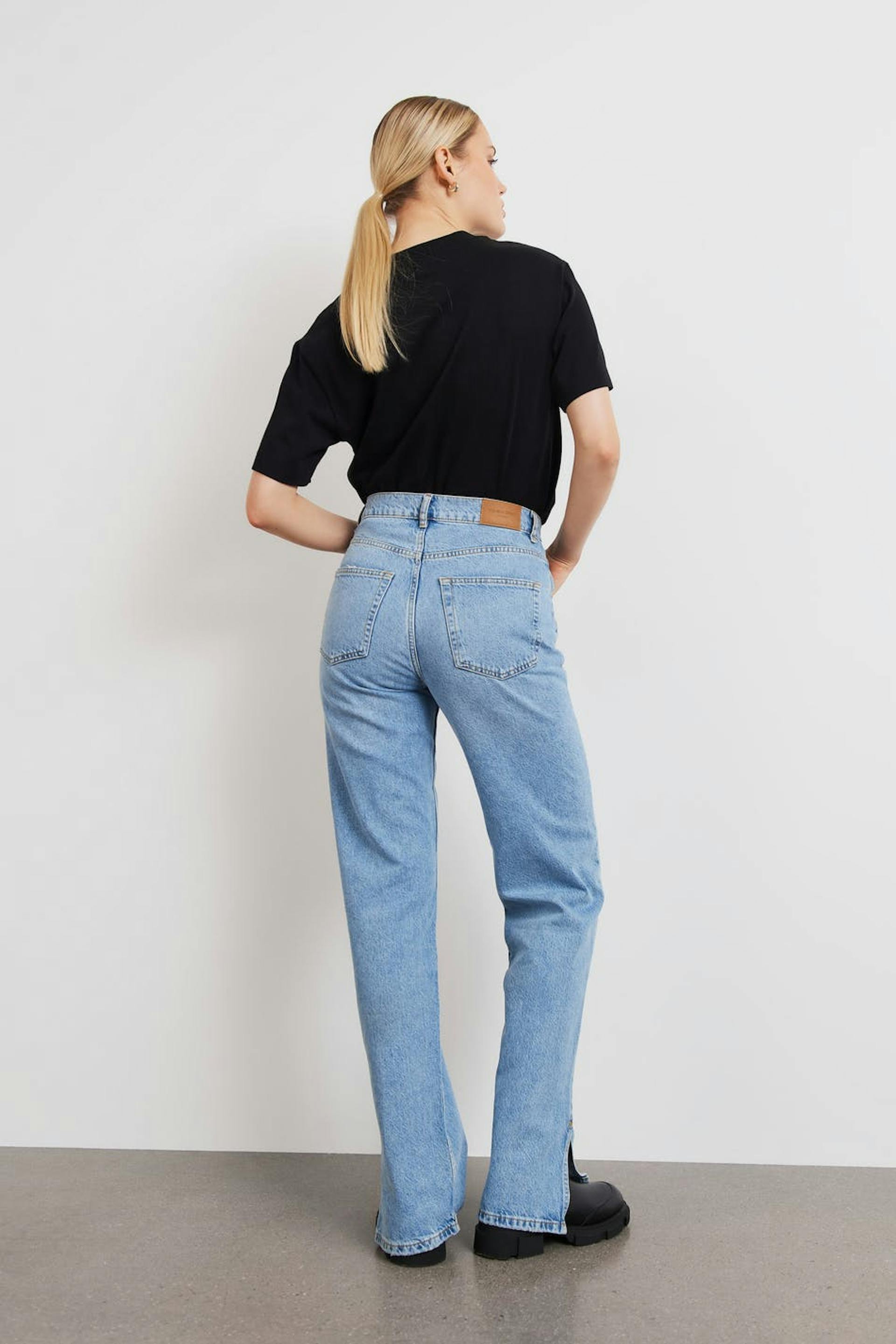 Farkut korkealla vyötäröllä. Farkut ovat sinisiä ja niissä on 90-luvun innoittava sopivuus. Ne valmistetaan joustamattomasta denimistä ja niissä on lahkeet täyspituudella, halkio lahkeiden lopuissa ja taskut edessä ja takana. Sinulle, joka olet ainakin 176 cm pitkä.