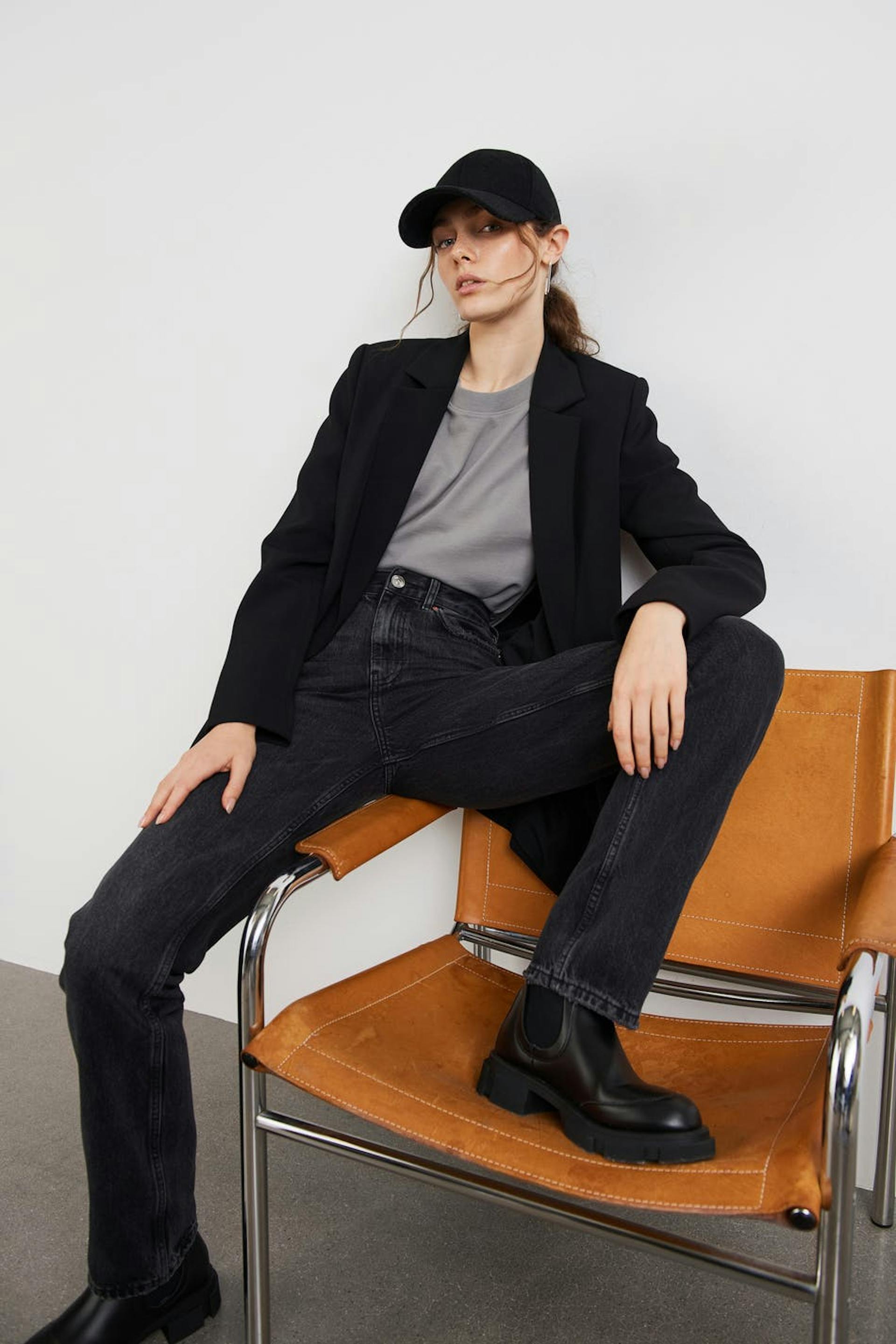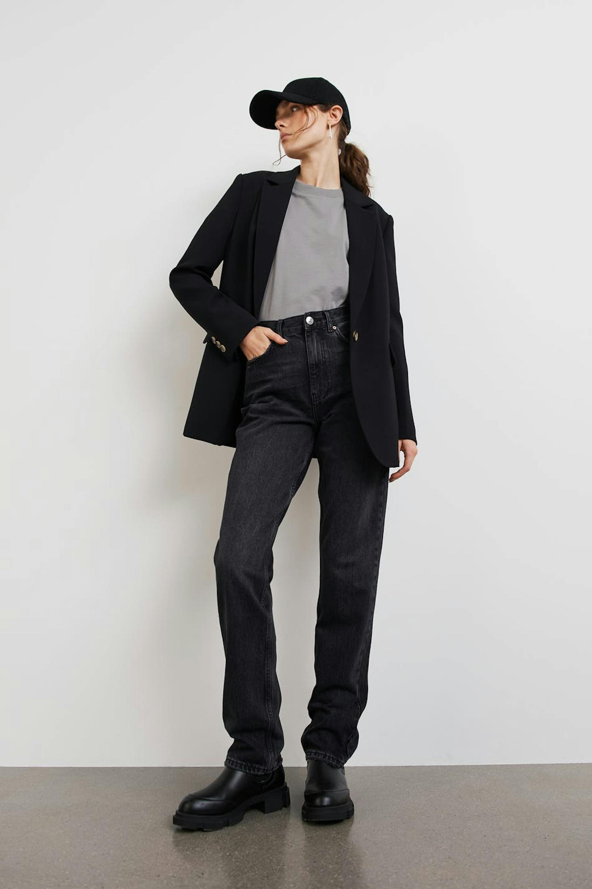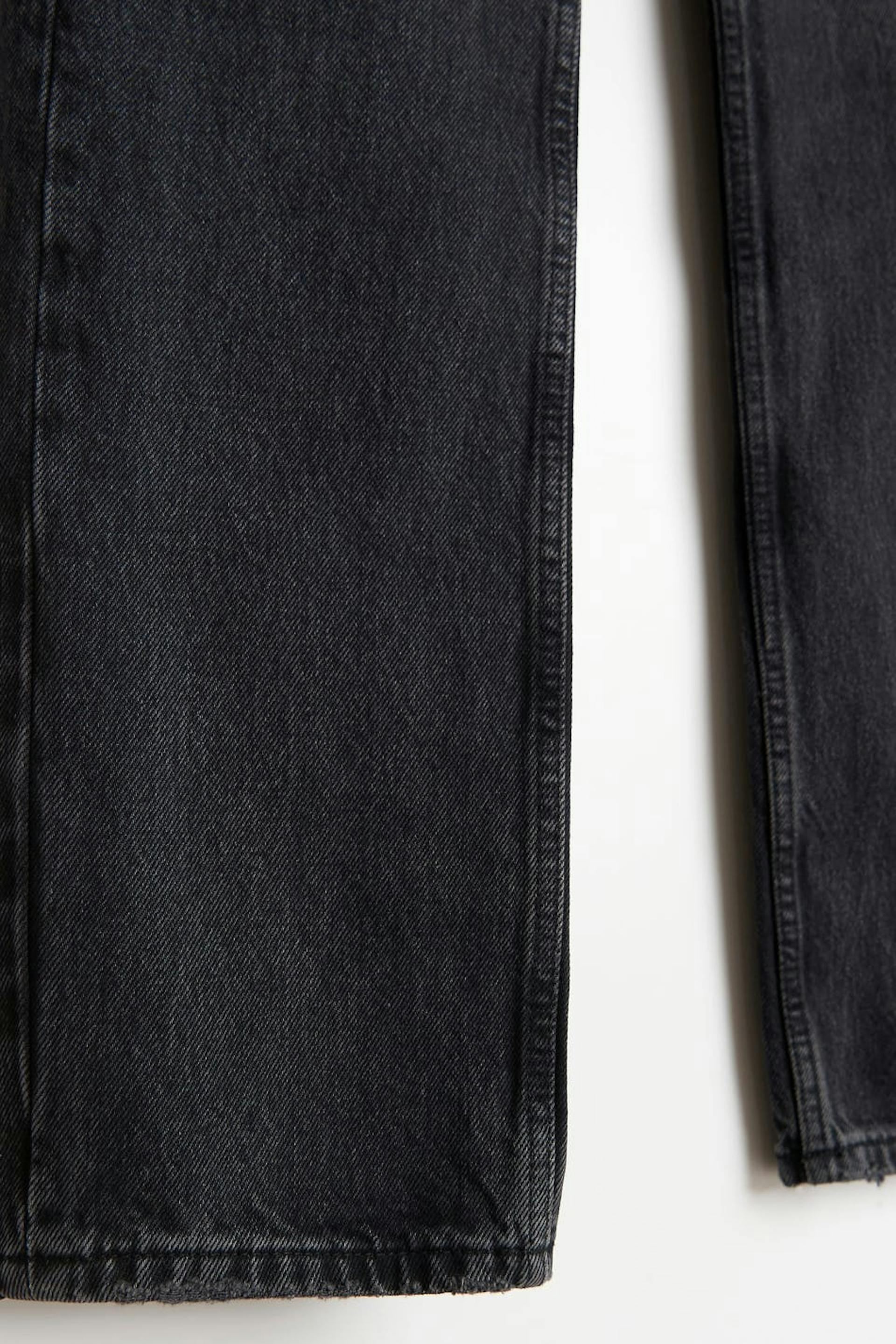 Joustamattomat straight-farkut korkealla vyötäröllä. Farkut ovat mustia ja niissä on vintagepesu. Niissä on vartalonmyötäinen istuvuus, suorat lahkeet täyspituudella ja taskut edessä ja takana.