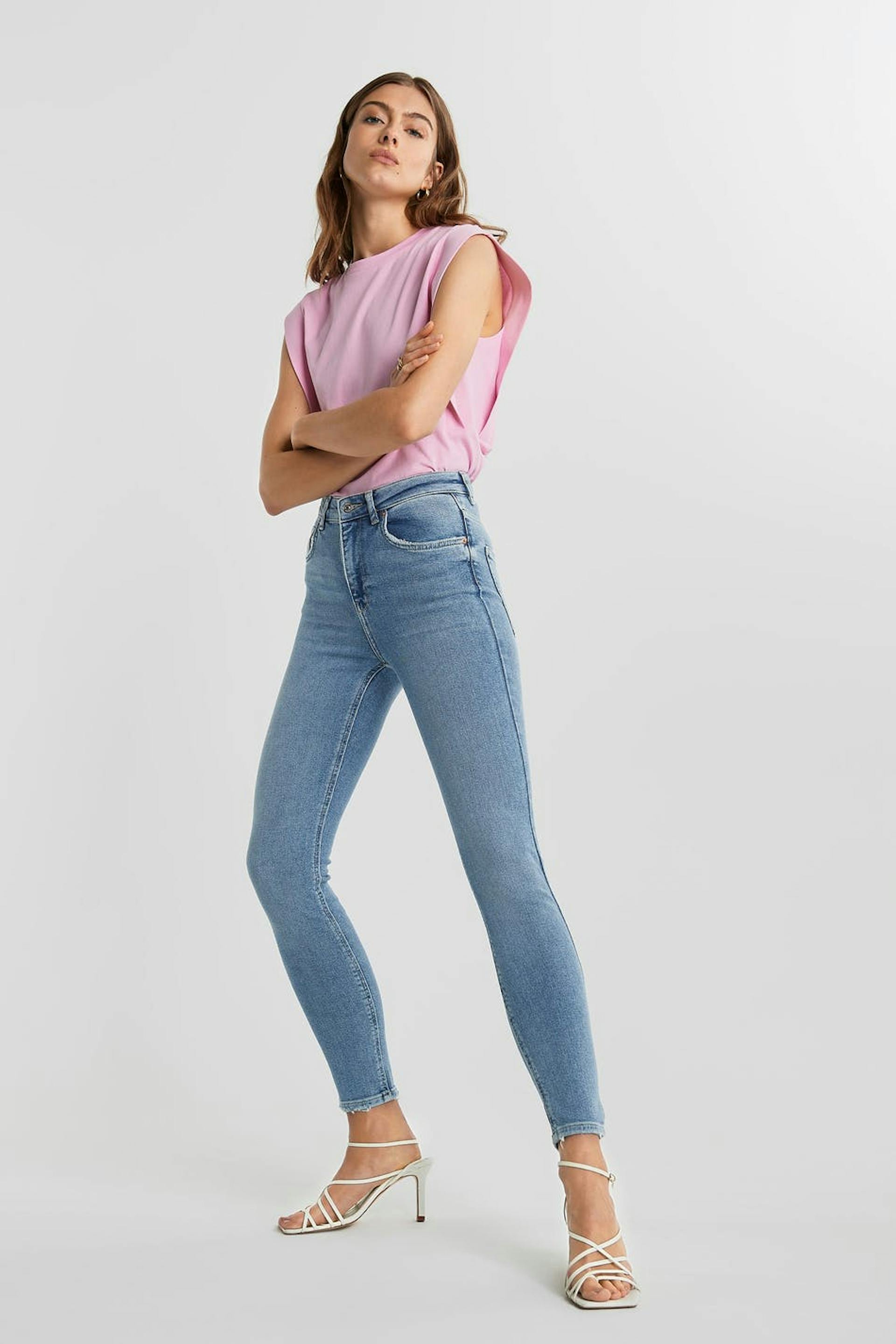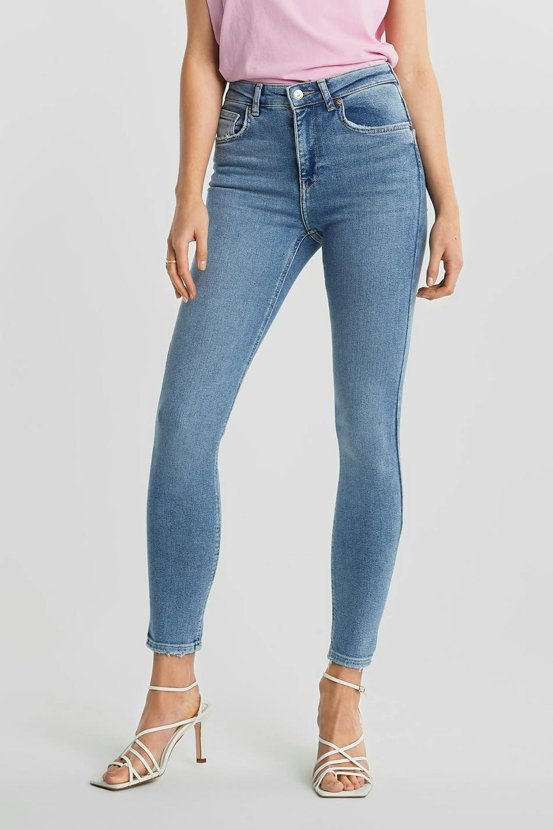 Korkeavyötäröiset farkut vartalonmyötäisellä istuvuudella. Farkku on vaaleansininen ja siinä on skinny-malli. Siinä on comfort-stretch.