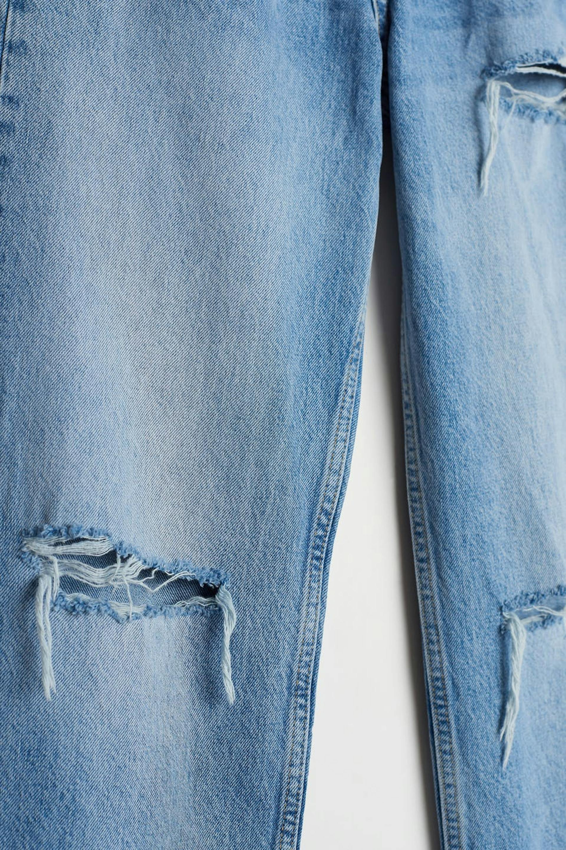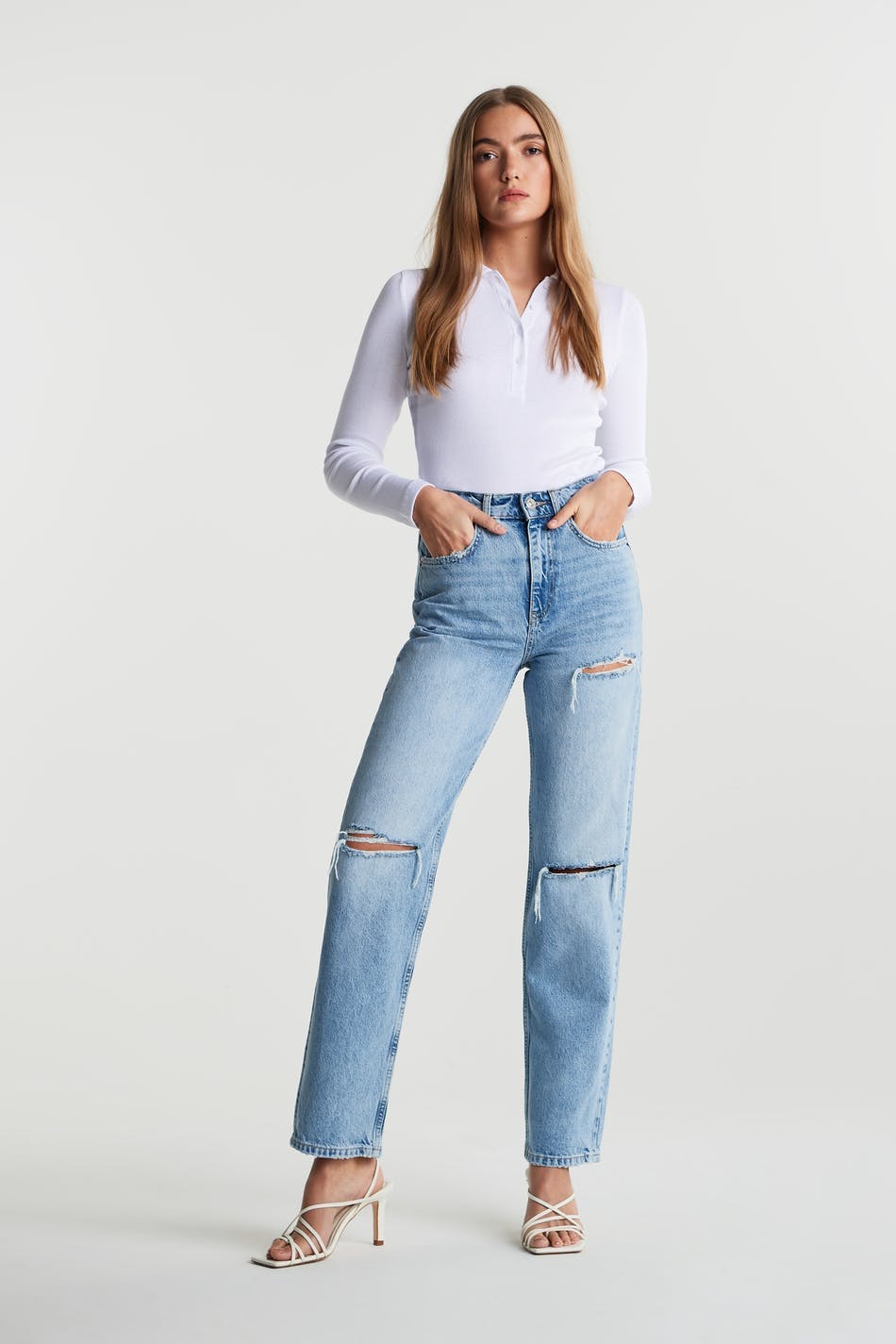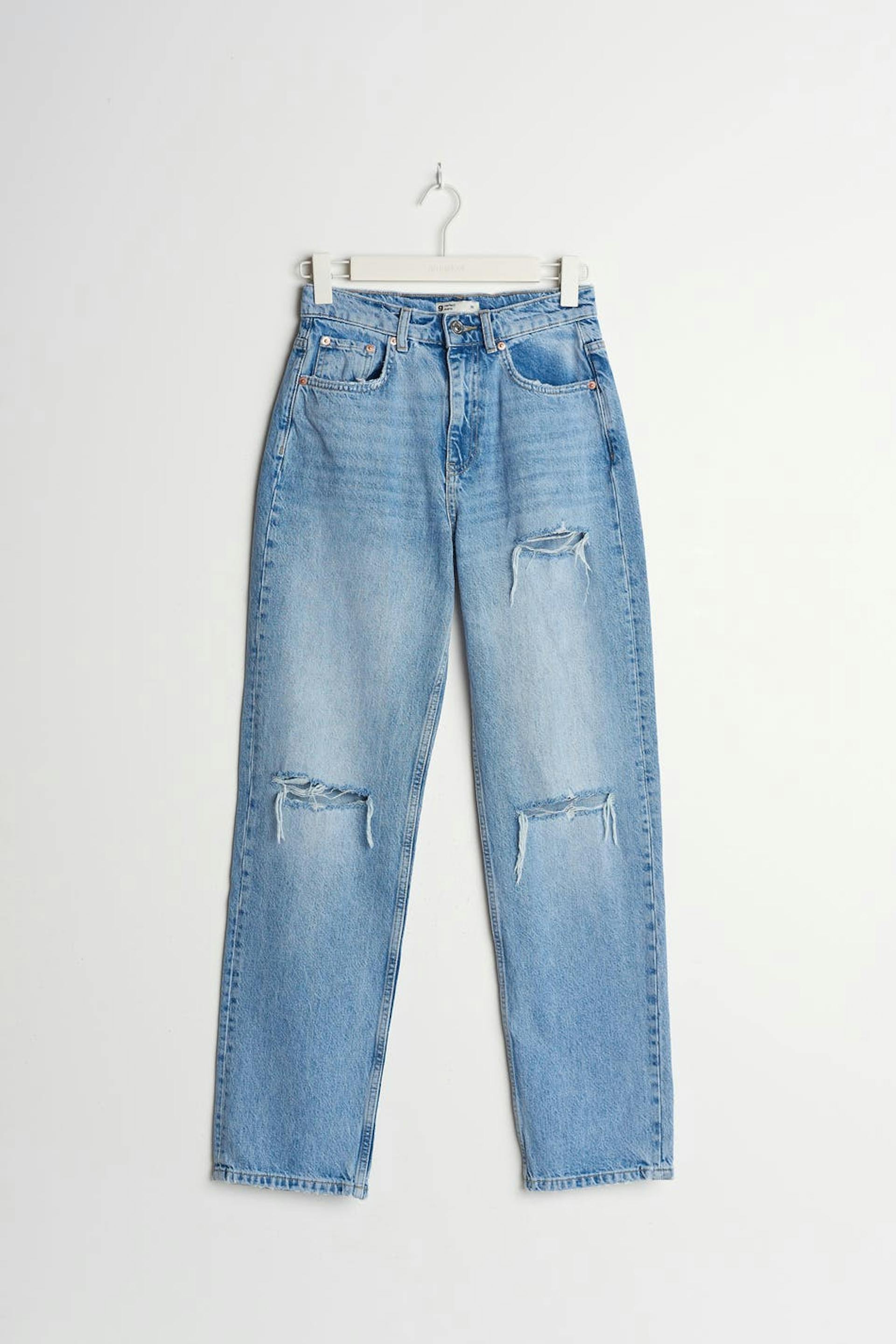 Joustamattomat korkeavyötäröiset farkut kulutetuilla polvilla. Farkut ovat sinisiä ja niissä on suora, 90-luvun innoittava istuvuus. Ne valmistetaan denimistä ja niissä on erittäin korkea vyötärö, housujen lahkeet täyspituudella ja taskut edessä ja takana.