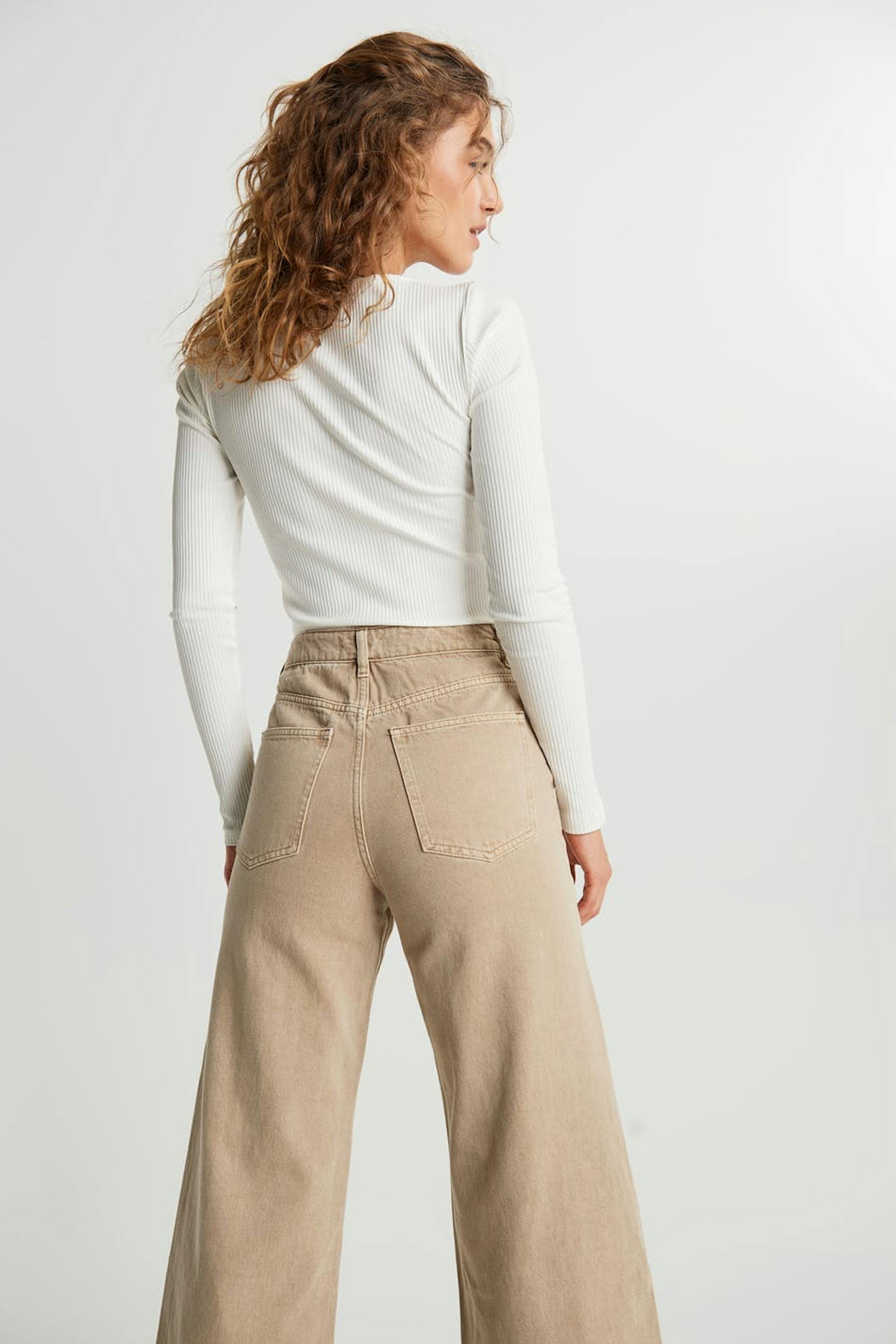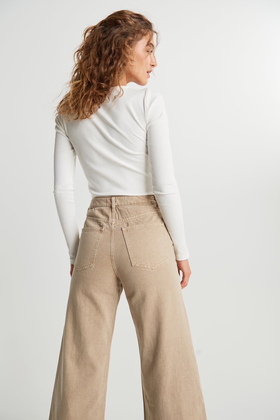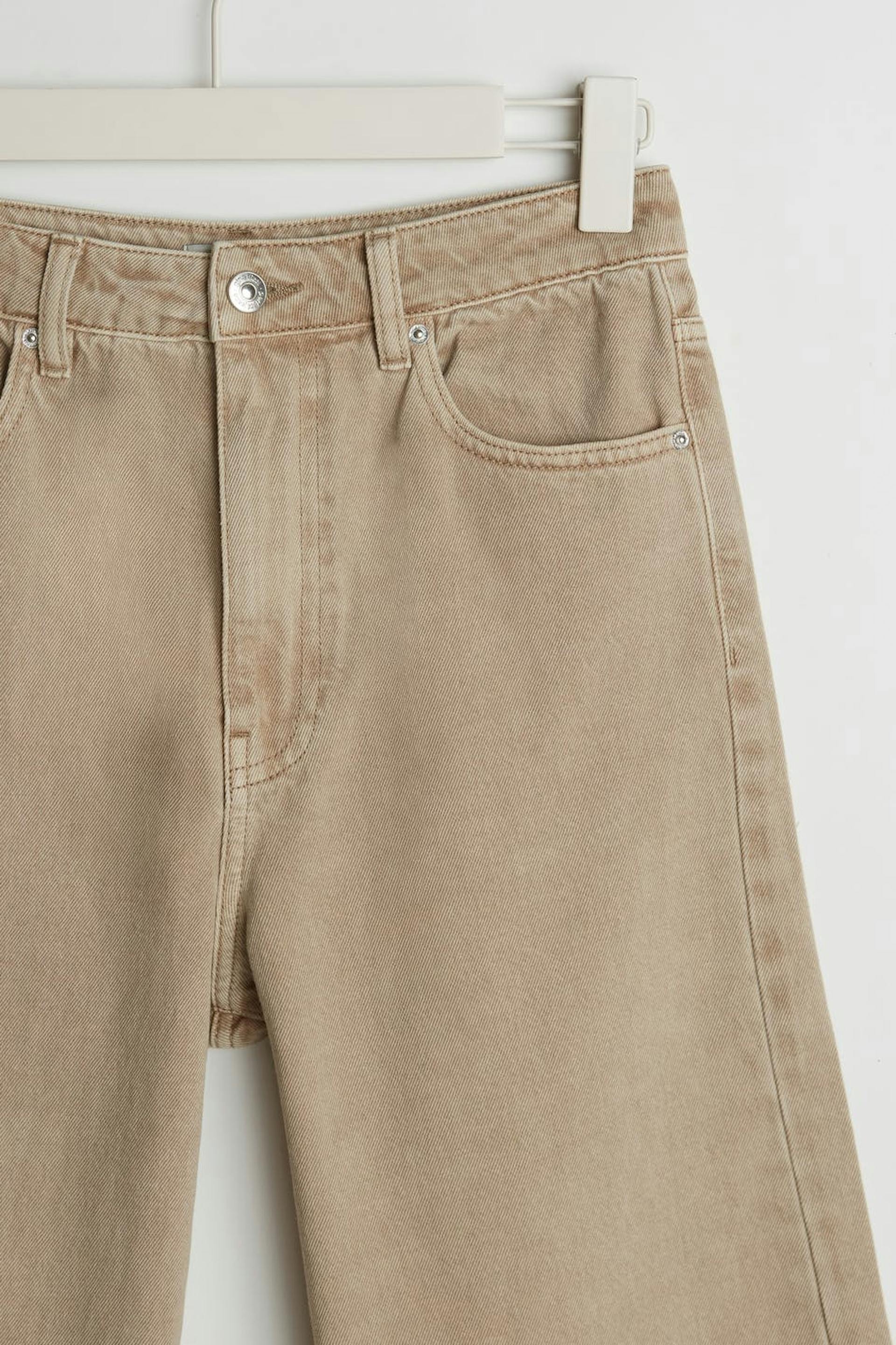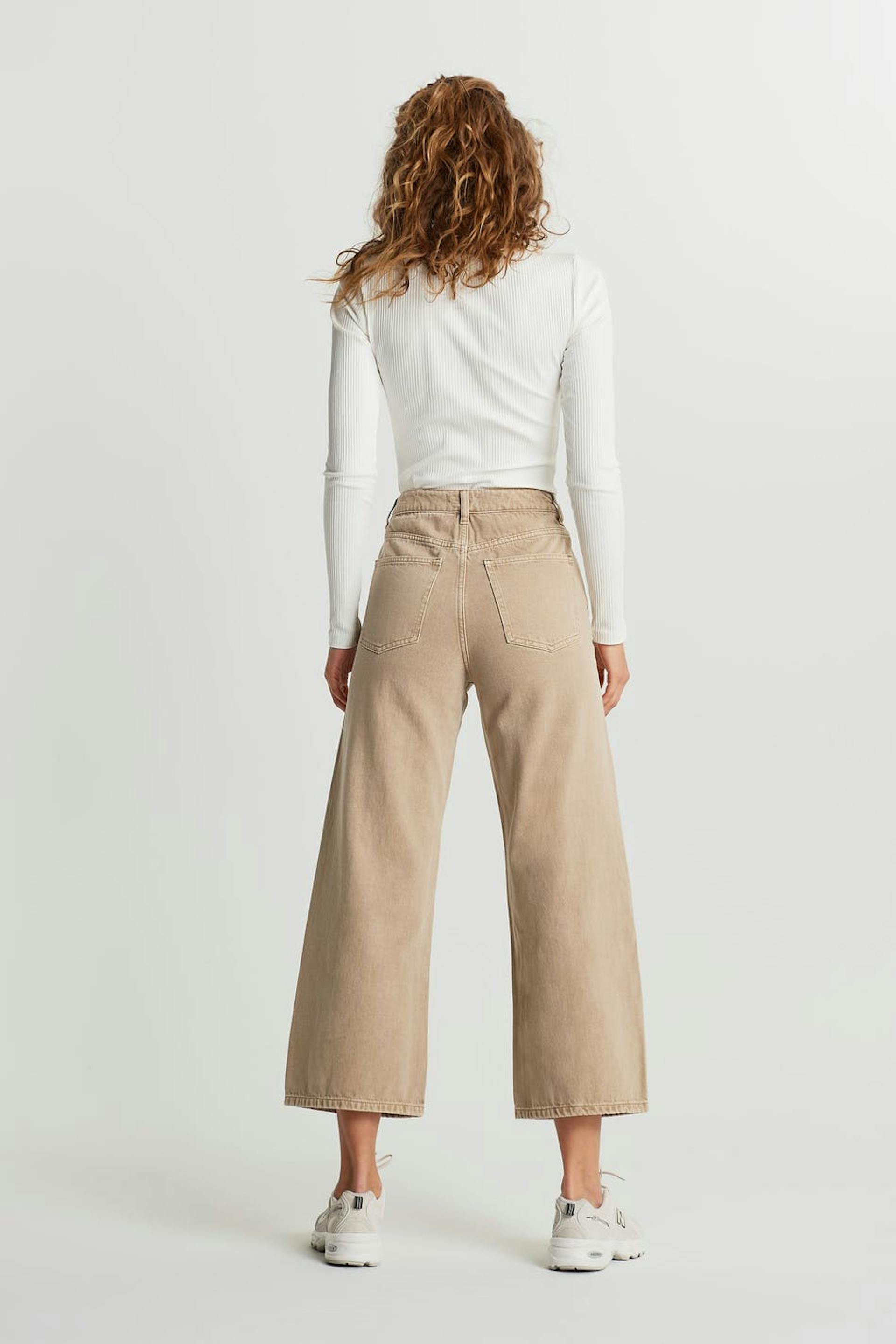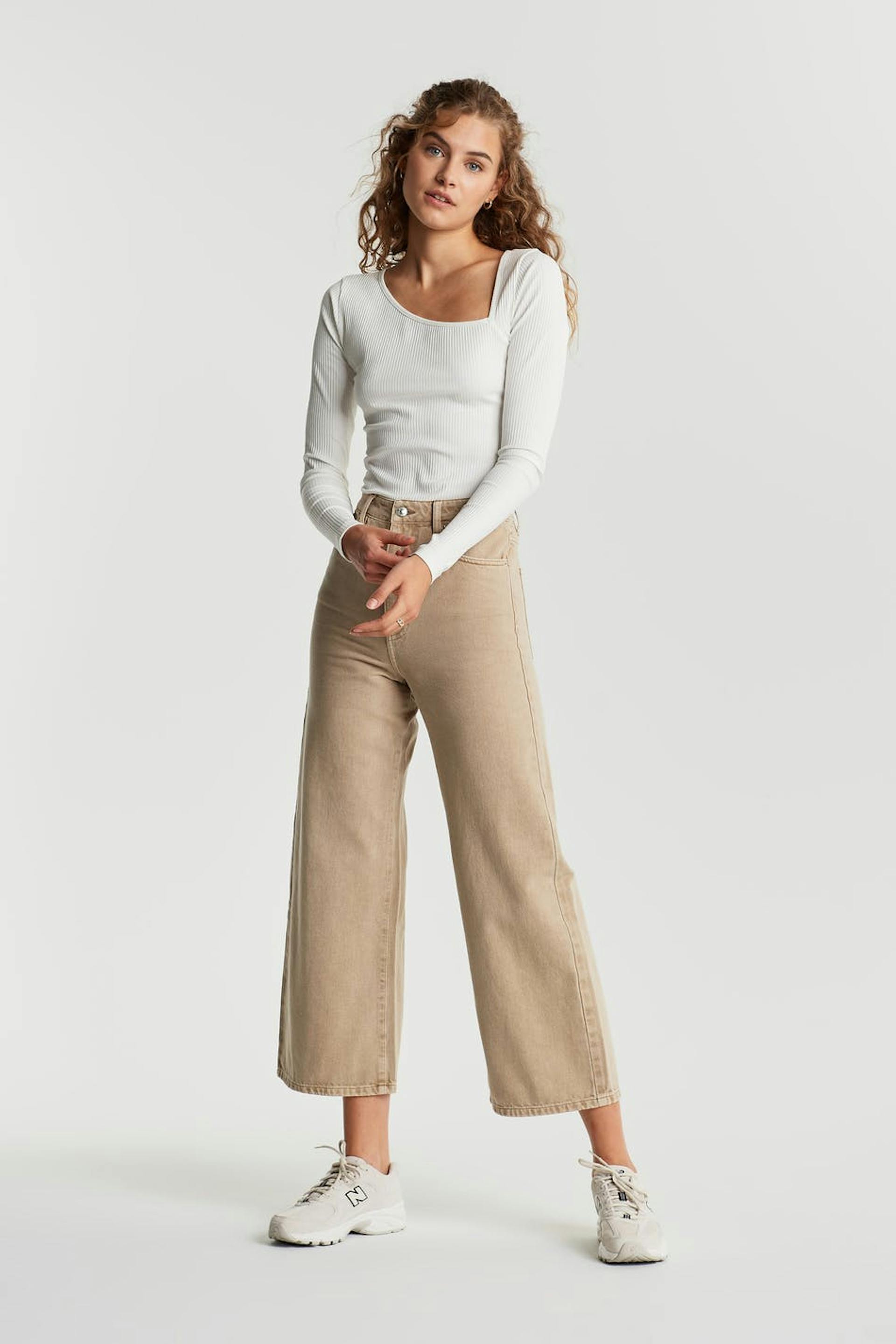 Leveä farkku normaalilla leikkauksella. Farkku on beige ja siinä on korkea vyötärö. Siinä on cropatut jalat.