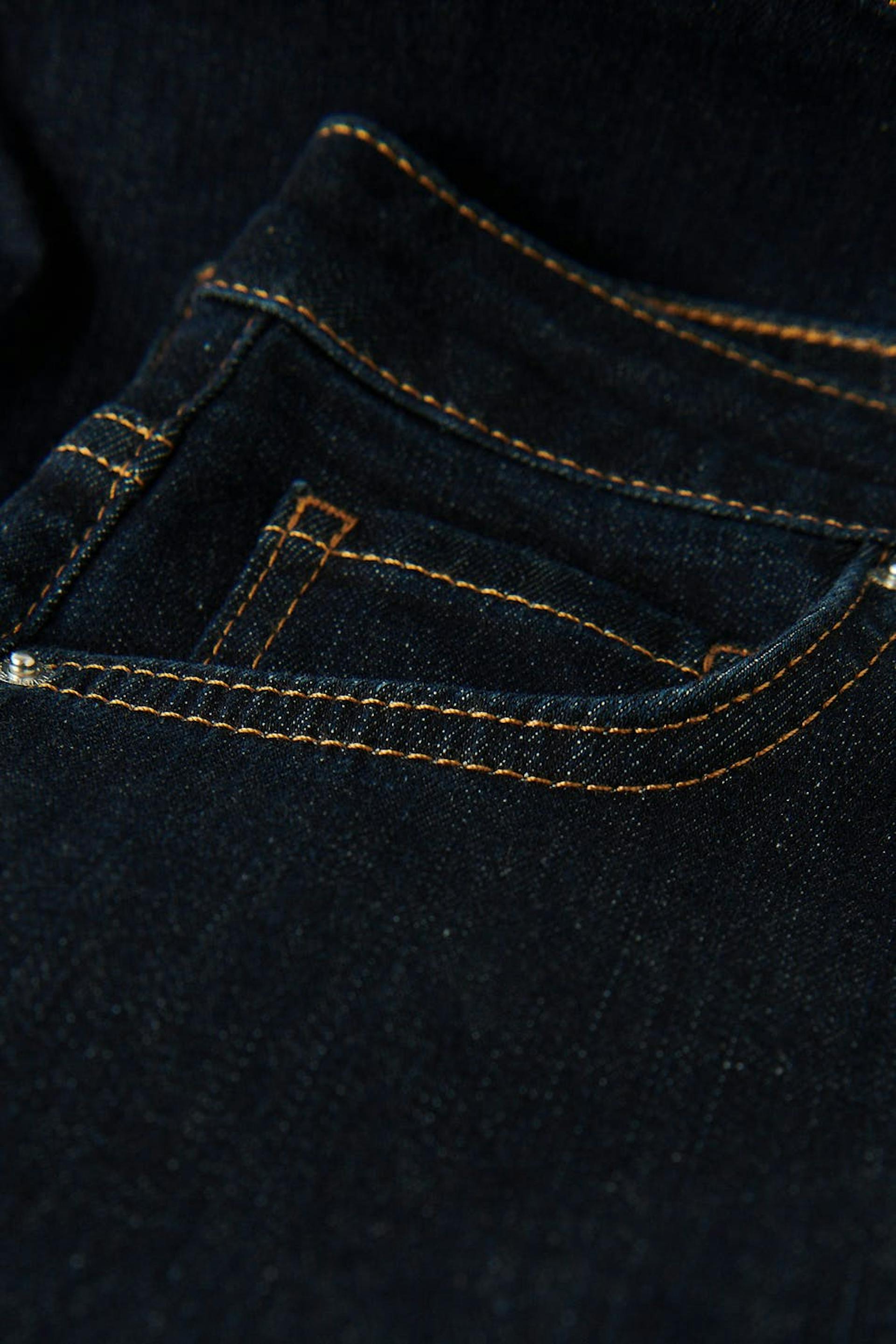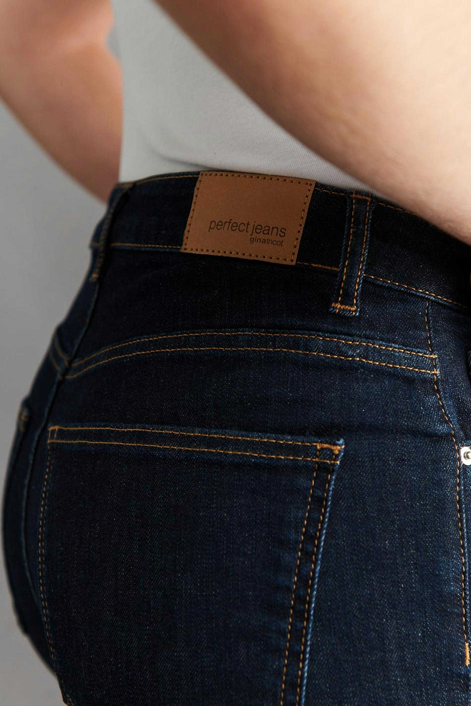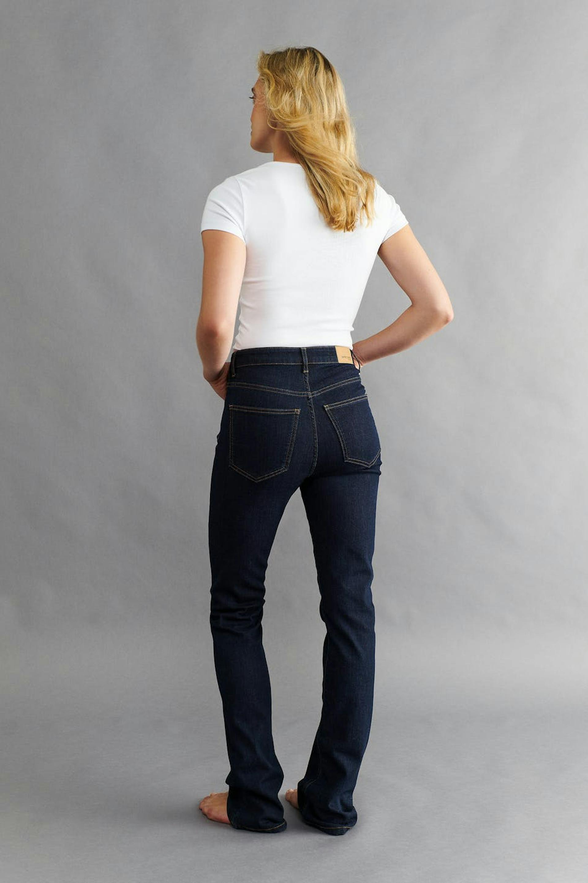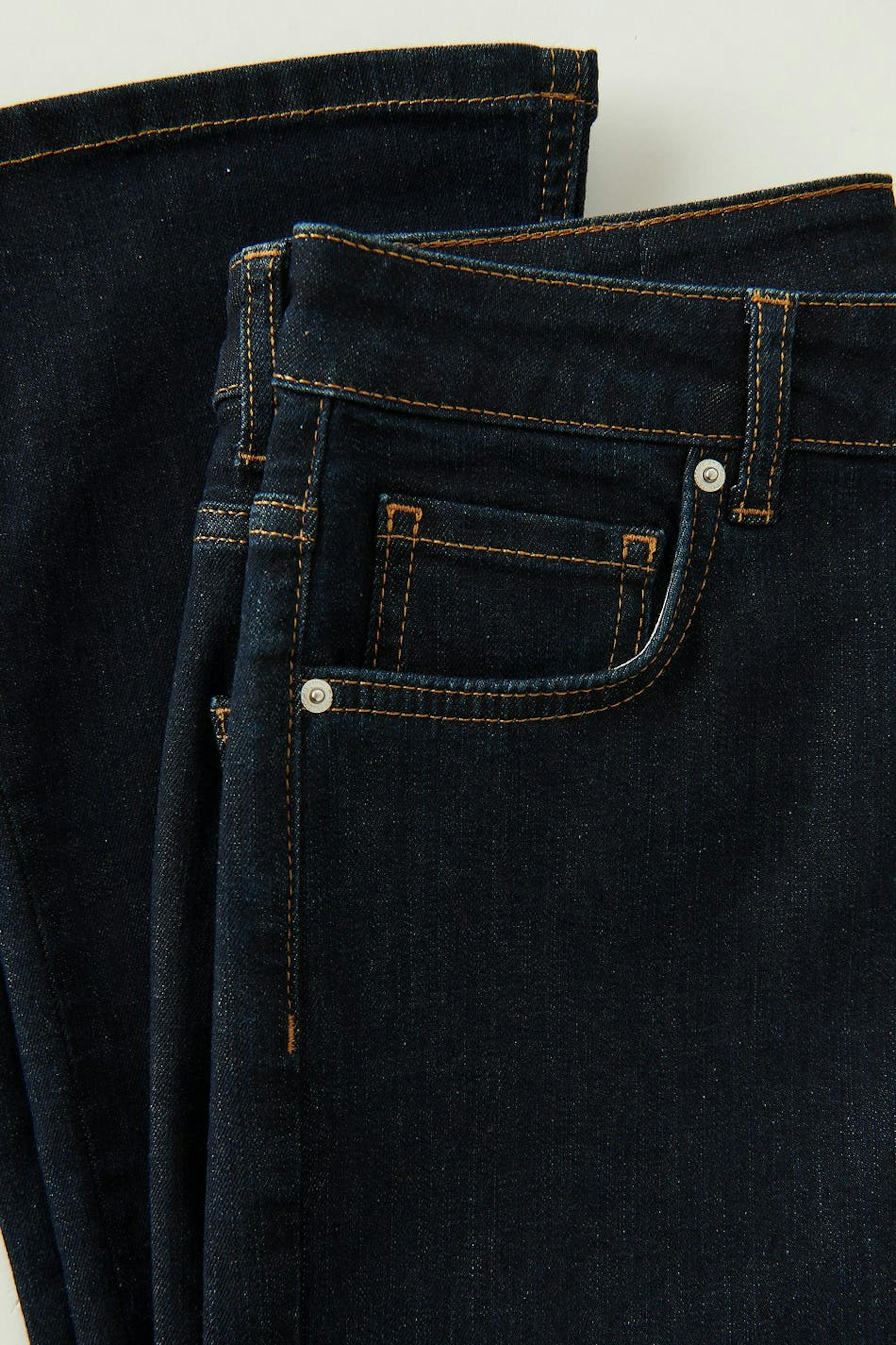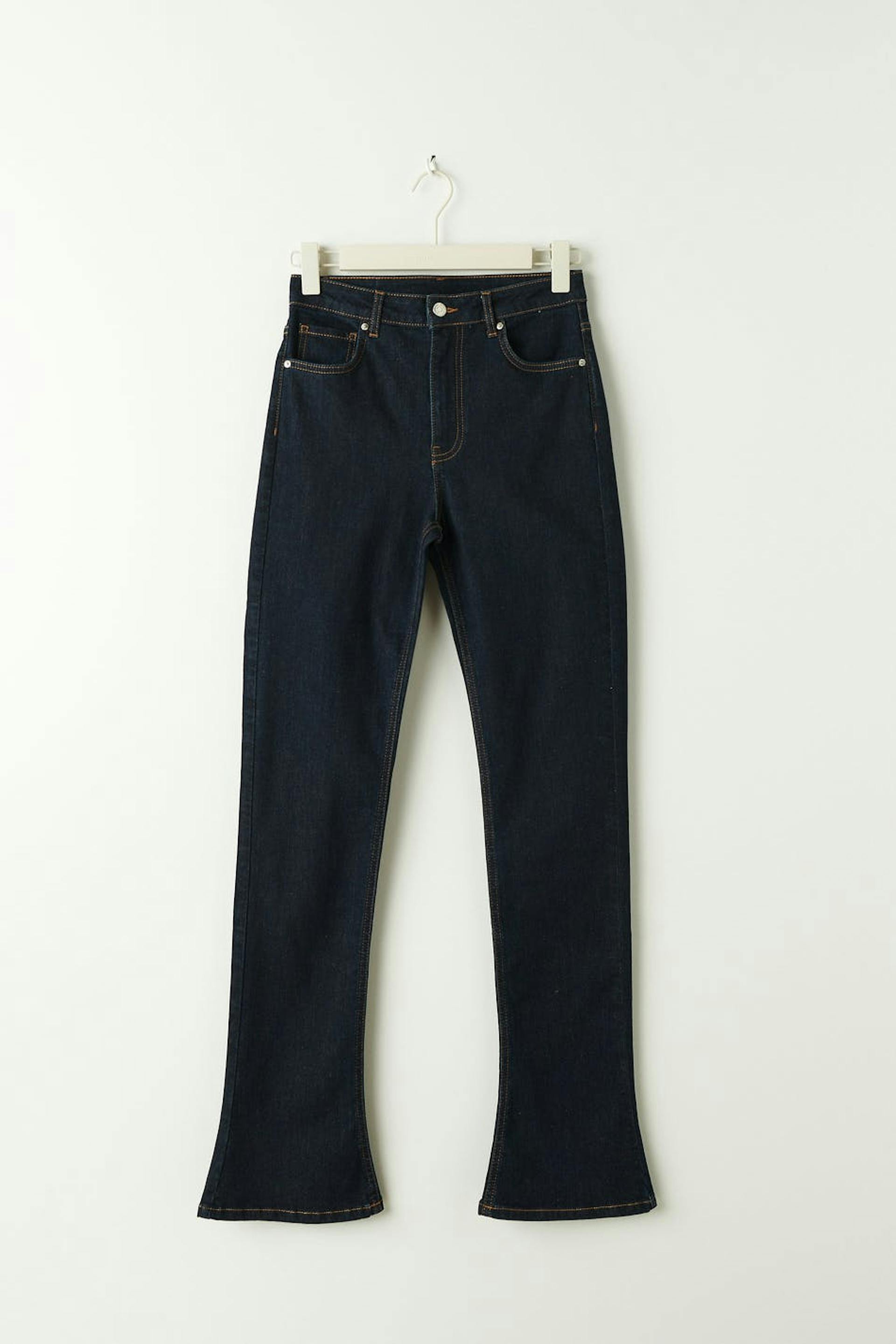 Bootcut-farkkut keskikorkealla vyötäröllä. Farkut ovat sinisiä ja niissä on slim-leikkaus kevyesti joustavasta denimistä. Niissä on vetoketjusepalus, lievästi levenevät jalat ja käsittelemätön reuna lahkeiden lopuissa.