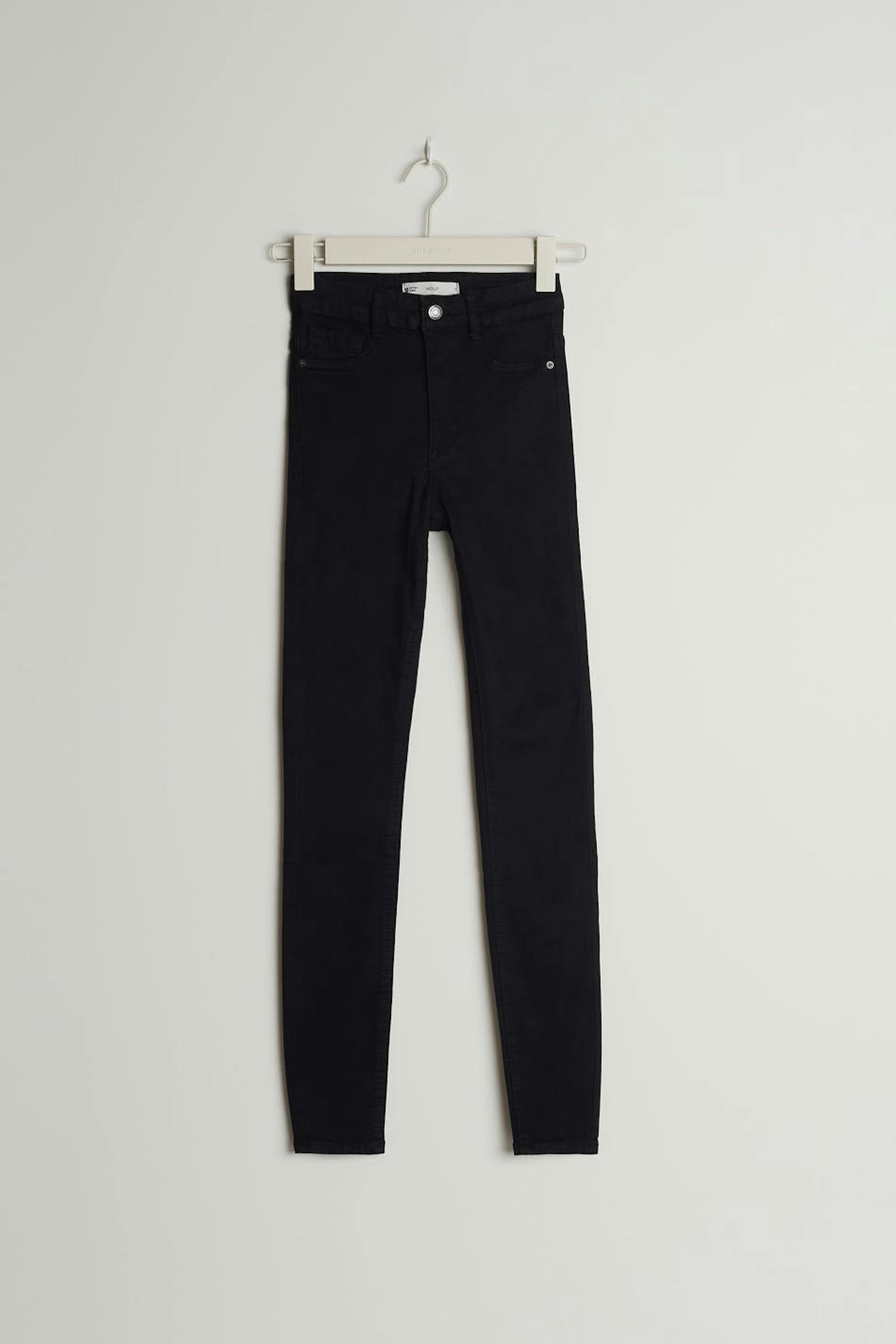 Erittäin joustavat farkut korkealla vyötäröllä. Farkut ovat mustia ja niissä on vartalonmyötäinen, mukava istuvuus kapeilla lahkeilla. Niissä on sepalus vetoketjulla, valetaskut edessä ja aidot takataskut.