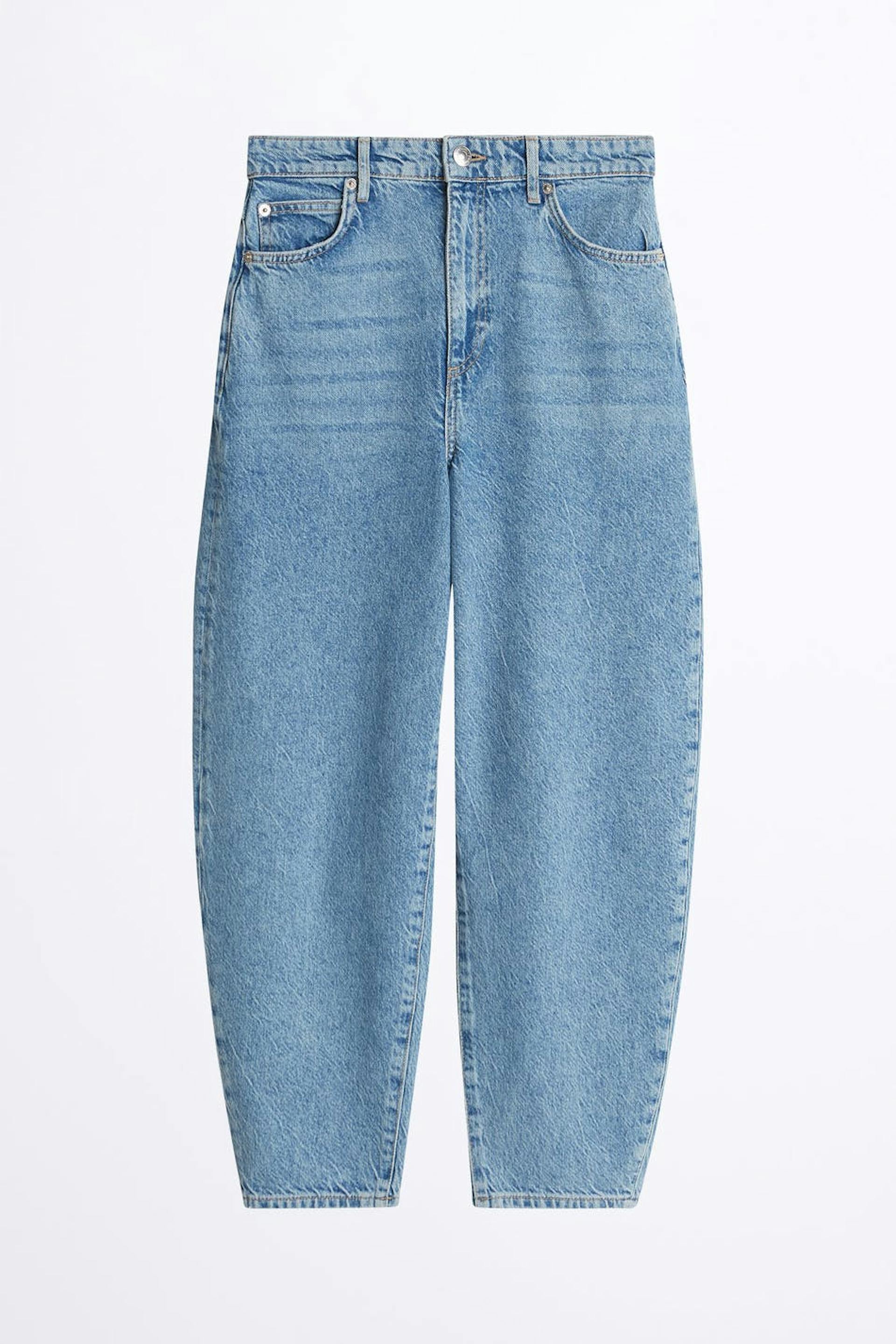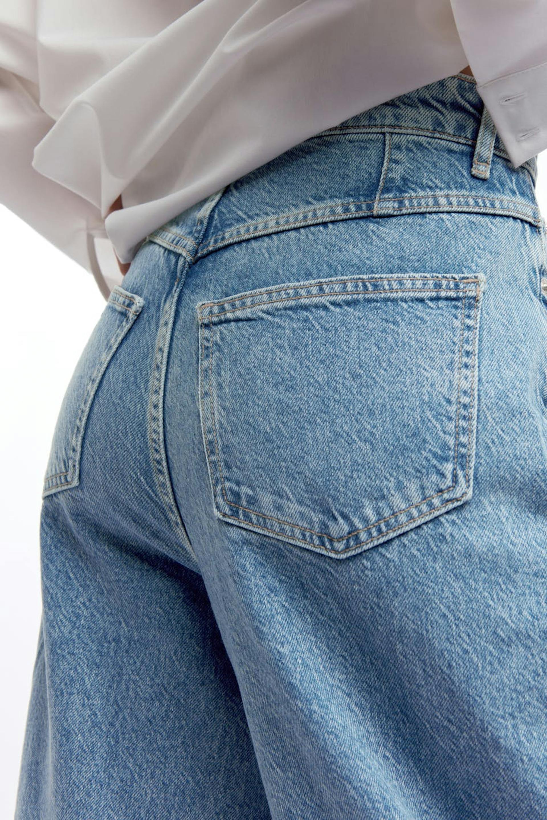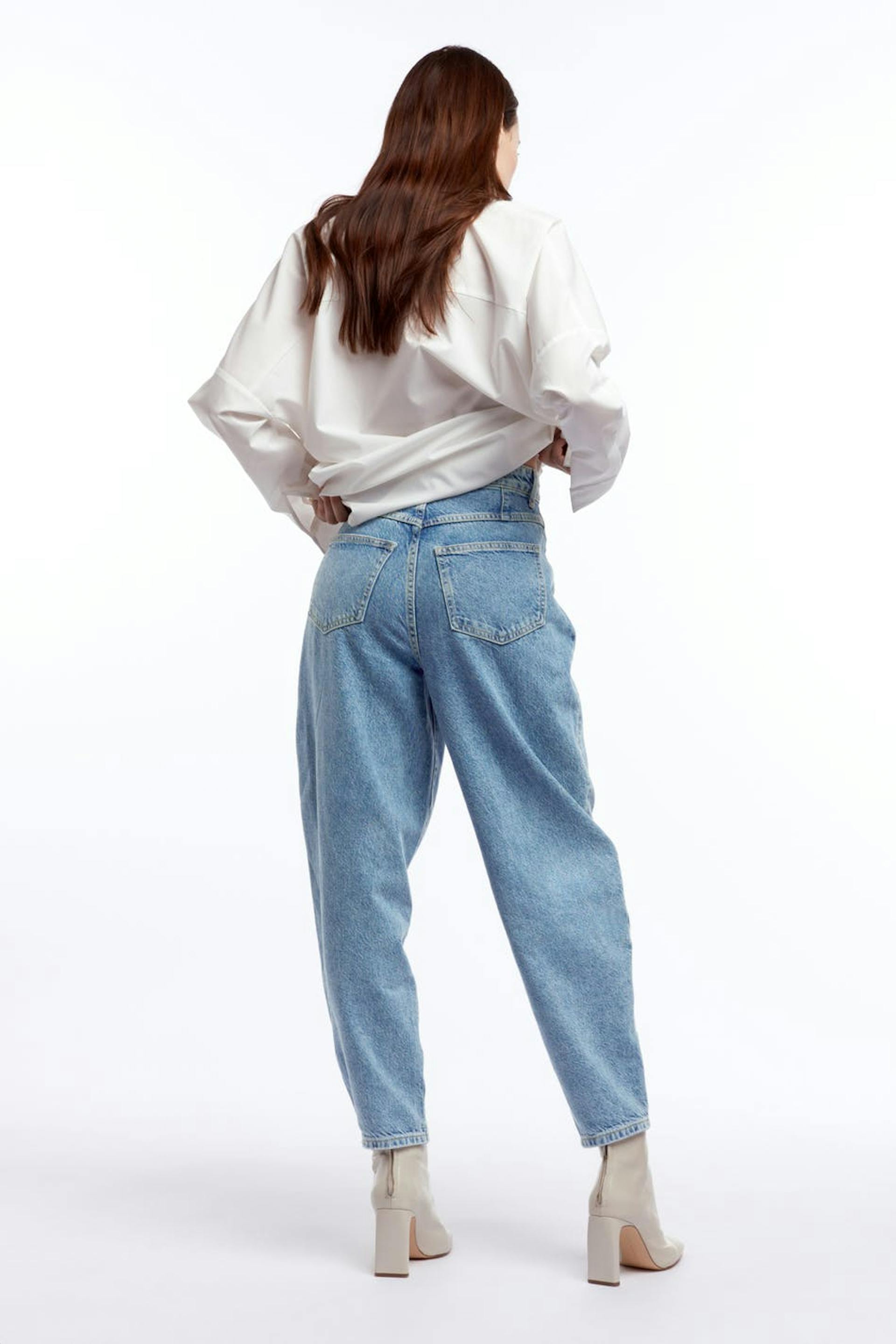 Pöyheät mom jeans -farkut ylisuuri istuvuudella. Farkku on sininen ja joustamaton ja siinä on korkea vyötärö. Siinä on tilavat jalat.