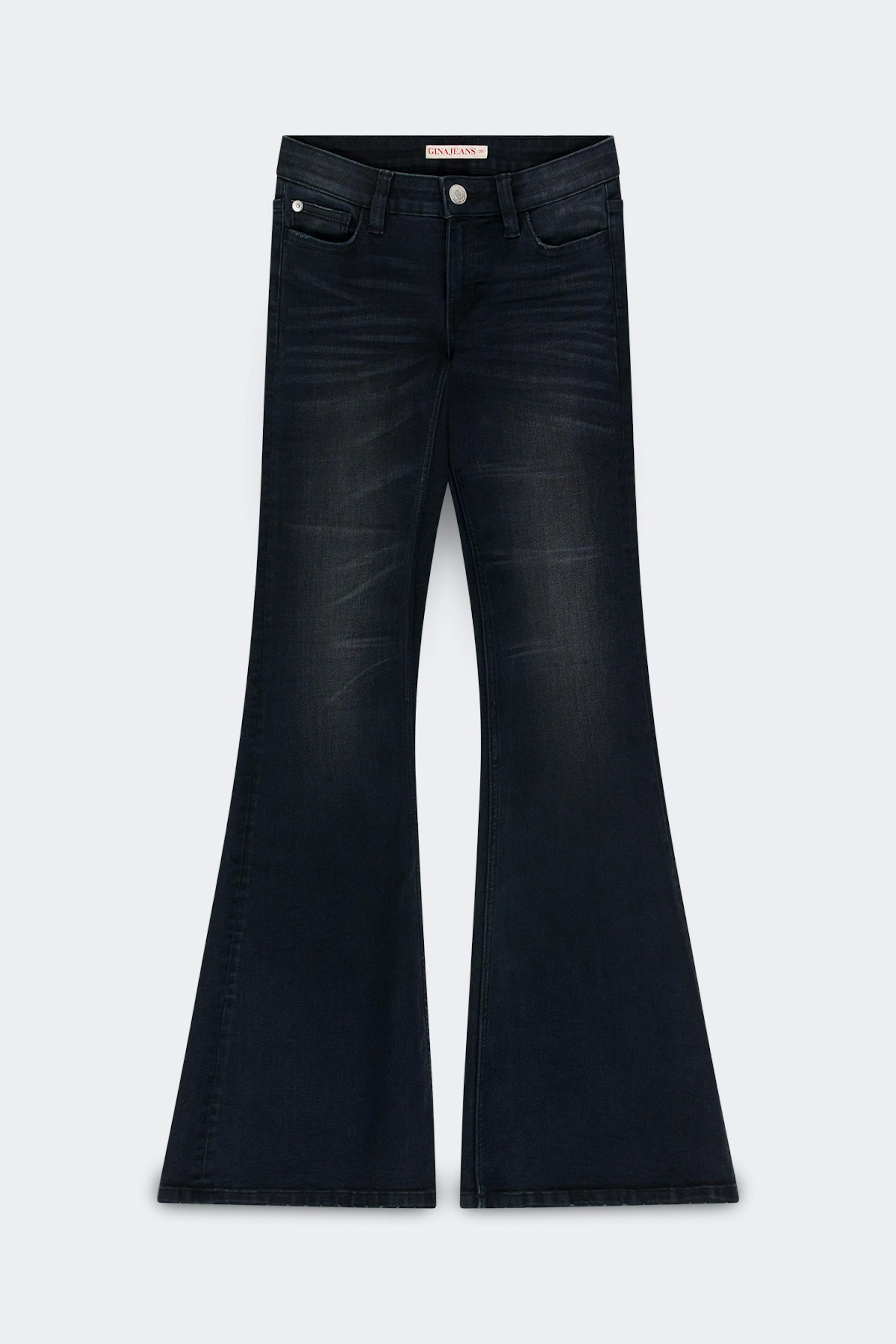 Tall-malliset matalavyötäröiset farkut pitkillä, levenevillä jaloilla. Farkut ovat mustia ja niissä on jousto. Niissä on tyköistuva istuvuus, vetoketjusepalus, taskut edessä ja takana ja vyölenkit. Sinulle, joka olet ainakin 176 cm pitkä. Käytä koko-opastamme oikean koon löytämiseksi.