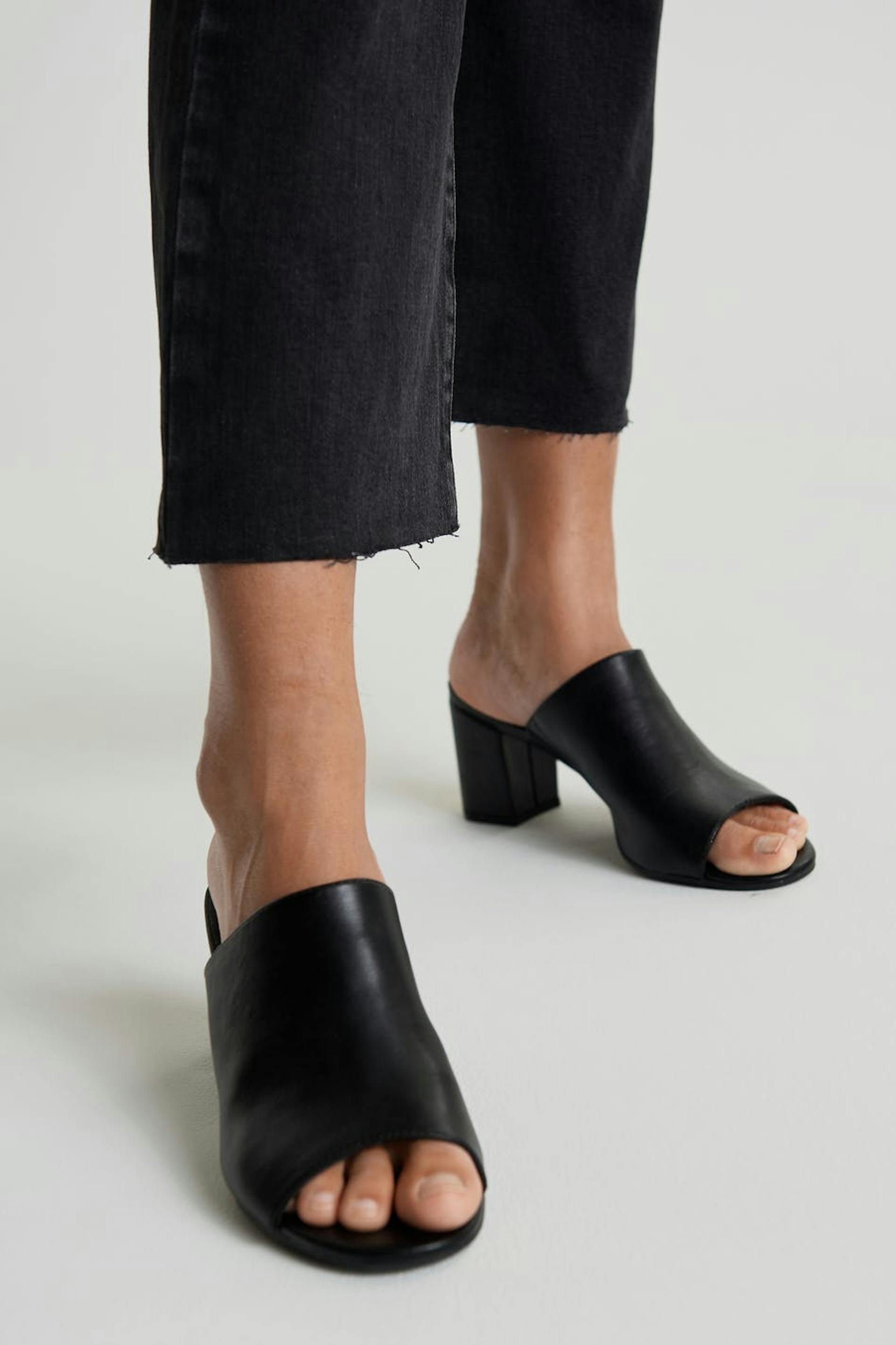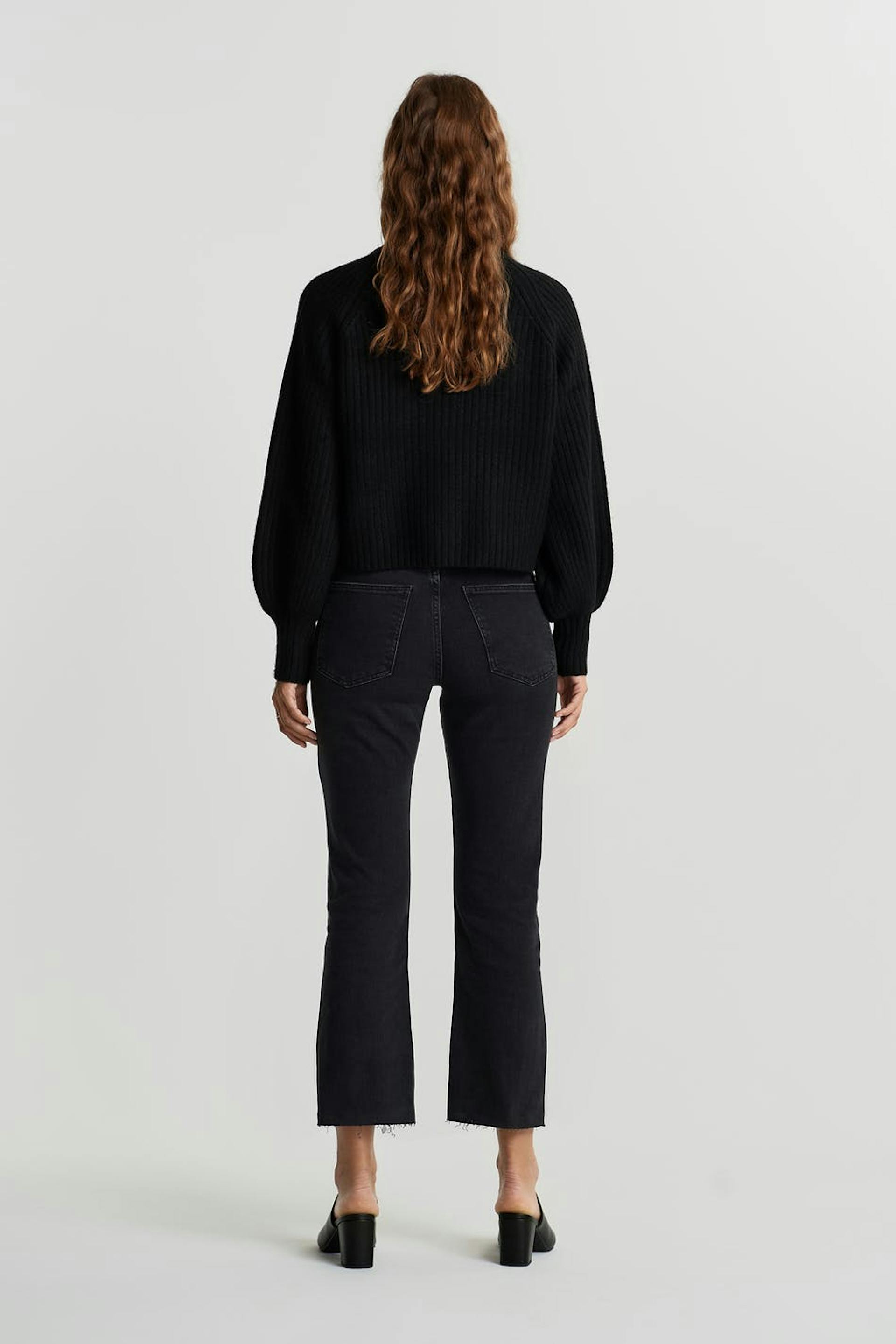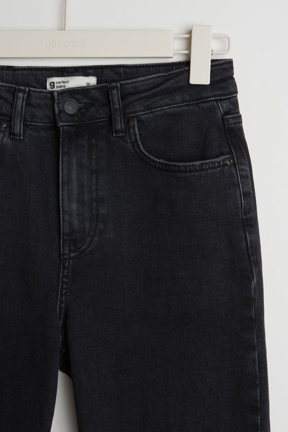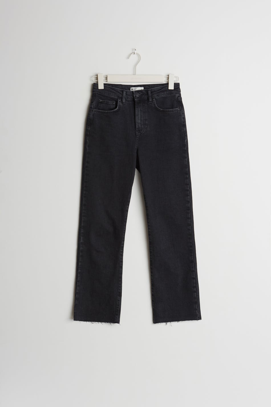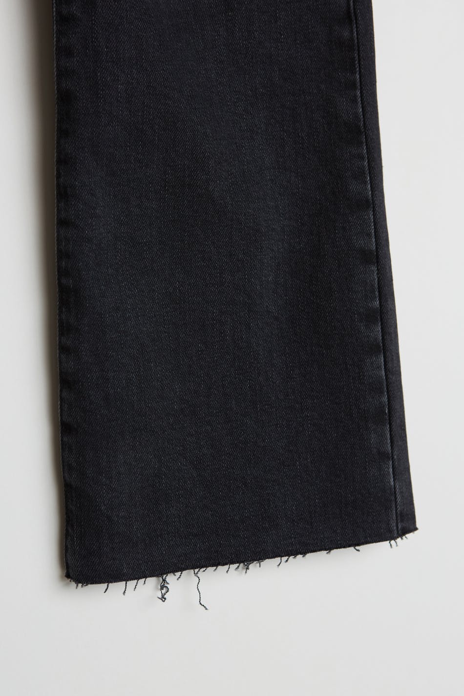 Farkut vartalonmyötäisellä istuvuudella. Farkut ovat mustia ja niissä on keskikorkea vyötärö. Niissä on denimlaatu joustolla, sepalus vetoketjulla ja cropatut, hieman levenevät jalat käsittelemättömillä reunoilla lahkeiden lopuissa. Käytä koko-opastamme oikean koon löytämiseksi..
