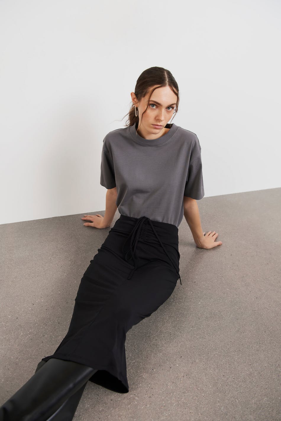 Mallin pituus on 174 cm ja hänellä on päällä koko S