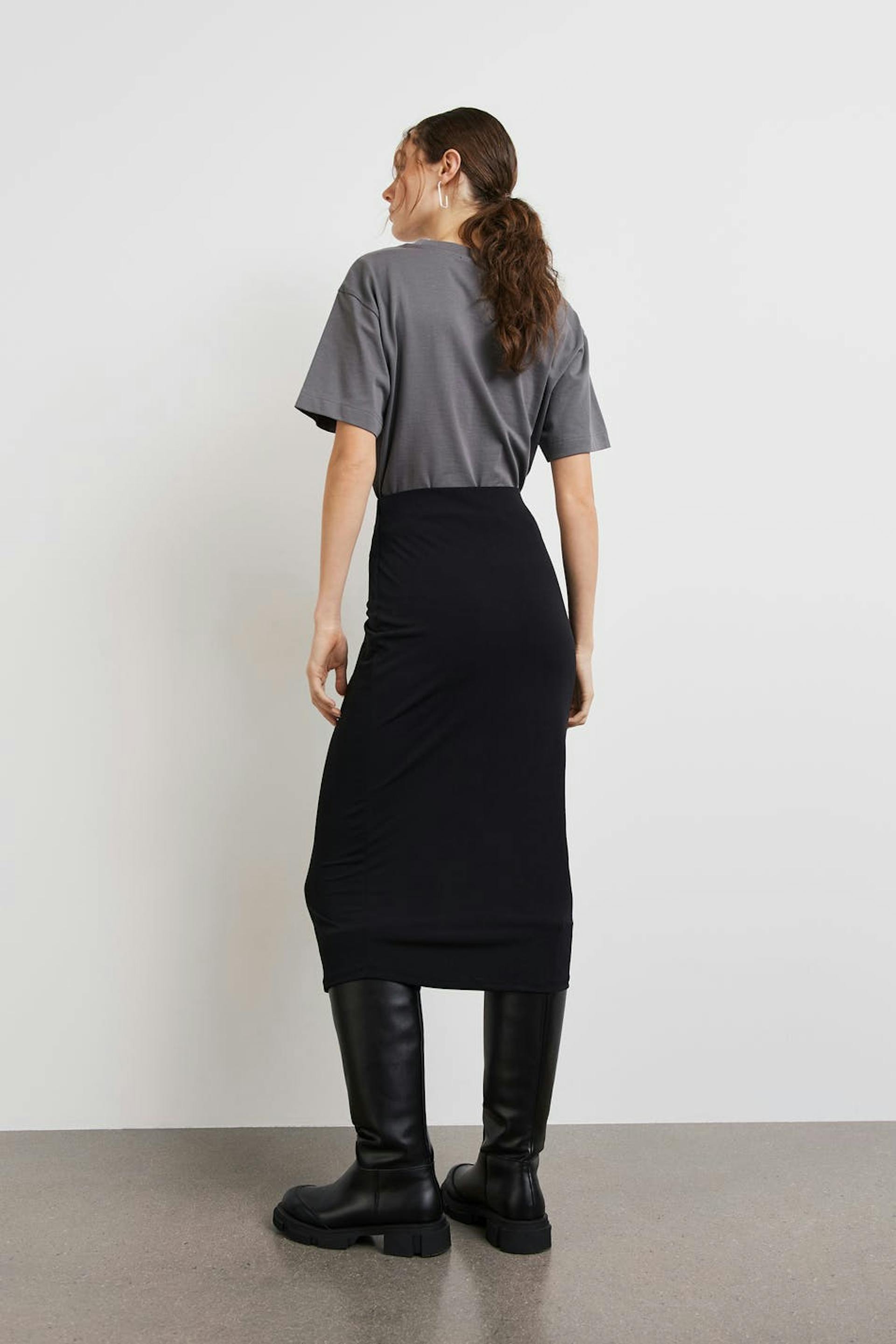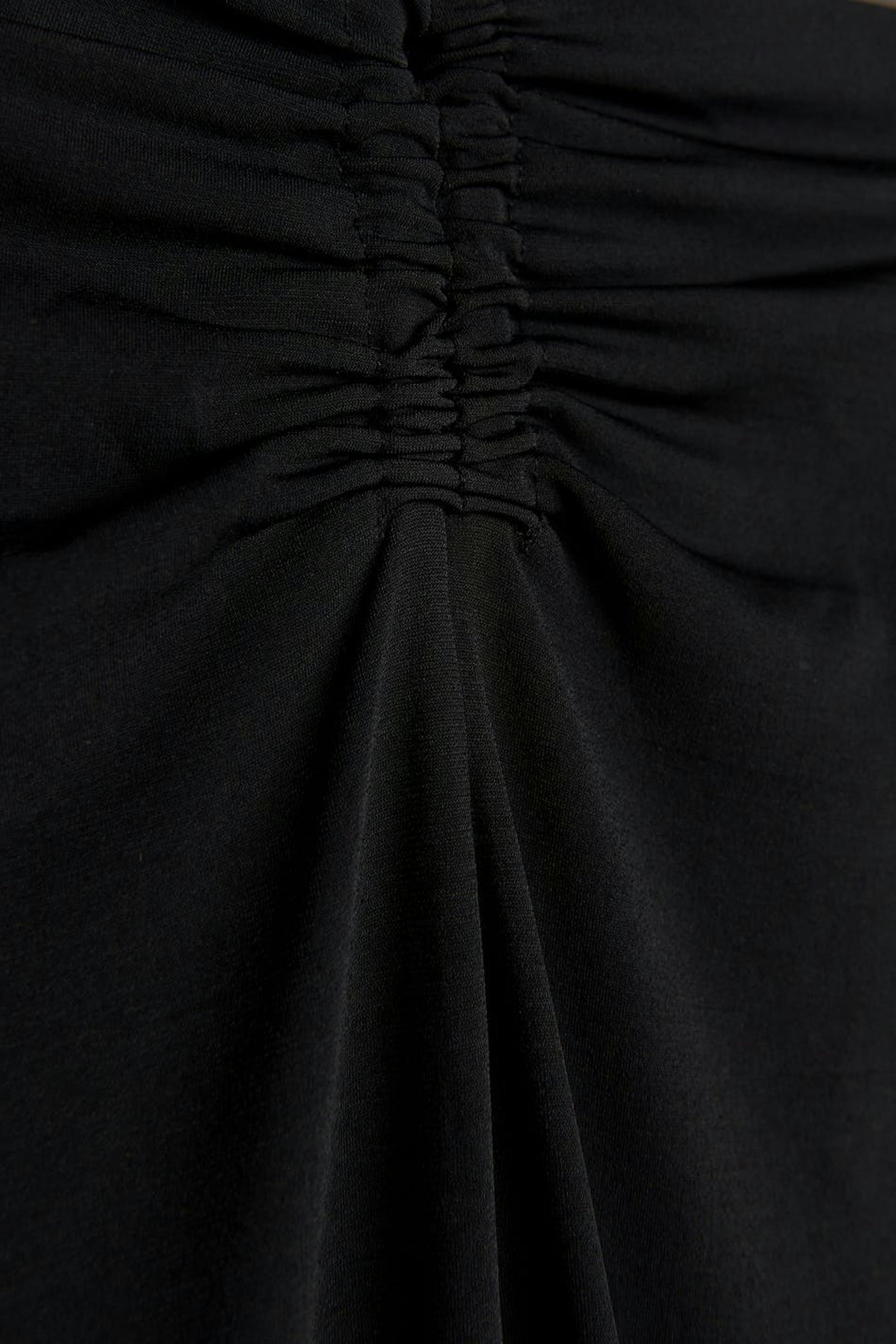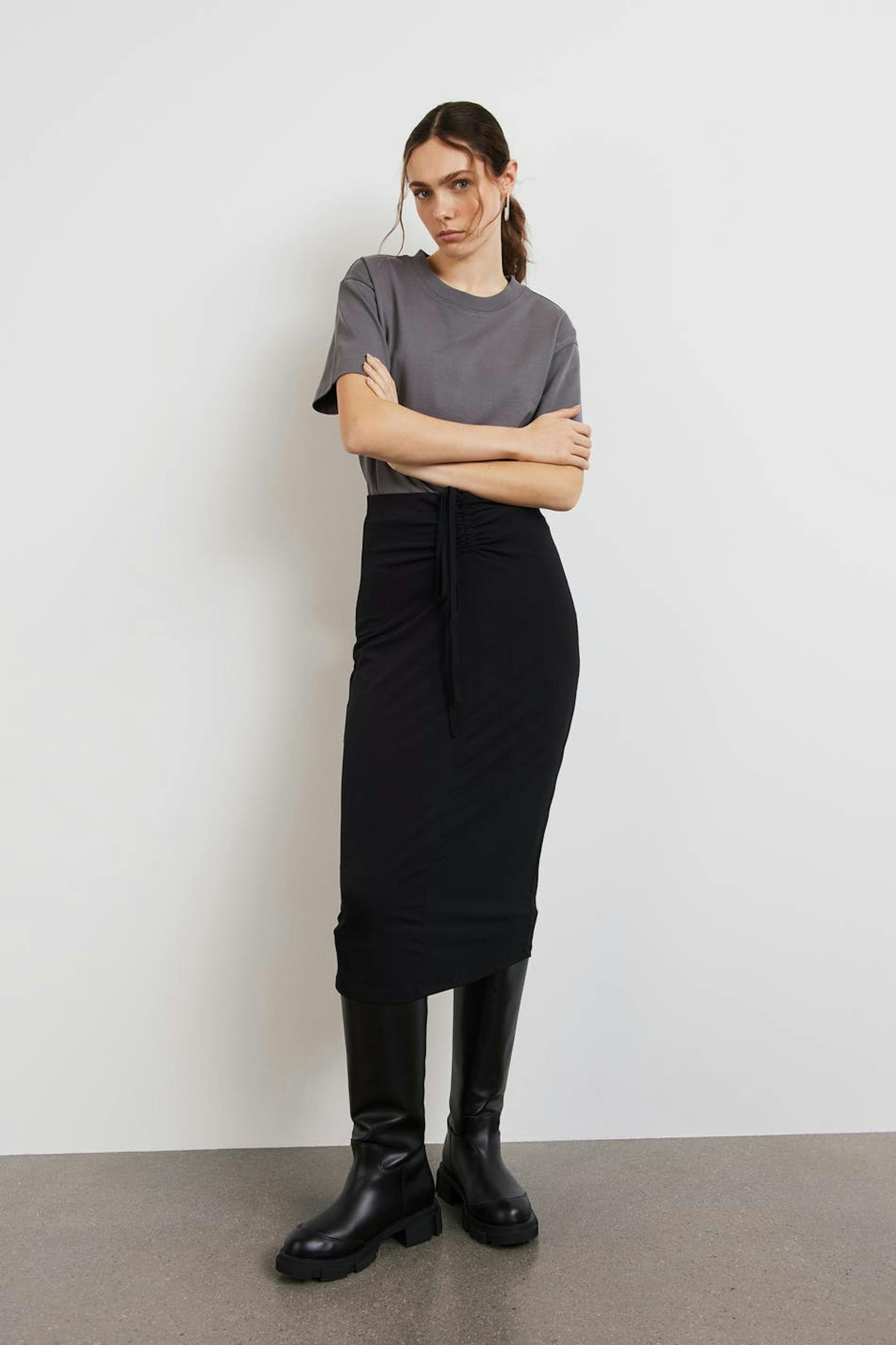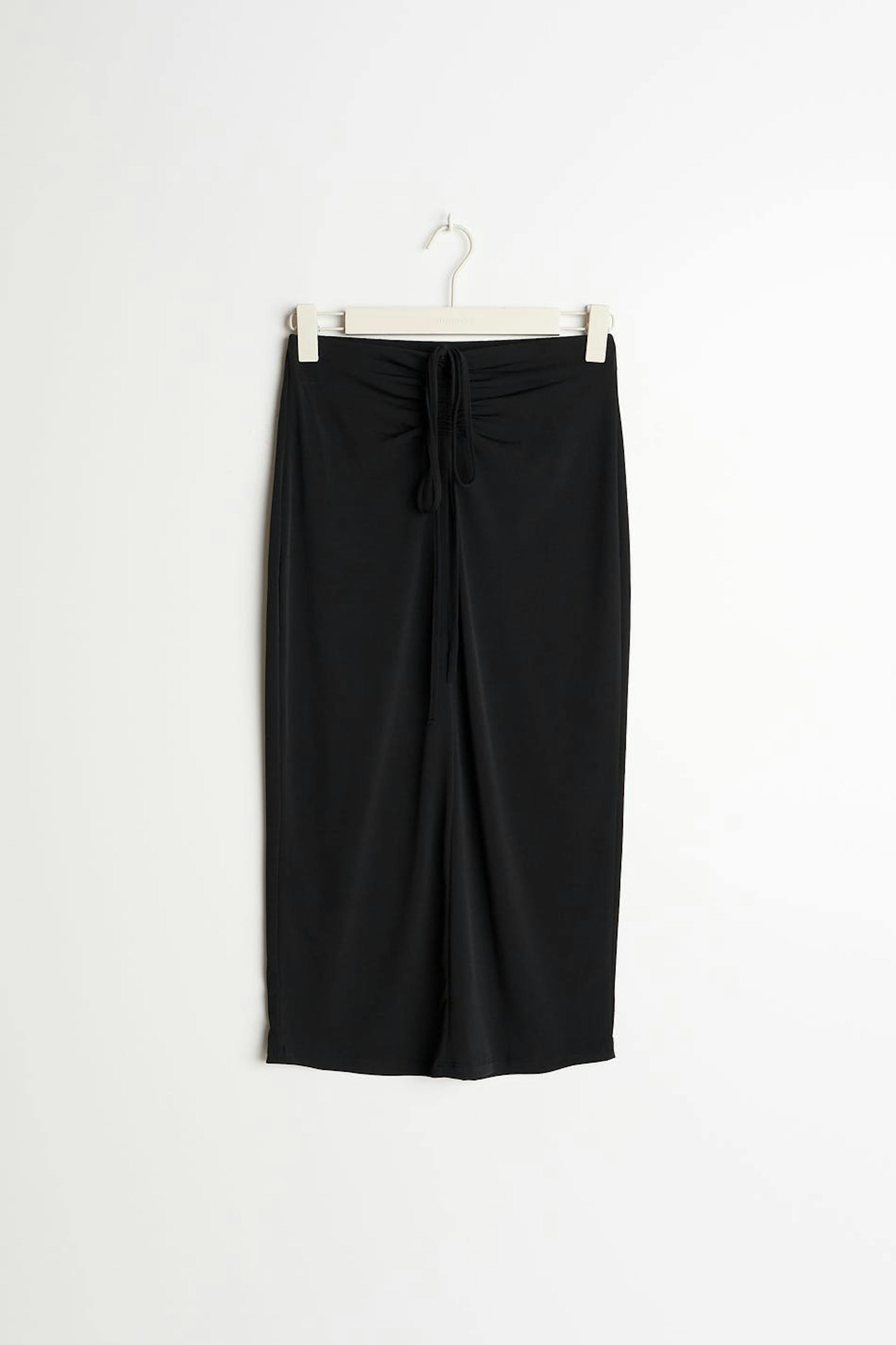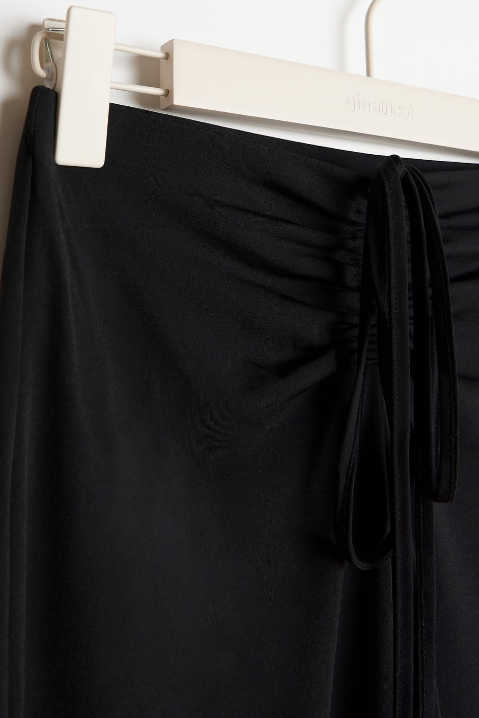 Hame trikoosta normaalilla istuvuudella. Hame on musta ja siinä on poimutetut yksityiskohdat solmittavalla vyöllä edessä.