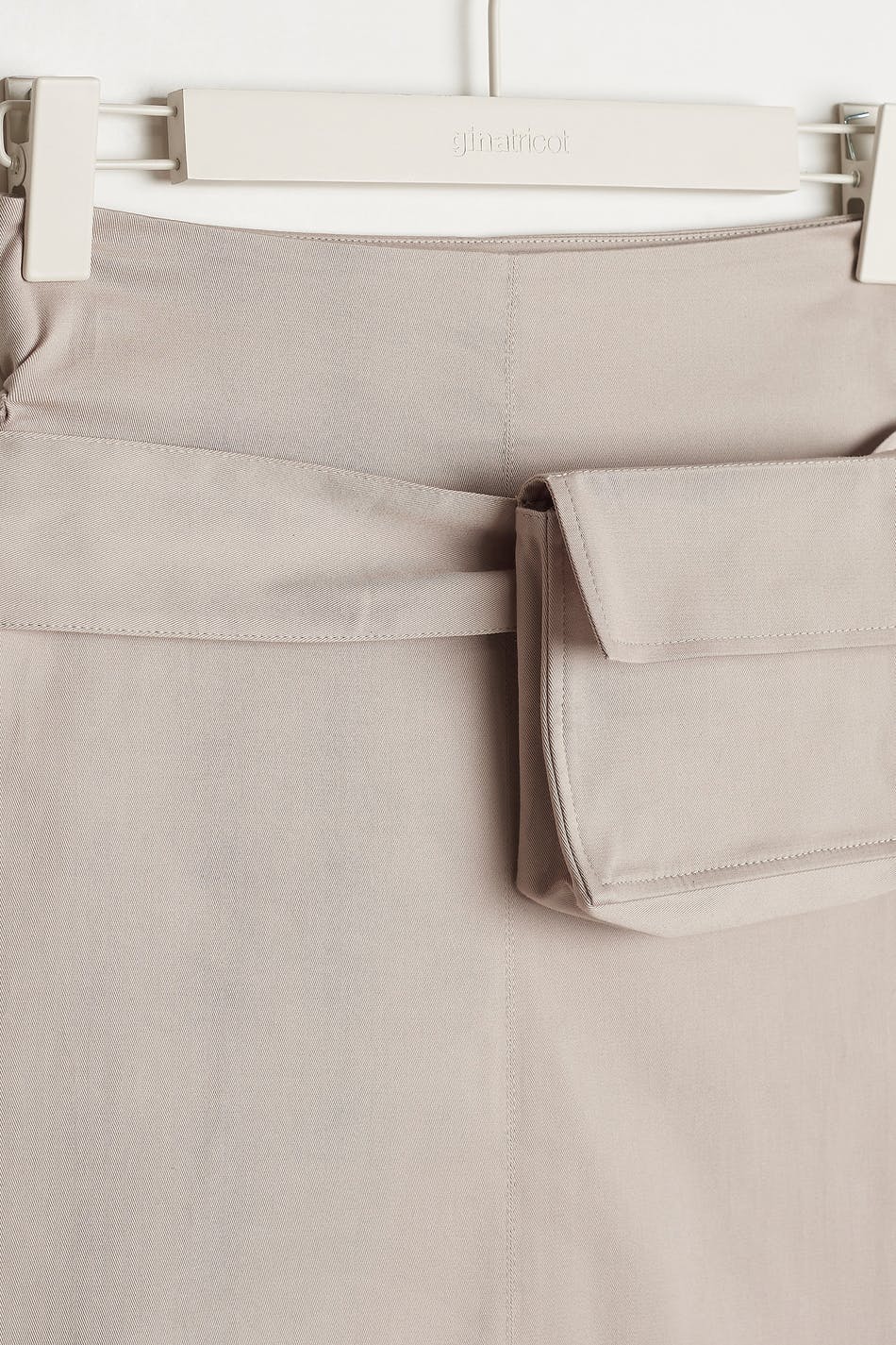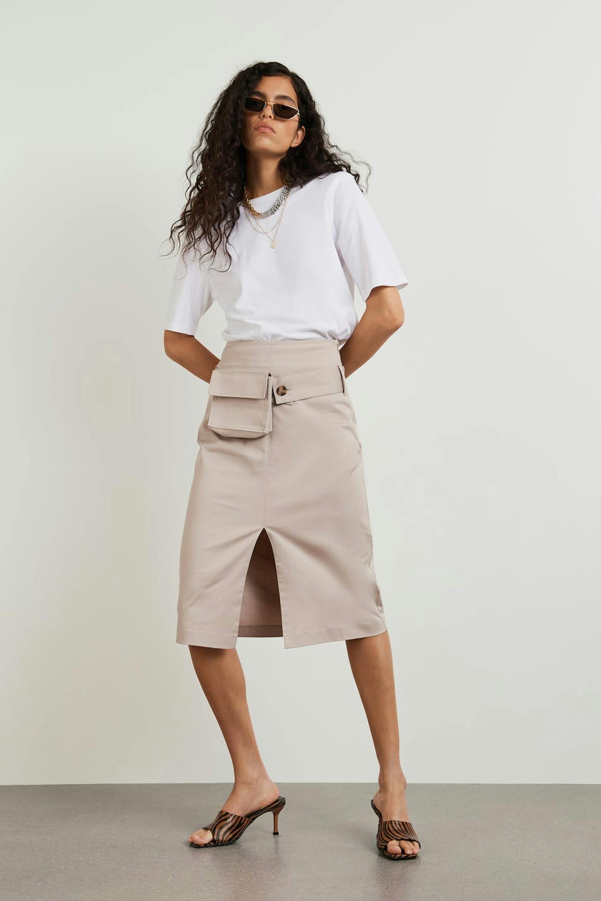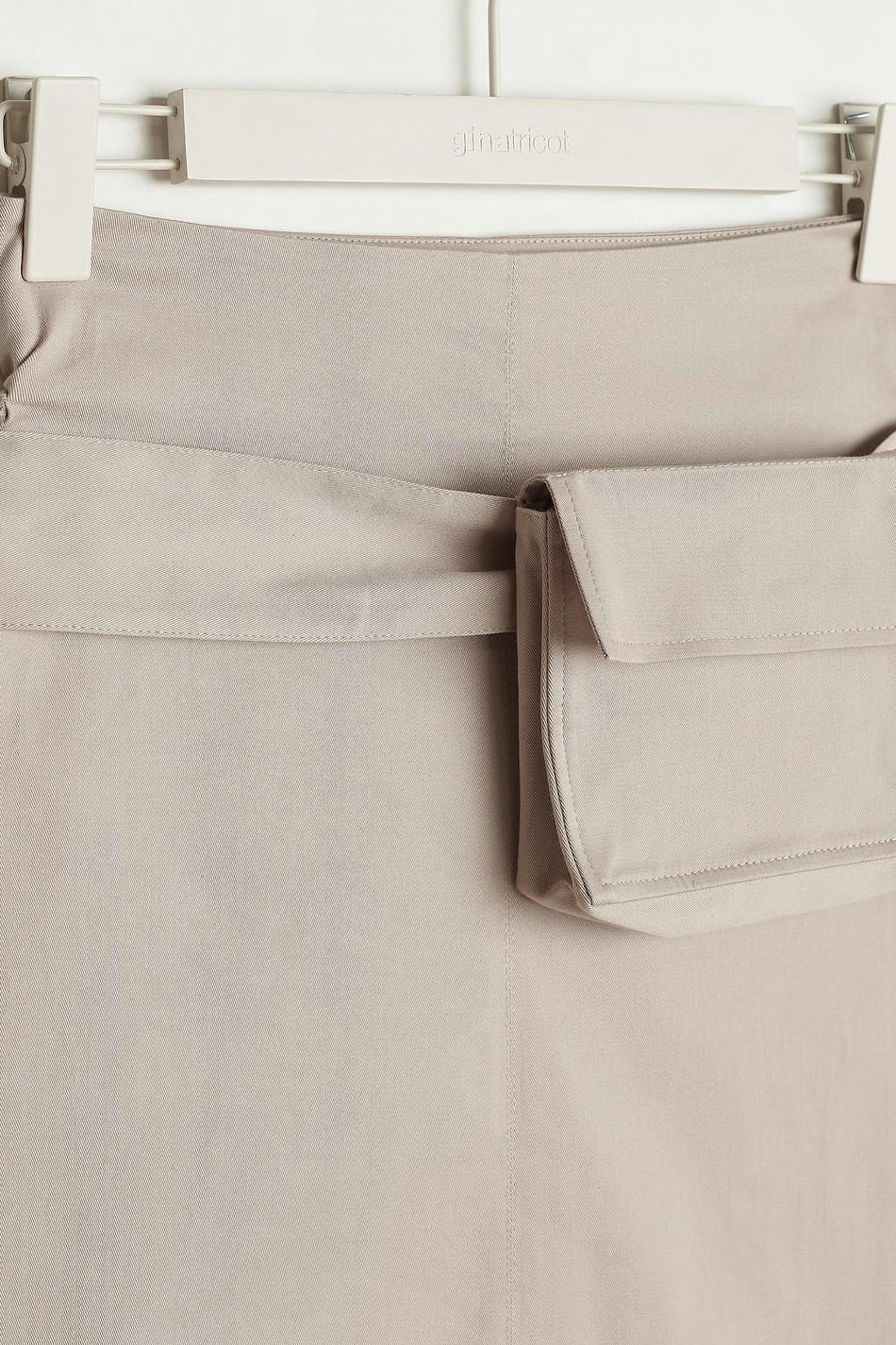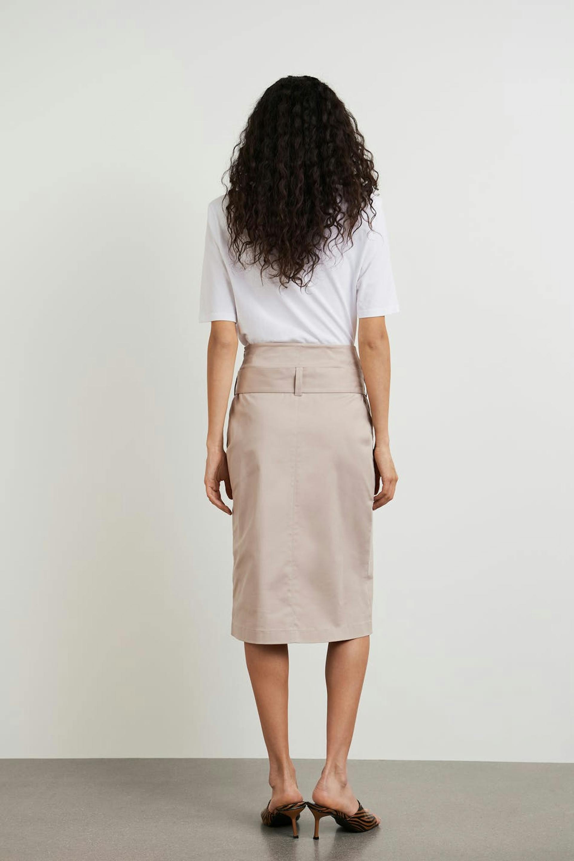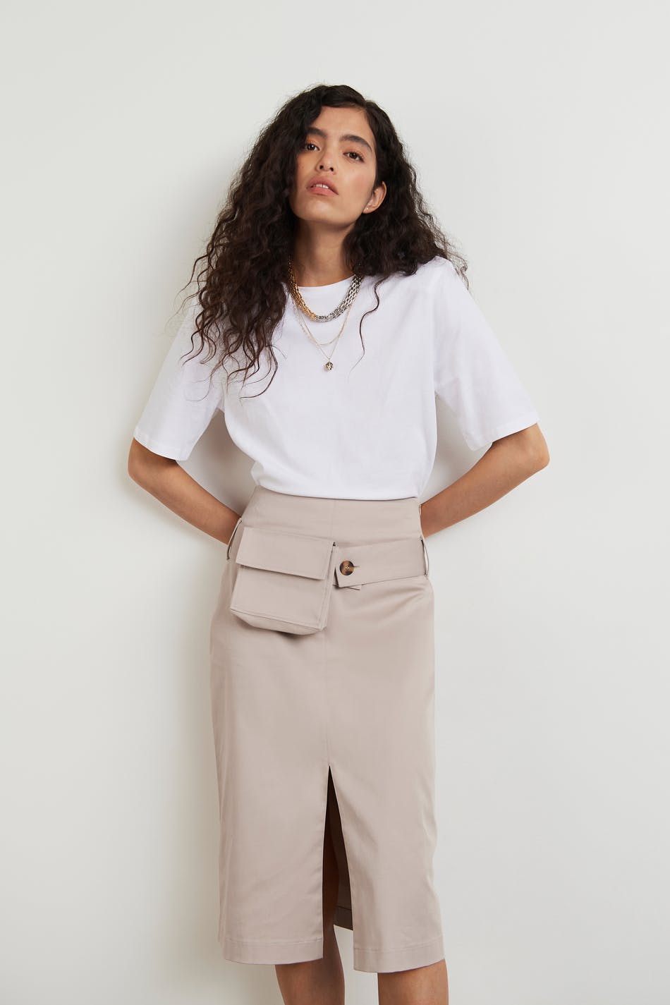 Hame halkiolla edessä. Hame on beige ja siinä on vyö etutaskulla. Siinä on korkea vyötärö, midi-pituus ja kätketty vetoketju sivusaumassa.