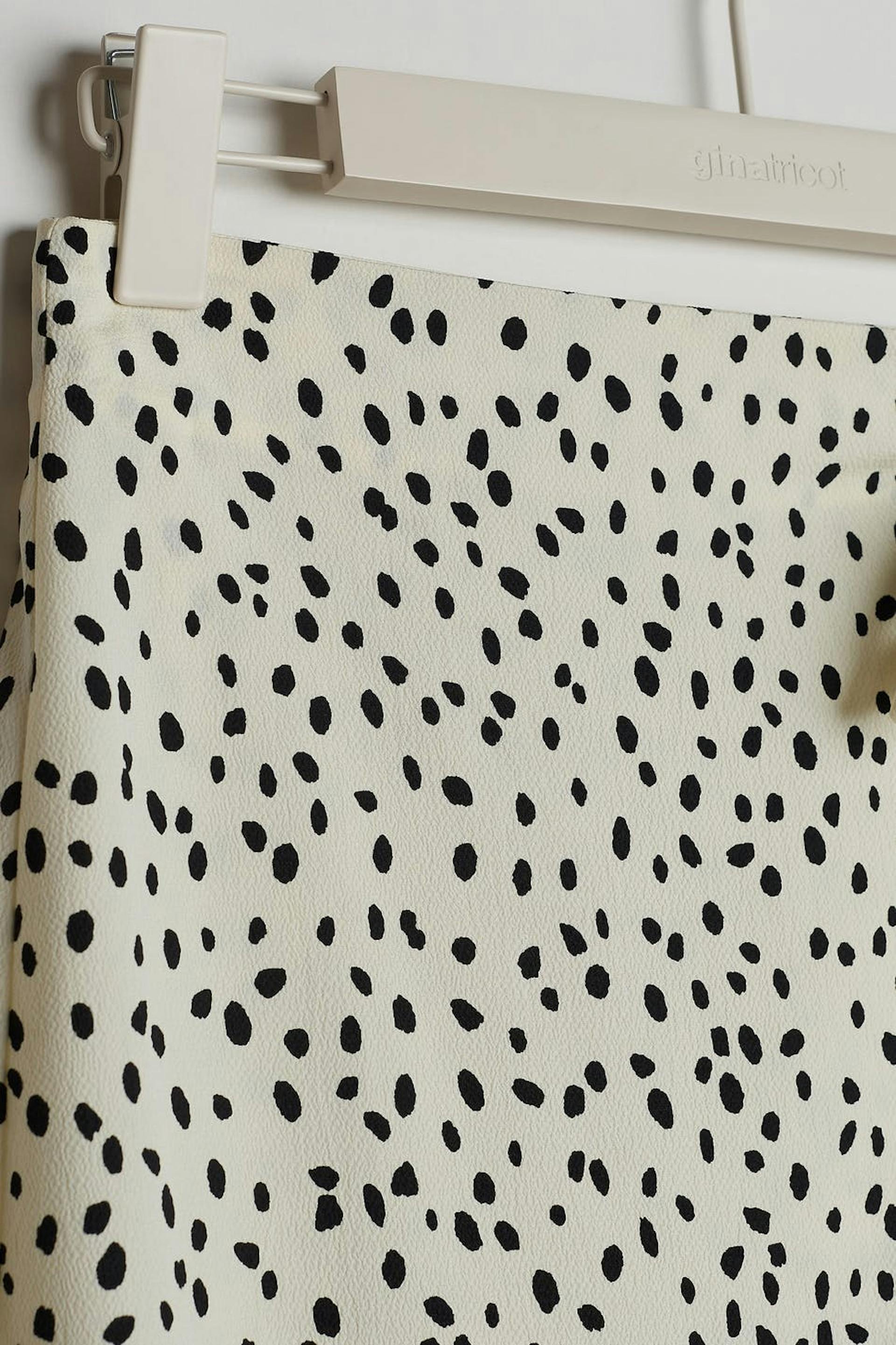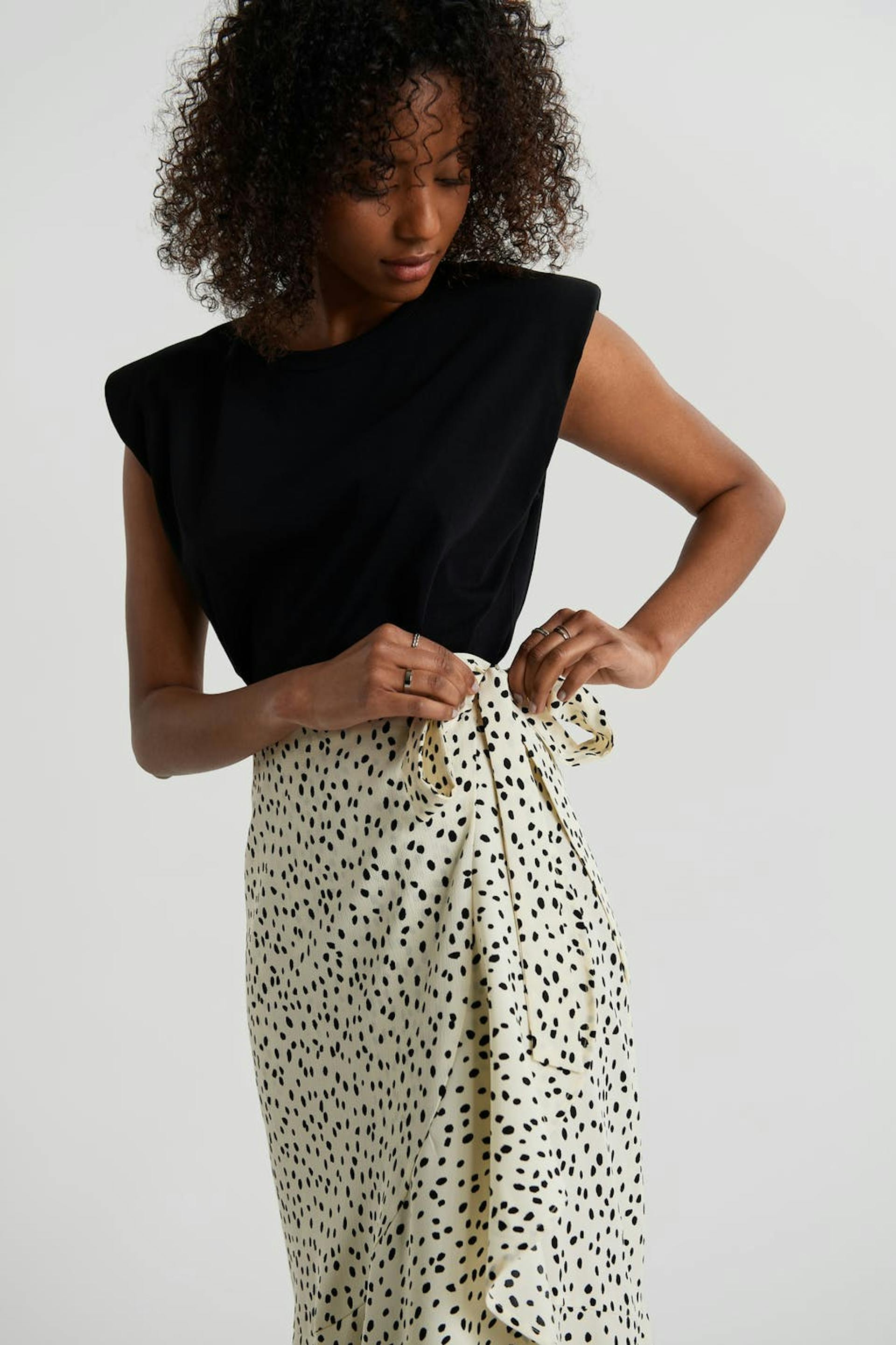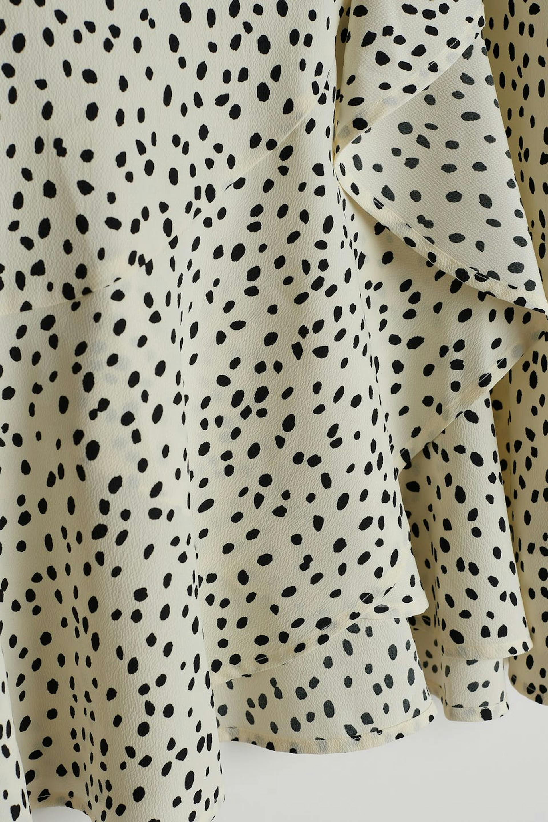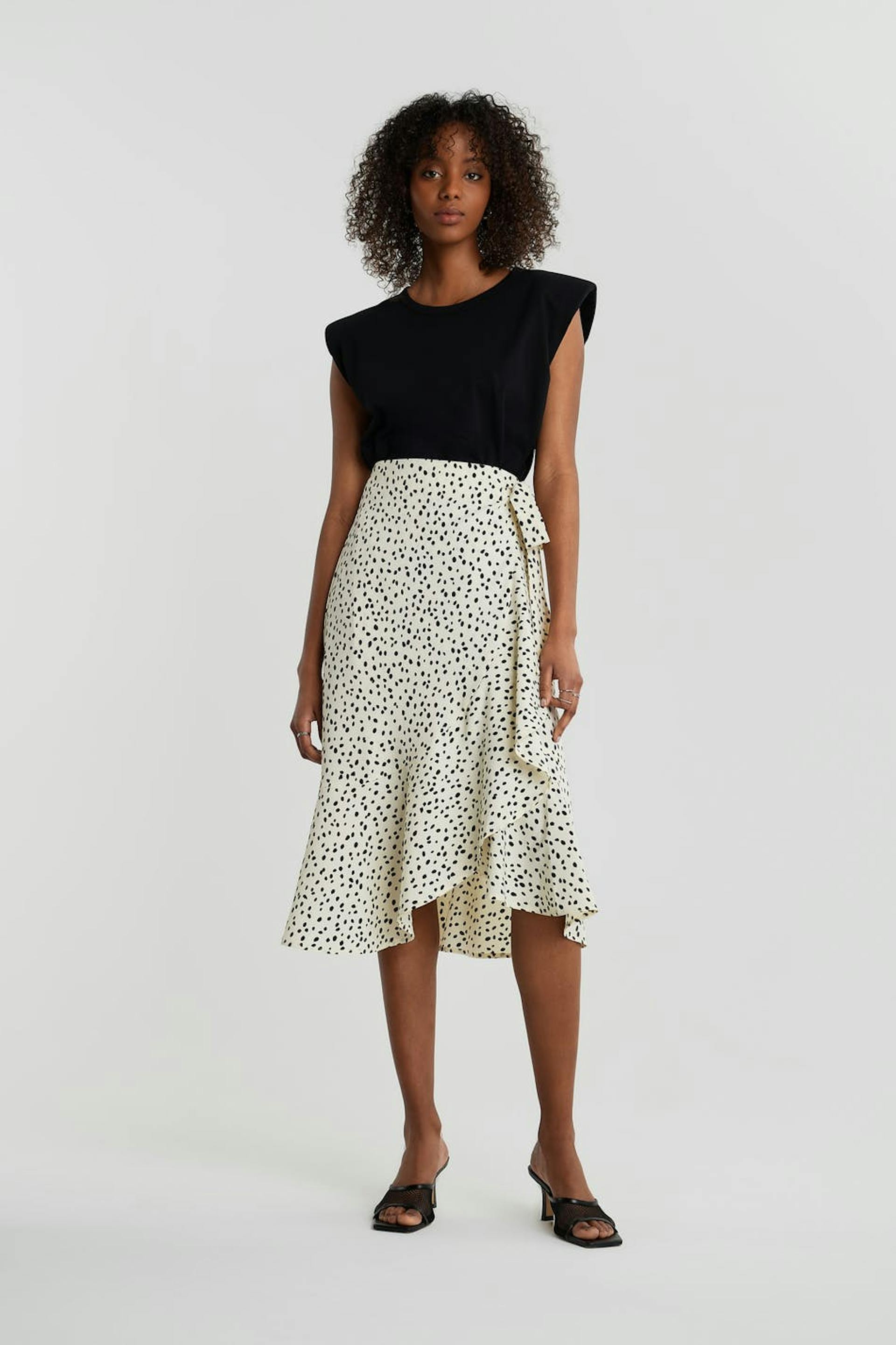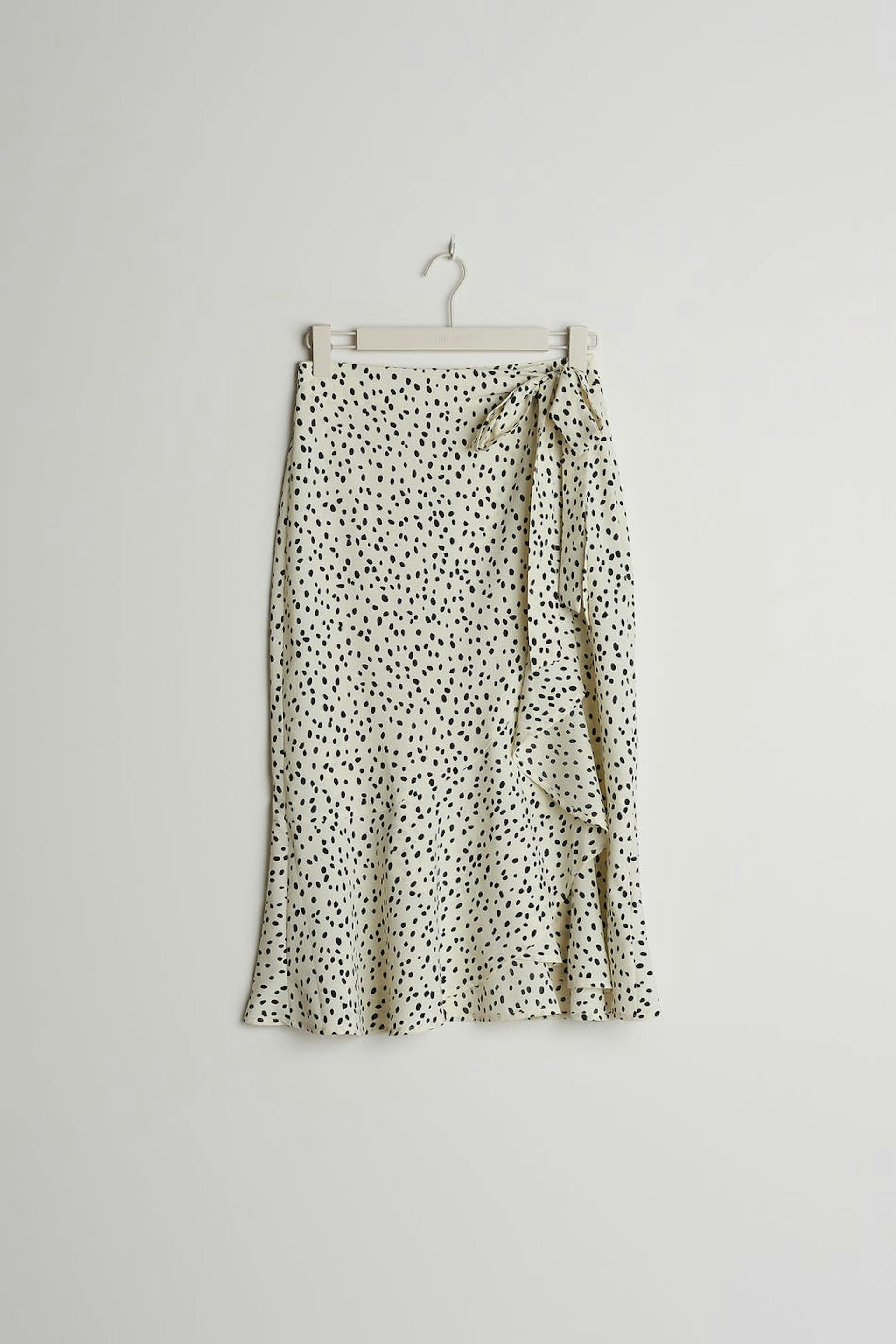 Kietaisuhame mustilla pilkuilla. Hame on valkoinen ja siinä on solmittava vyö yhdellä sivulla. Siinä on röyhelöt helmassa, midi-pituus ja satiinimainen materiaali.