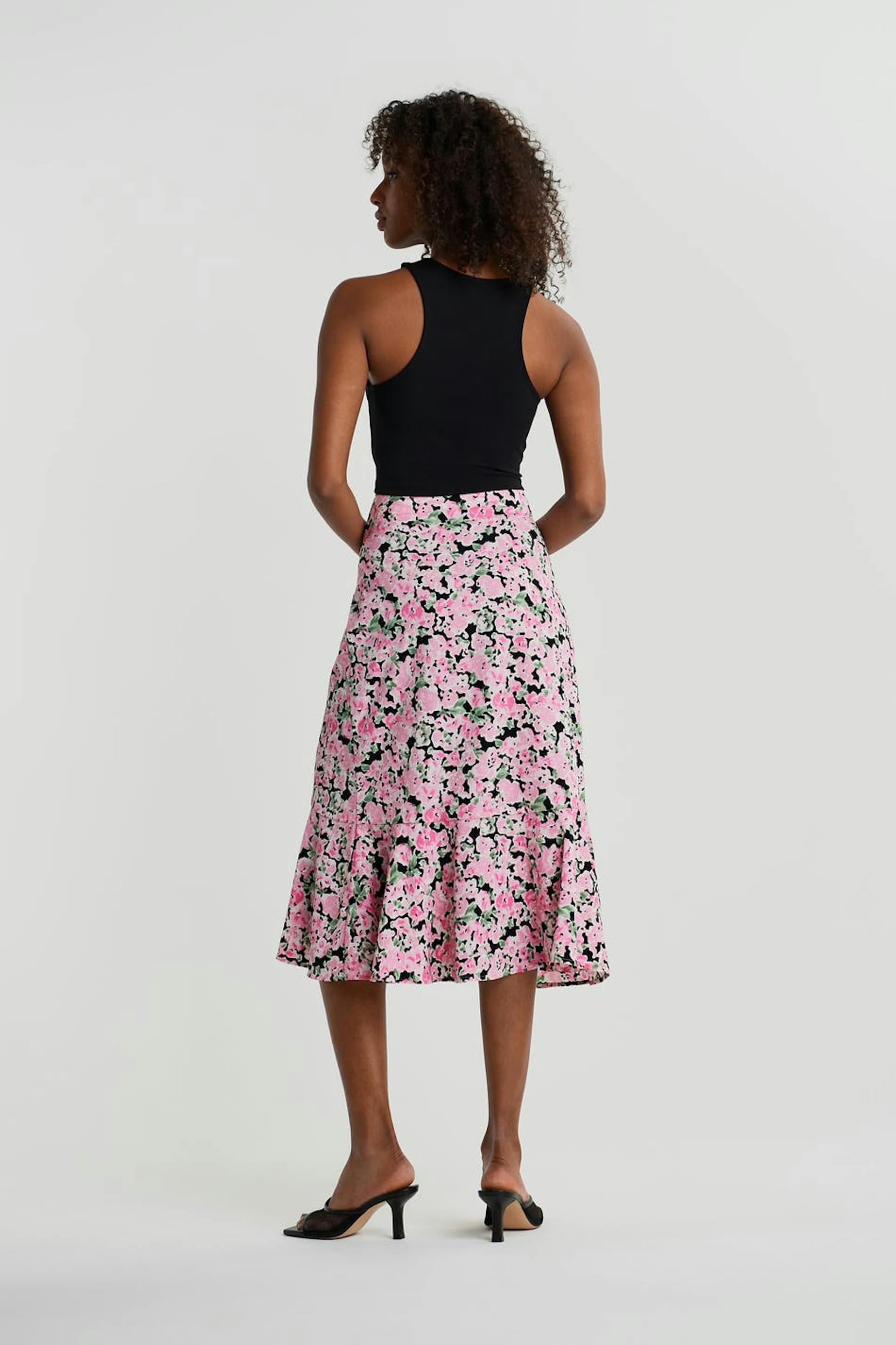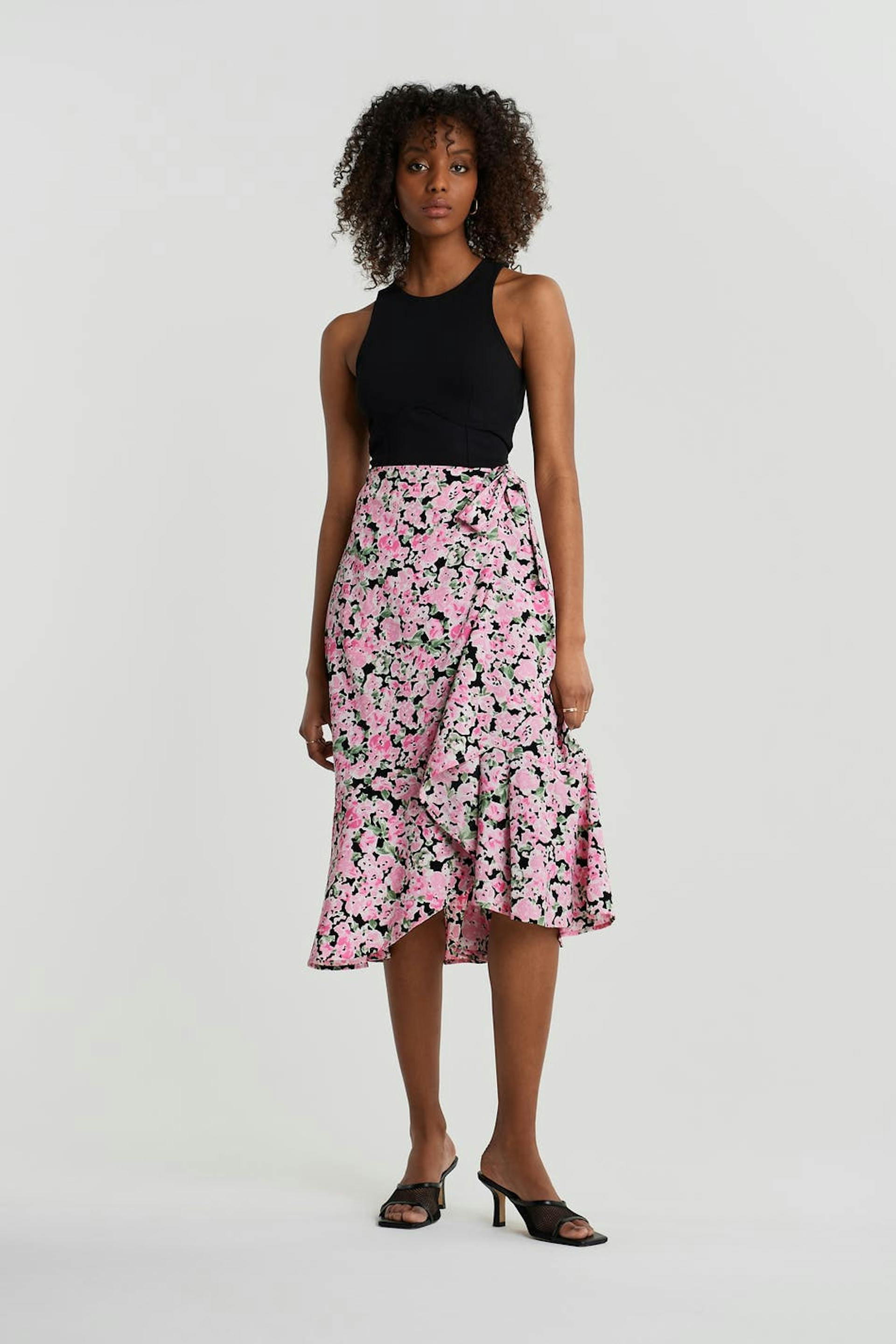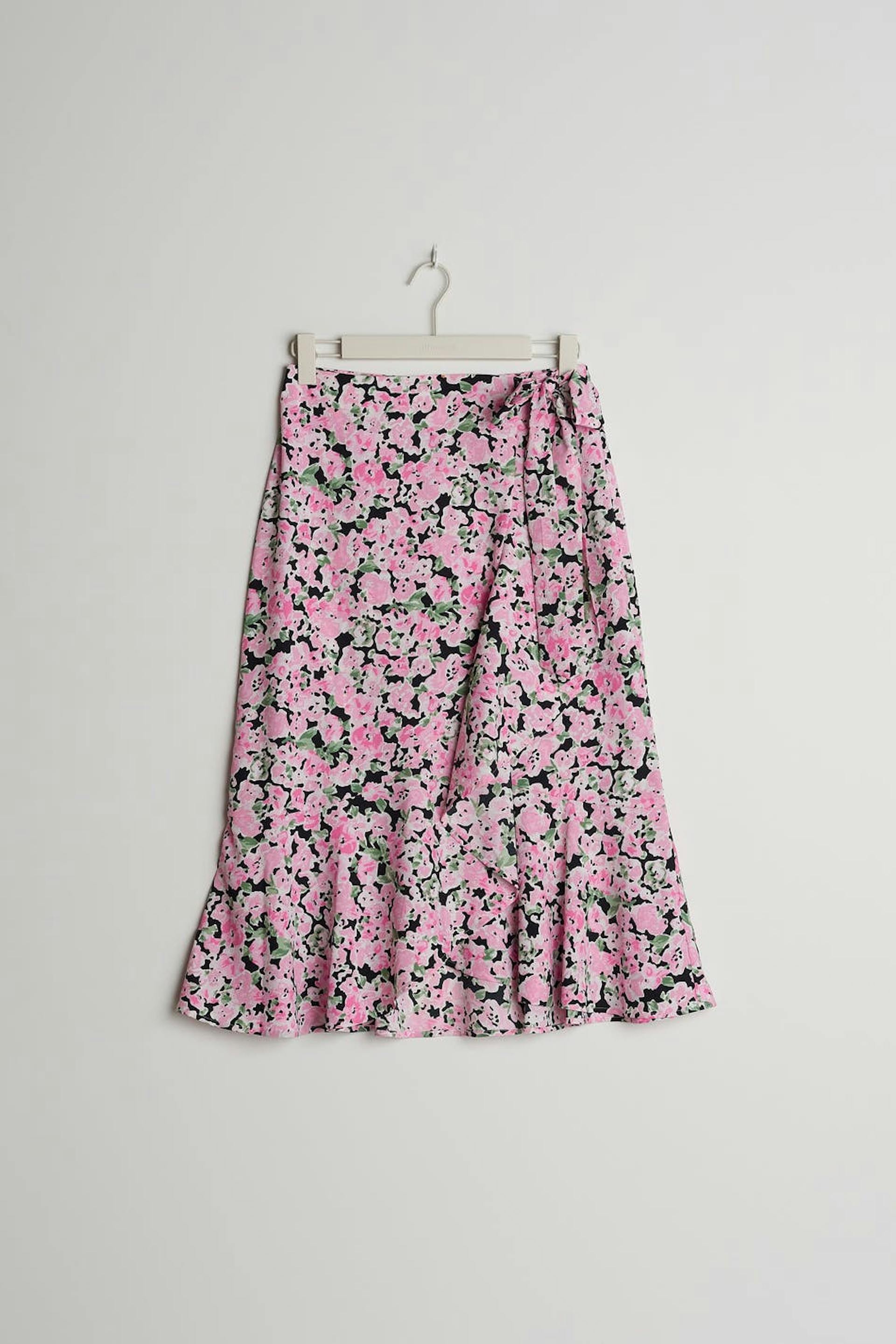 Kukallinen kietaisuhame solmittavalla vyöllä yhdellä sivulla. Hame on pinkki ja siinä on röyhelöt helmassa. Siinä on midi-pituus ja satiinimainen materiaali.