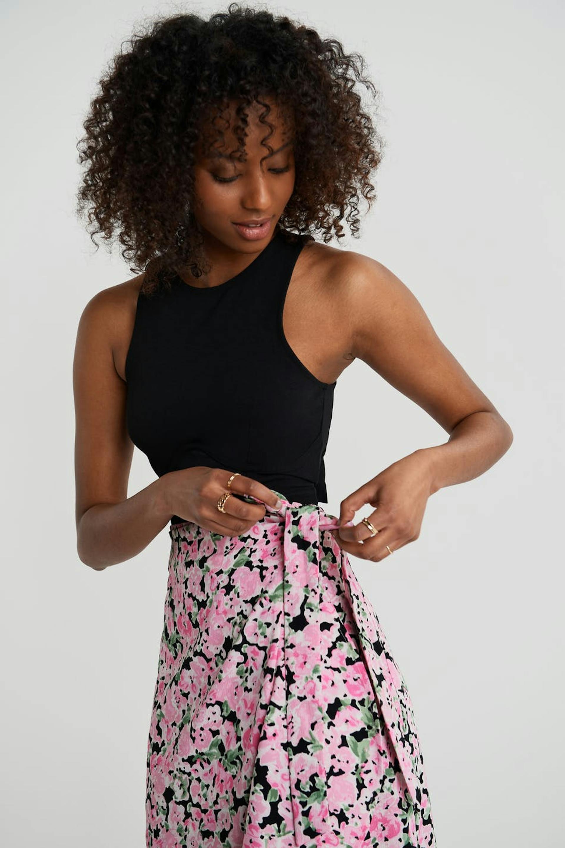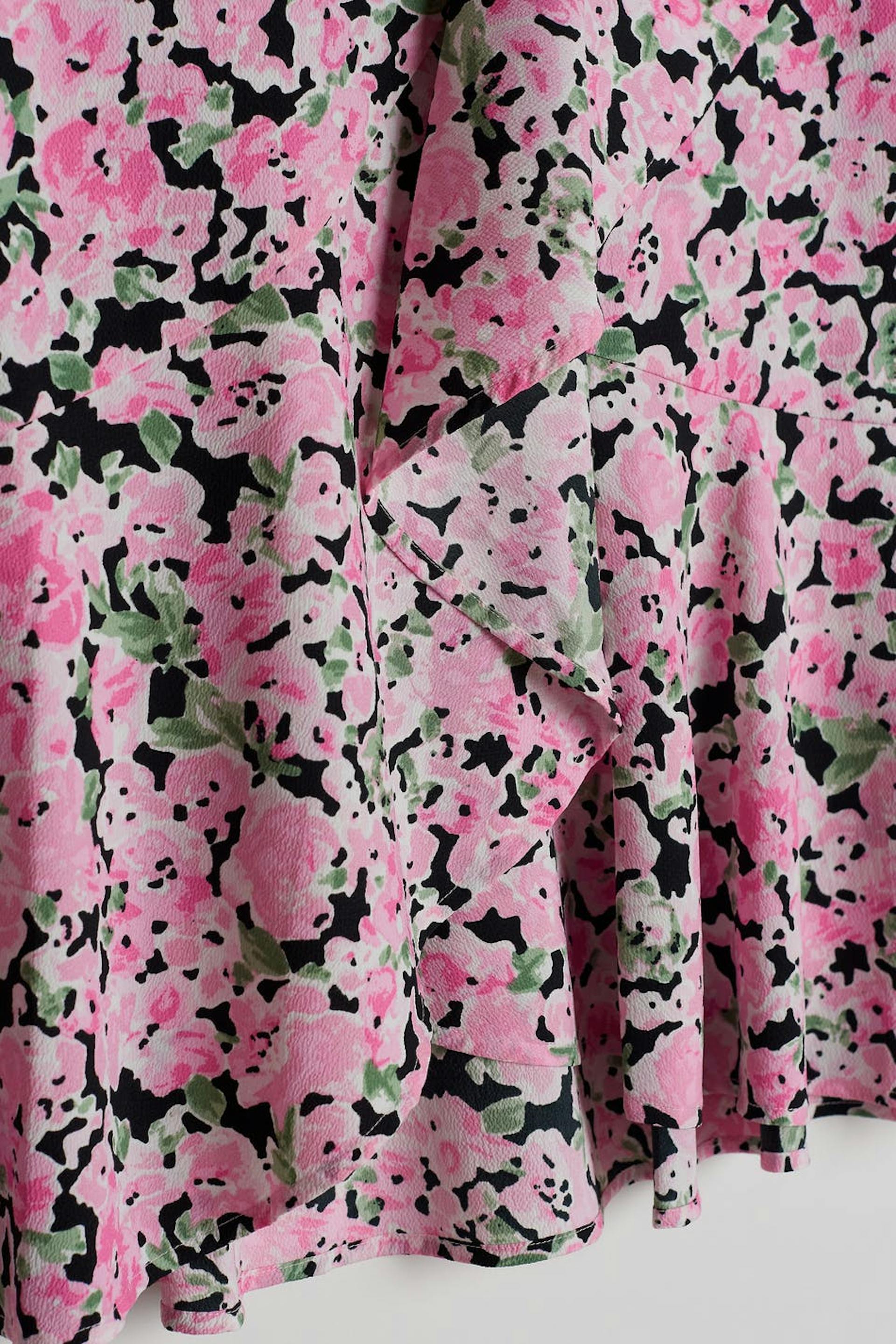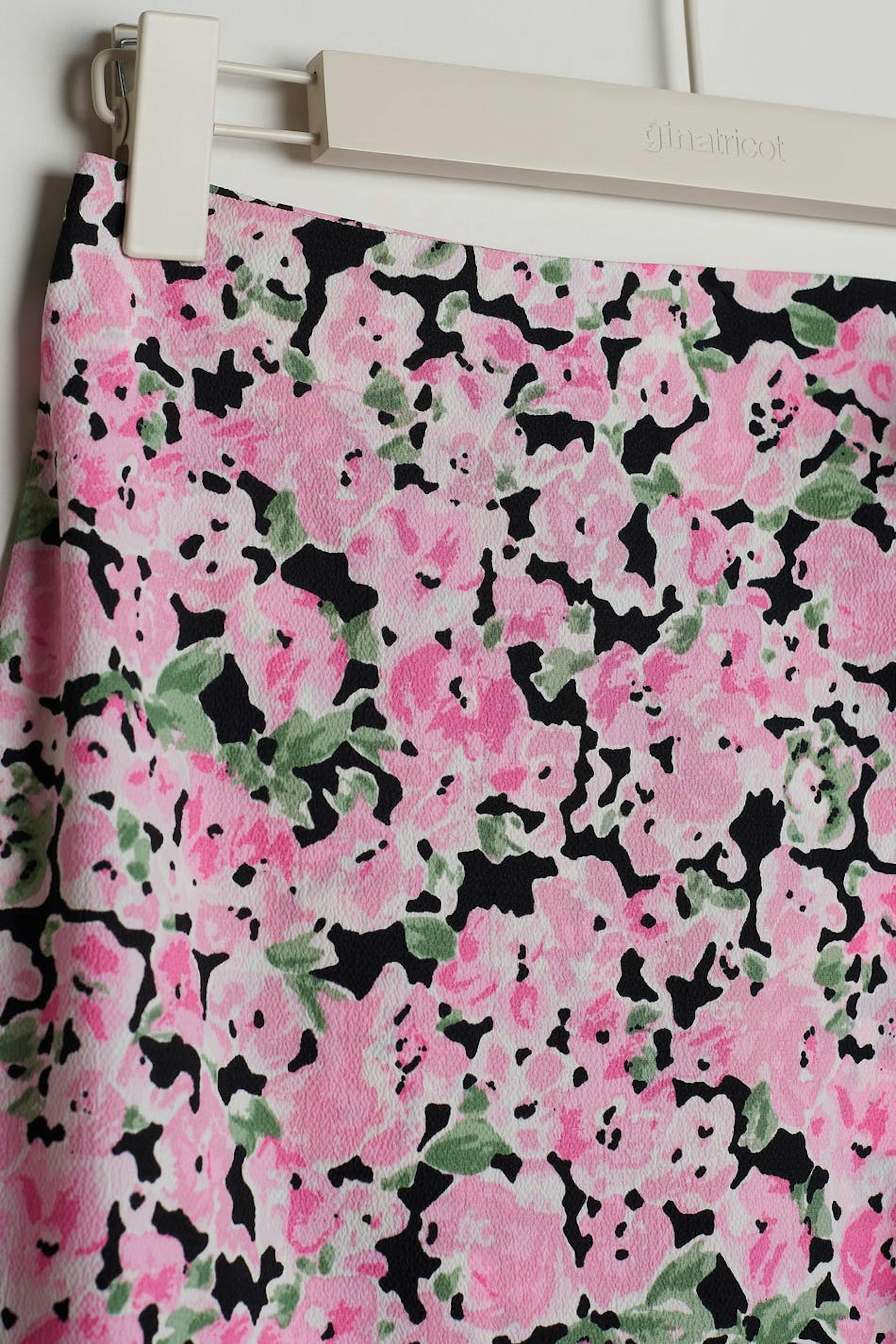 Kukallinen kietaisuhame solmittavalla vyöllä yhdellä sivulla. Hame on pinkki ja siinä on röyhelöt helmassa. Siinä on midi-pituus ja satiinimainen materiaali.