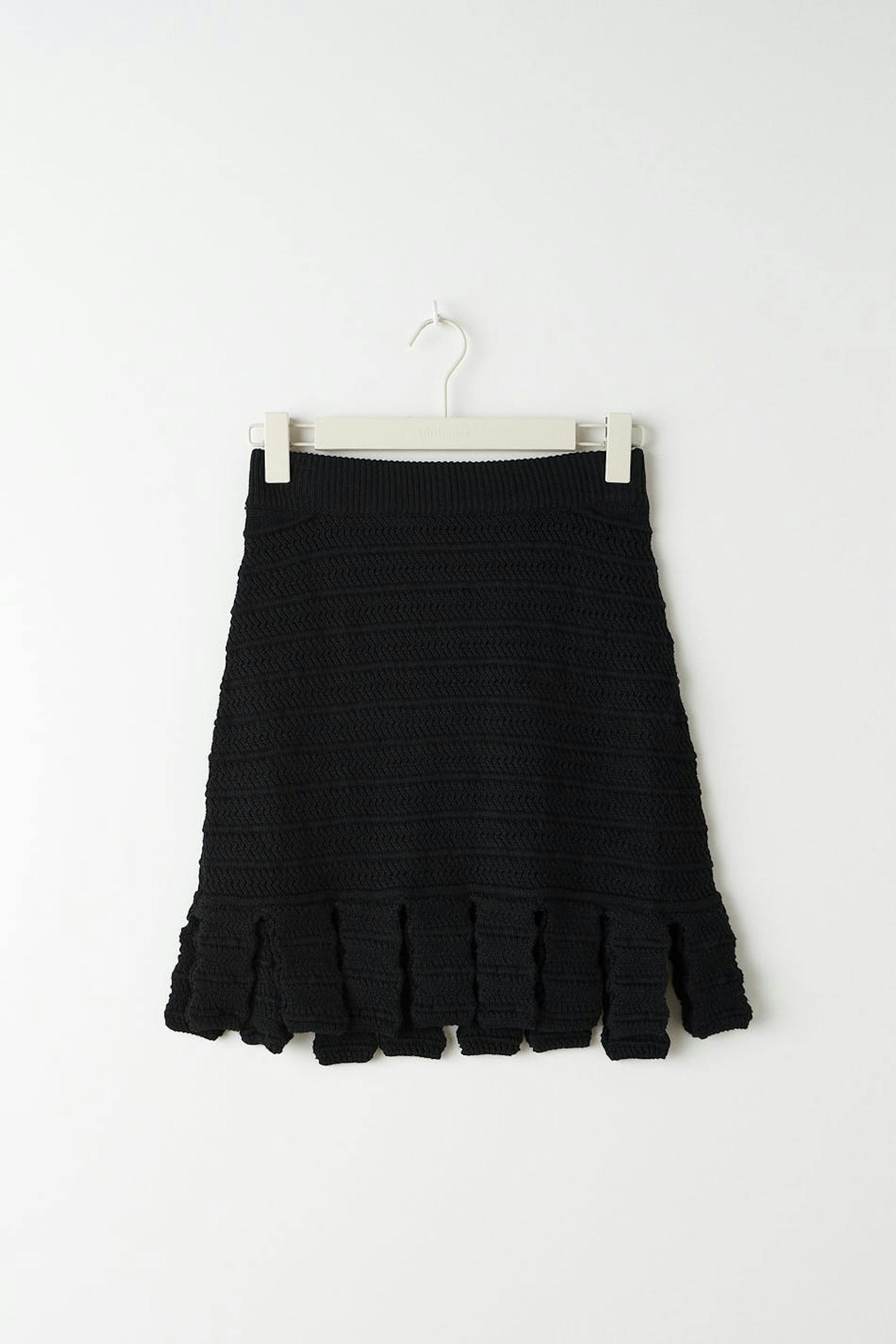 Neulottu minihame leveillä, neulotuilla hapsuilla alhaalla. Hame on musta ja siinä on korkea vyötärö kuminauhalla.
