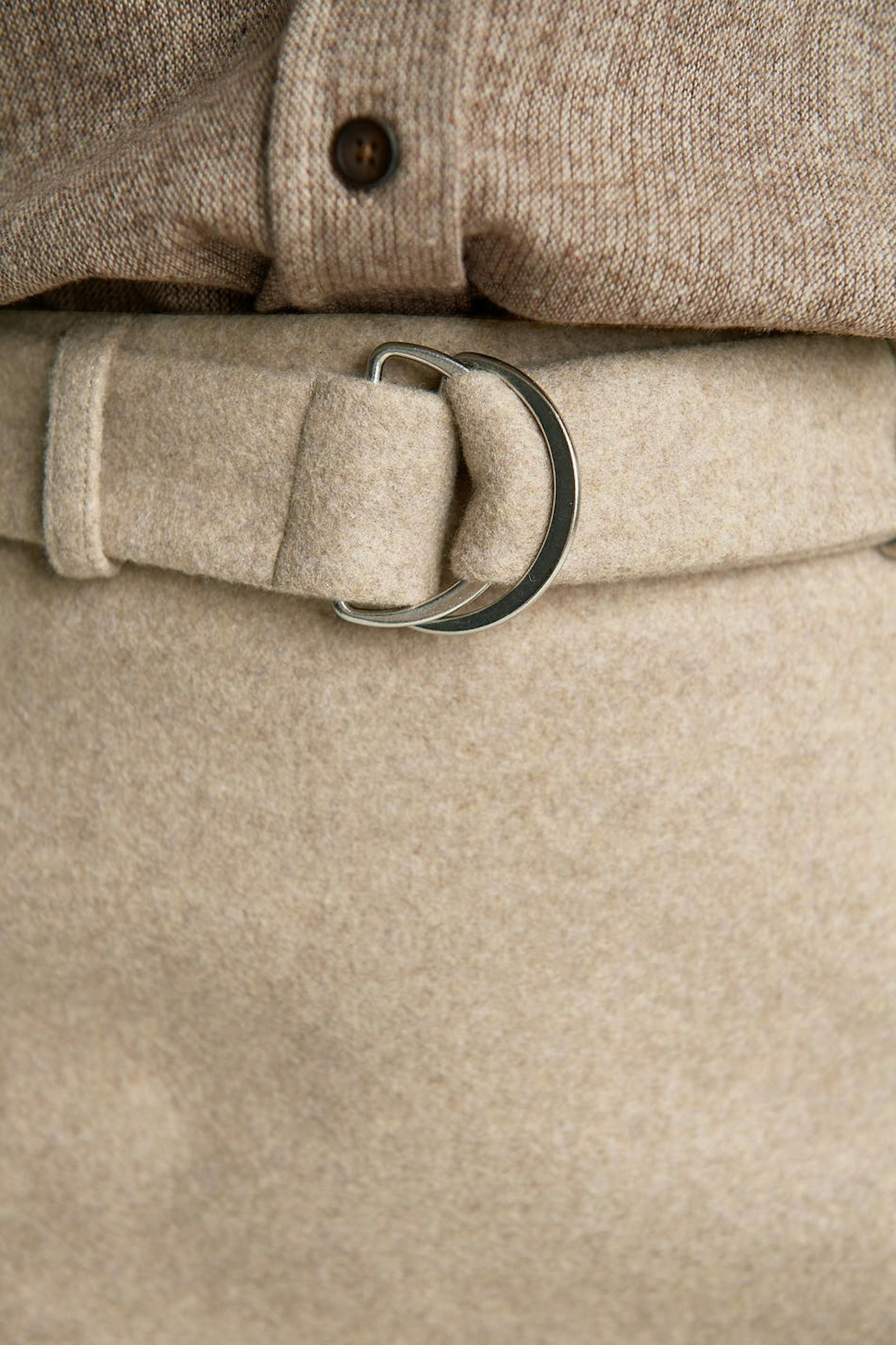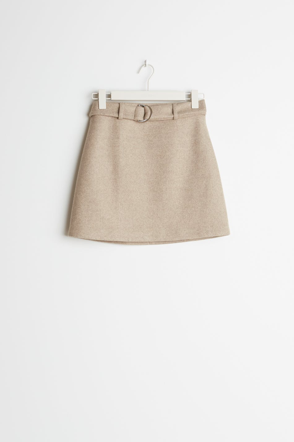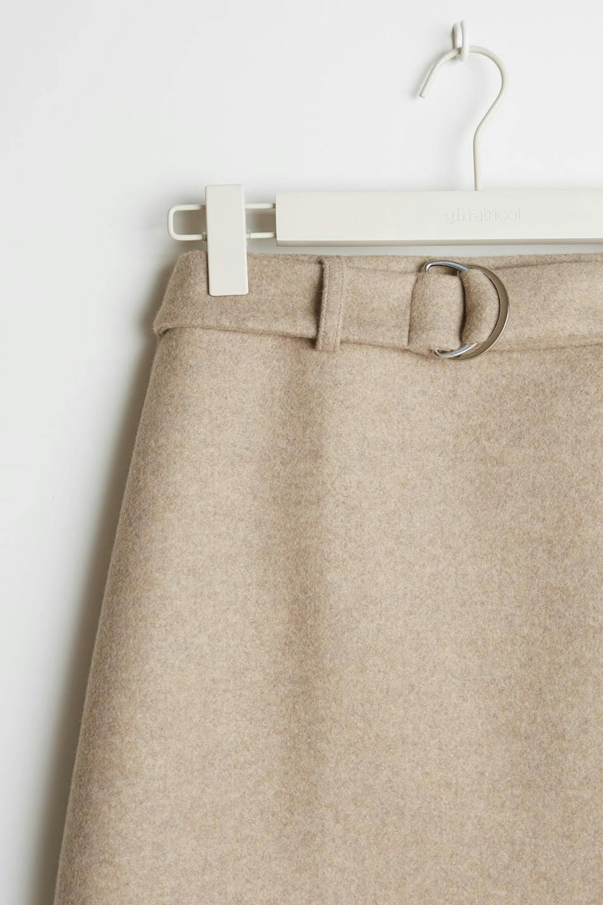 Pieni hame vyöllä vyötäröllä. Hame on beige.