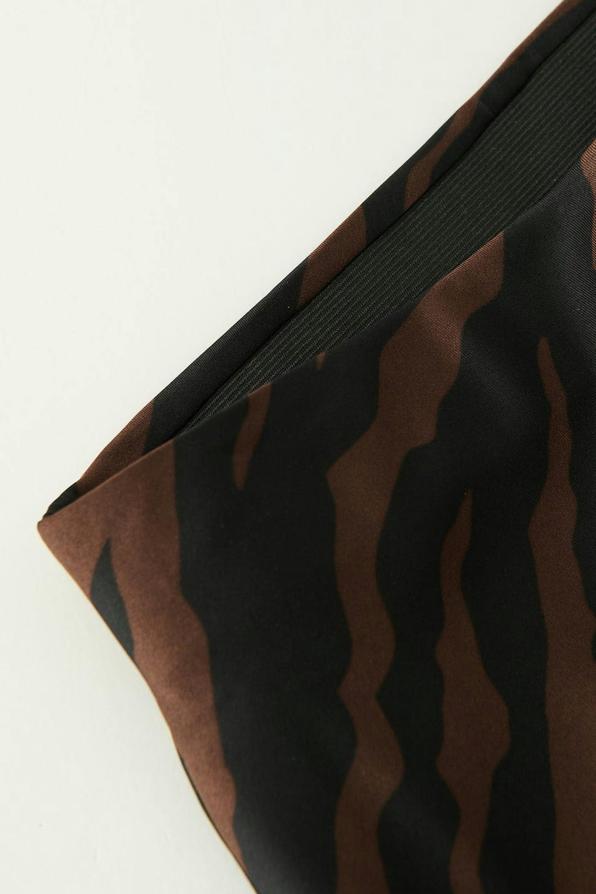 Seeprakuvioitu hame korkealla vyötäröllä. Hame on ruskea ja siinä on kätketty kuminauha vyötäröllä.