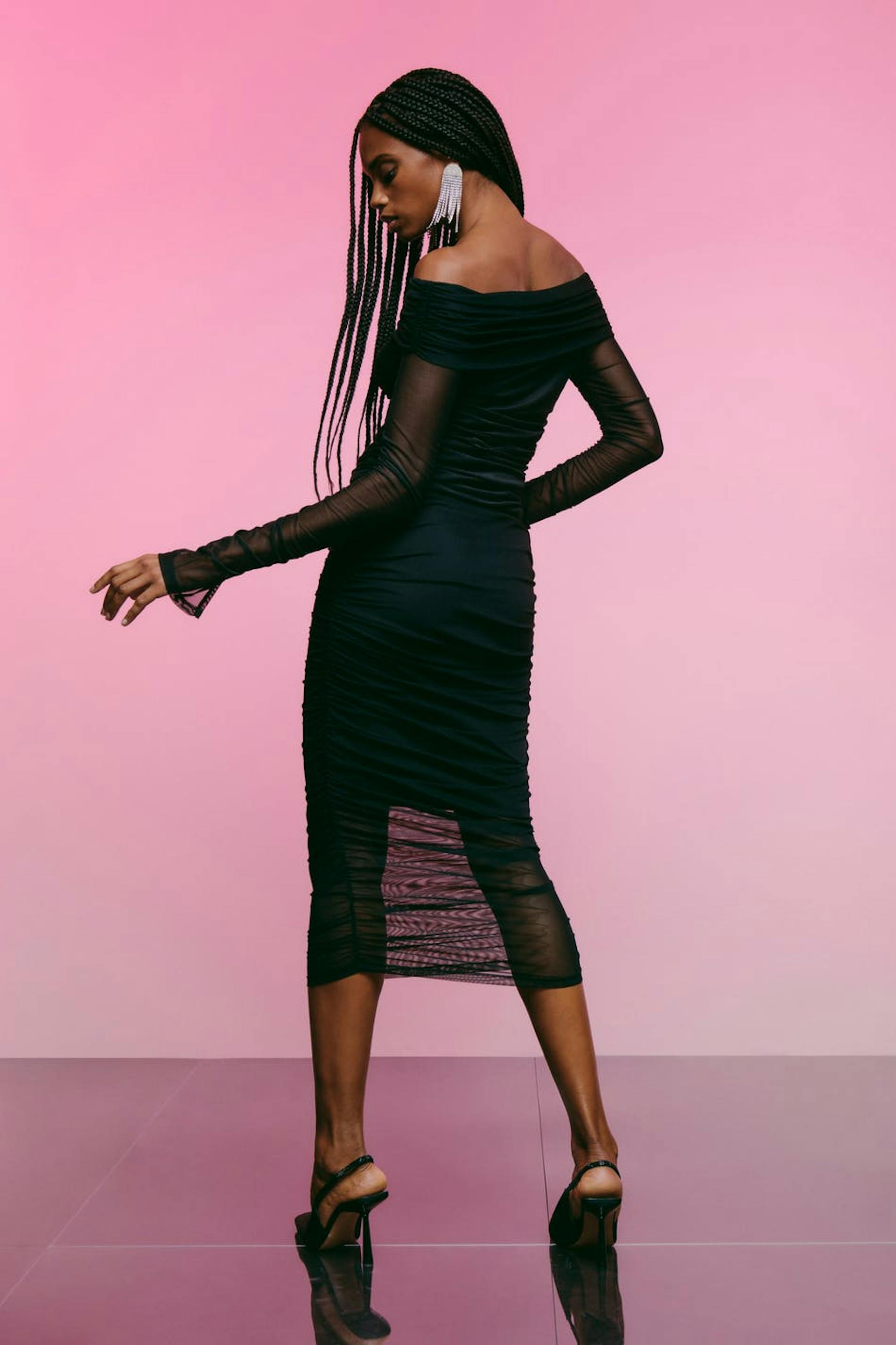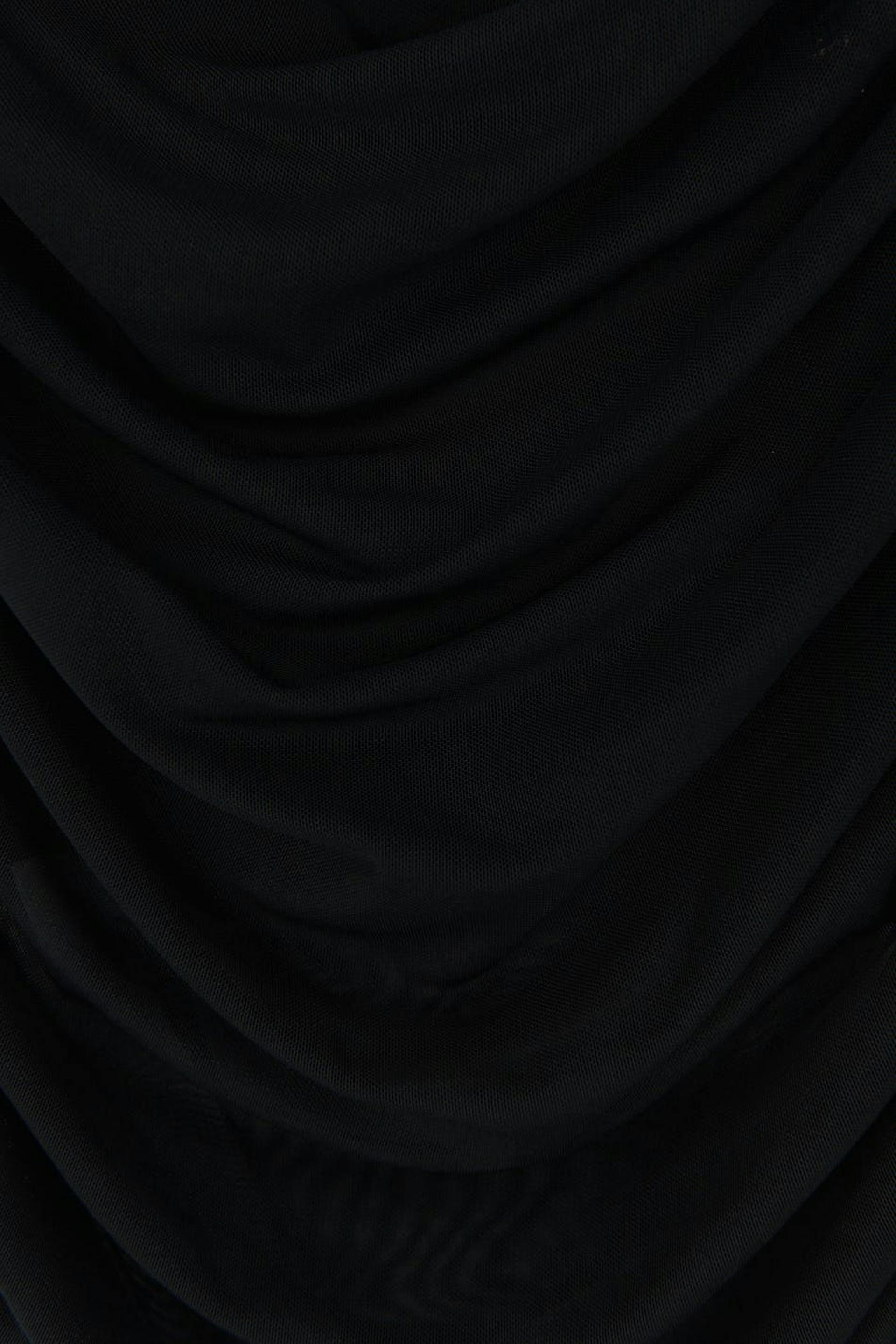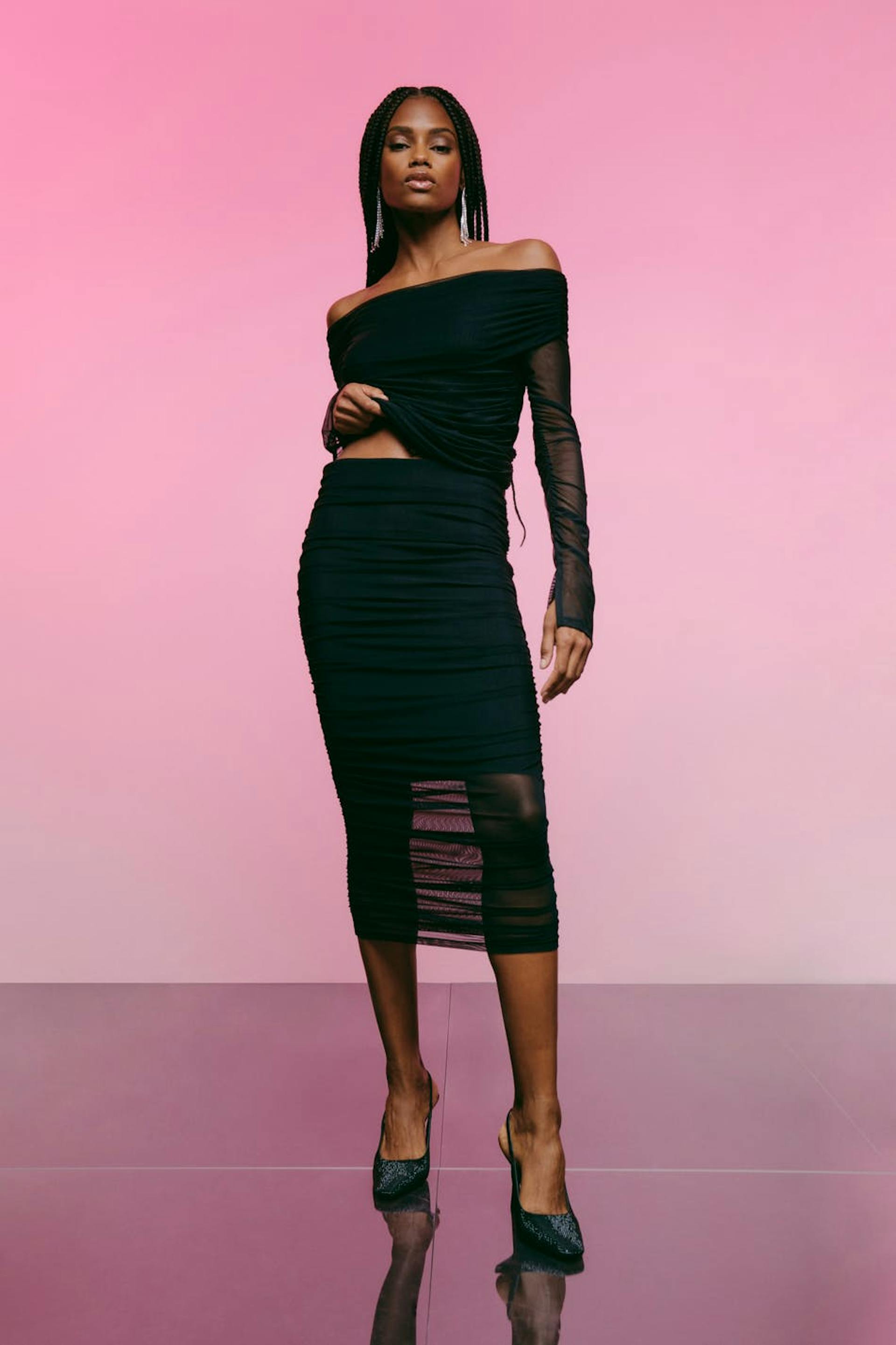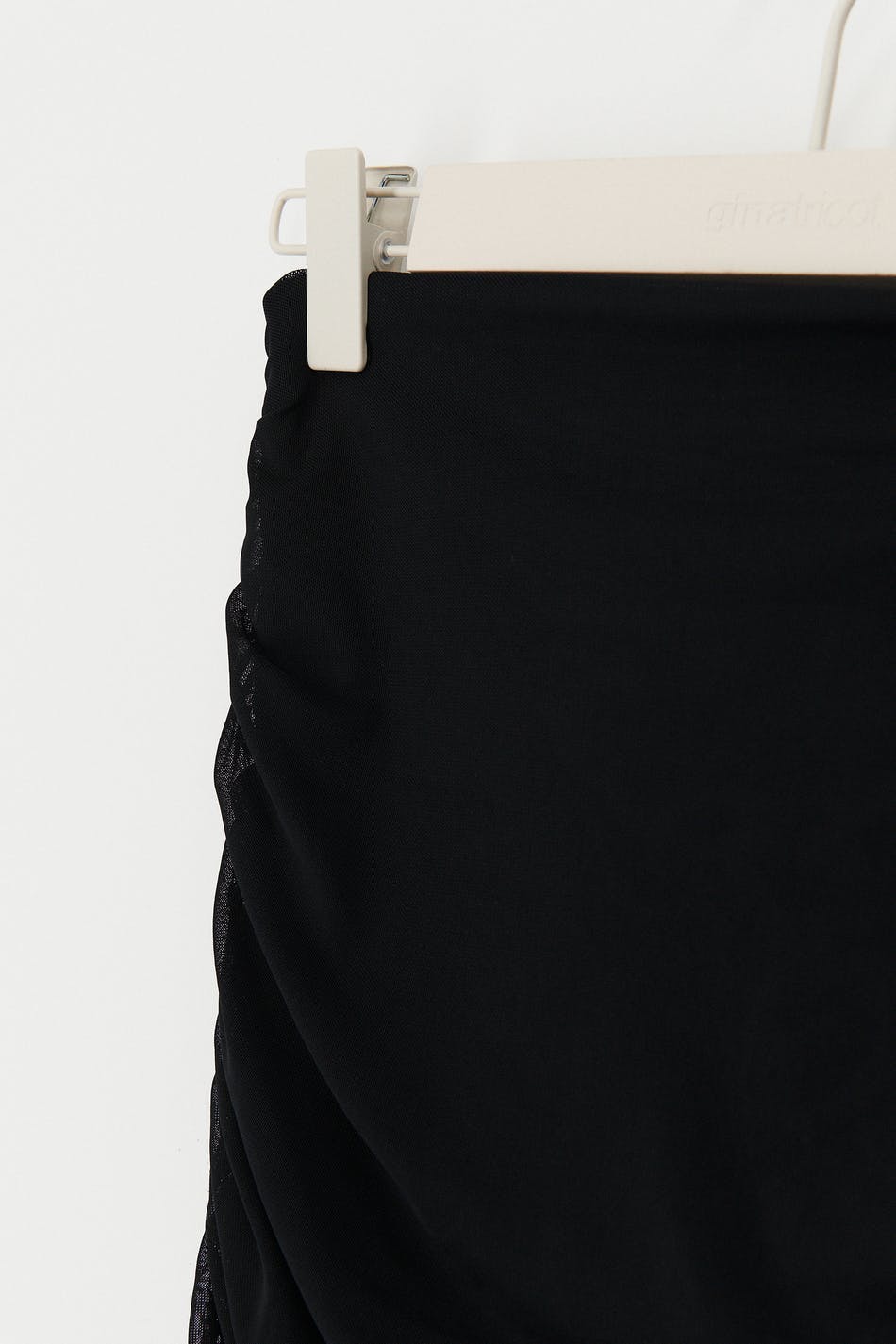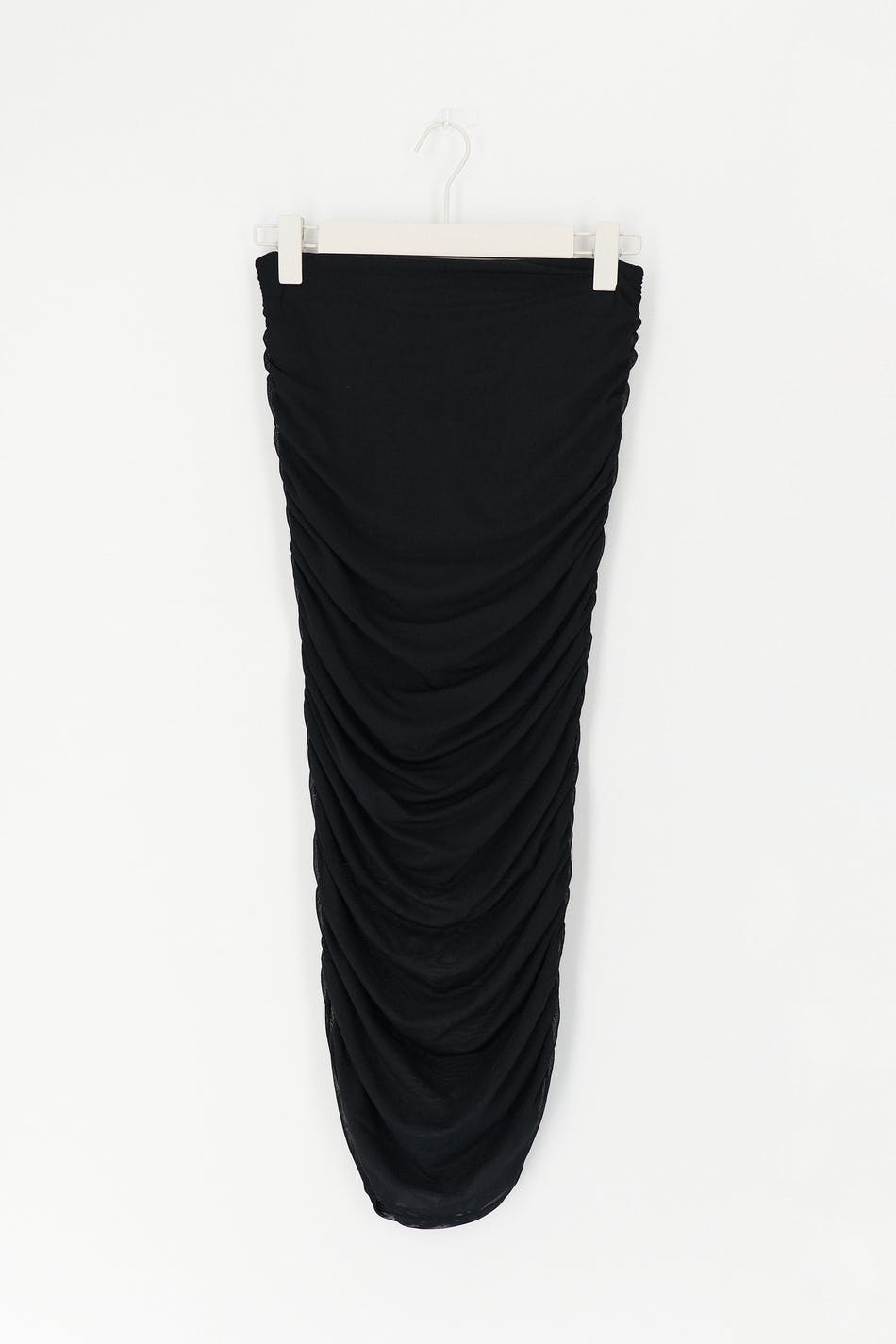 Midi-hame verkkokankaasta poimuilla sivusaumassa. Hame on musta ja siinä on vartalonmyötäinen istuvuus. Siinä on kuminauha vyötäröllä ja lyhyt alushame.