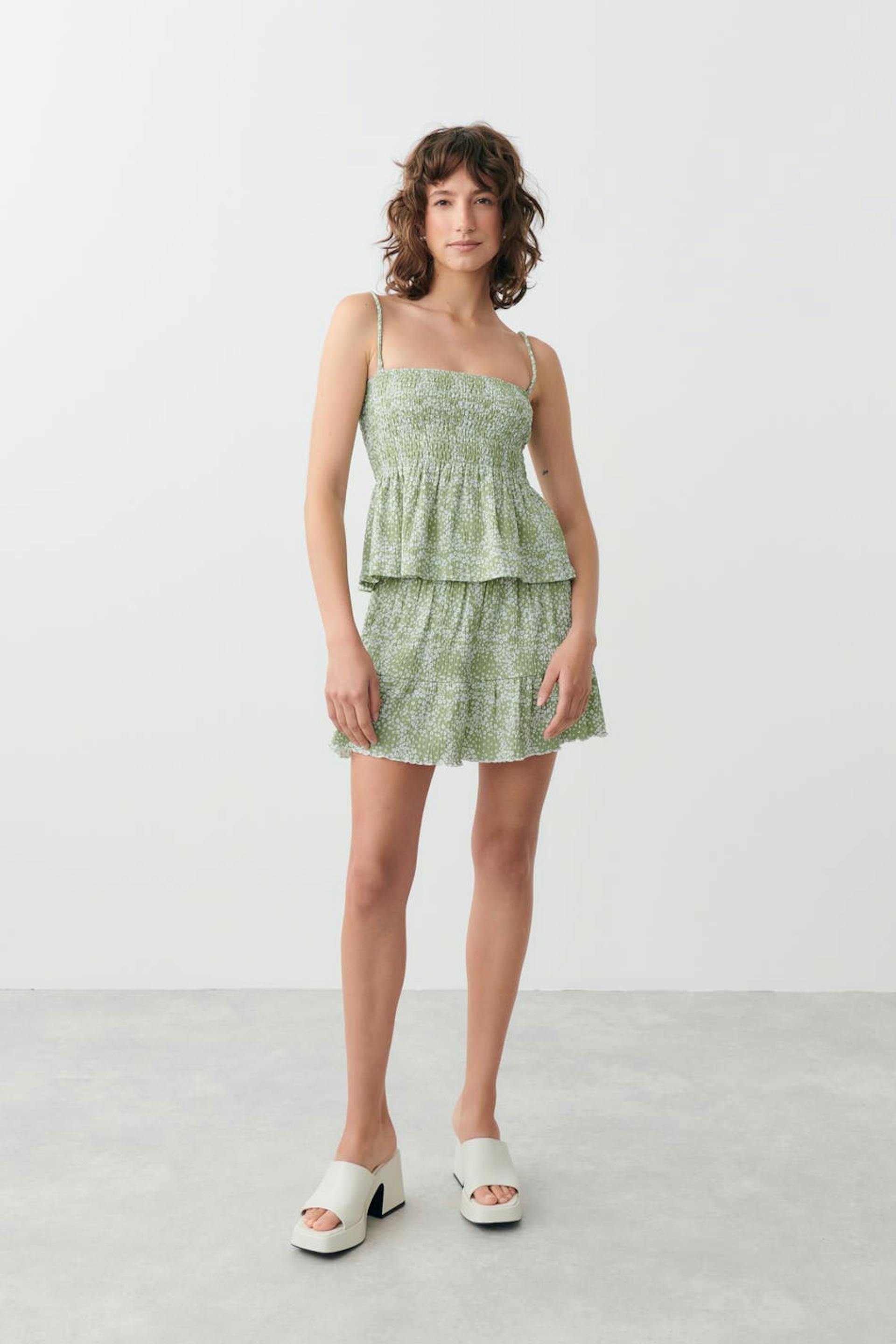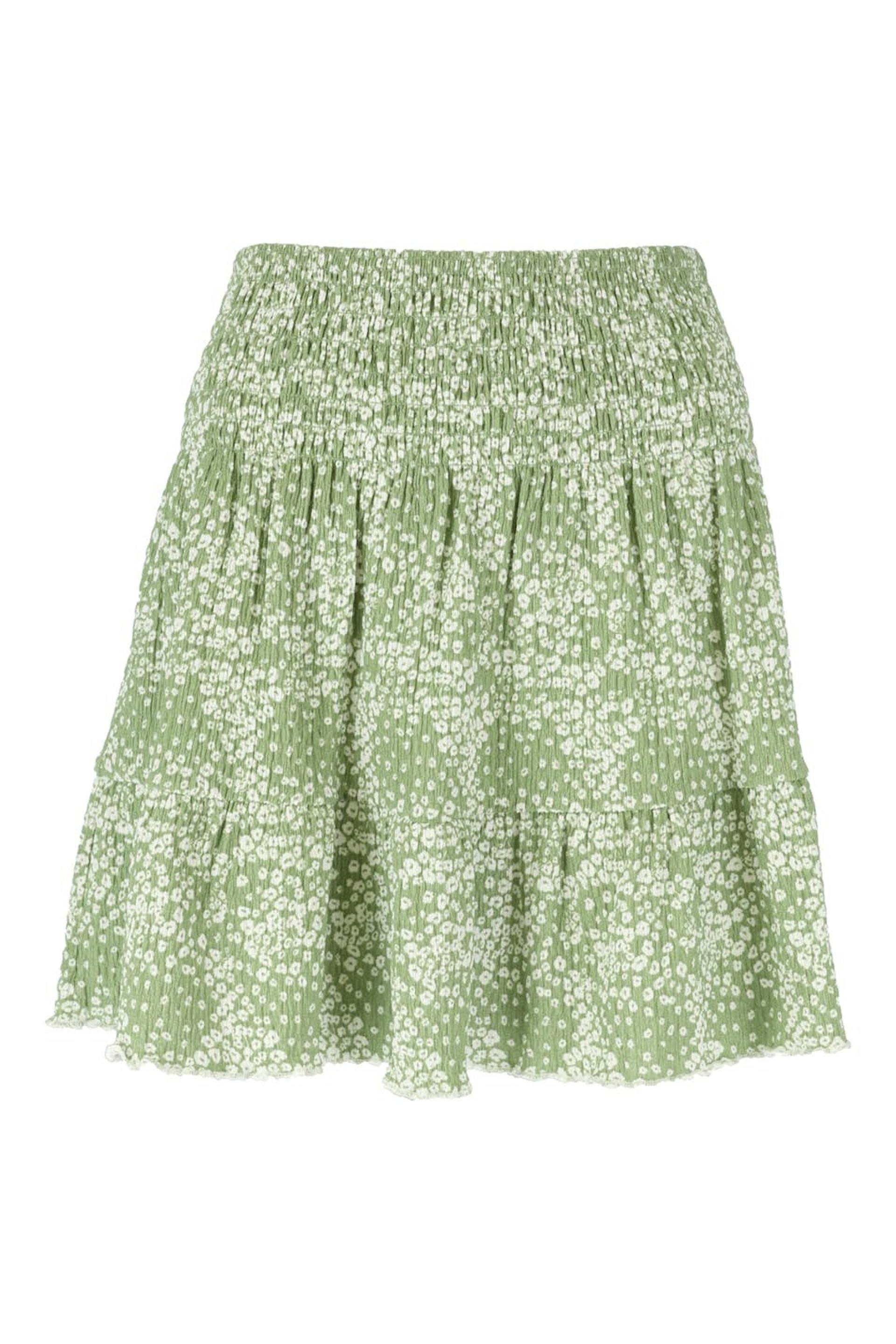 Lyhyt röyhelöhame trikoosta smokatulla vyötäröllä. Hame on vihreä ja siinä on rakennemateriaali. Siinä on normaali istuvuus, rypytetyt yksityiskohdat, kuminauha vyötäröllä ja röyhelöt pohjassa.