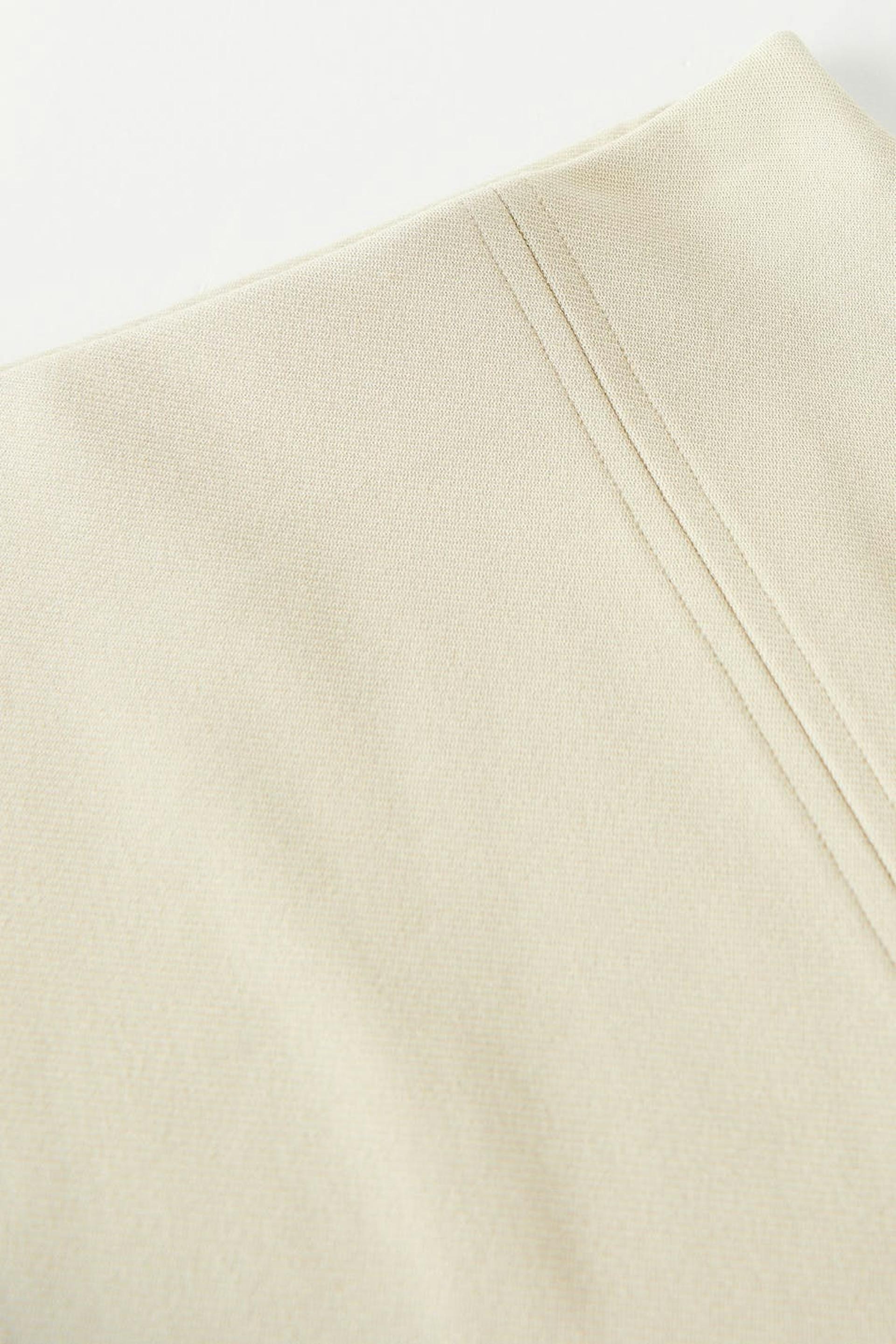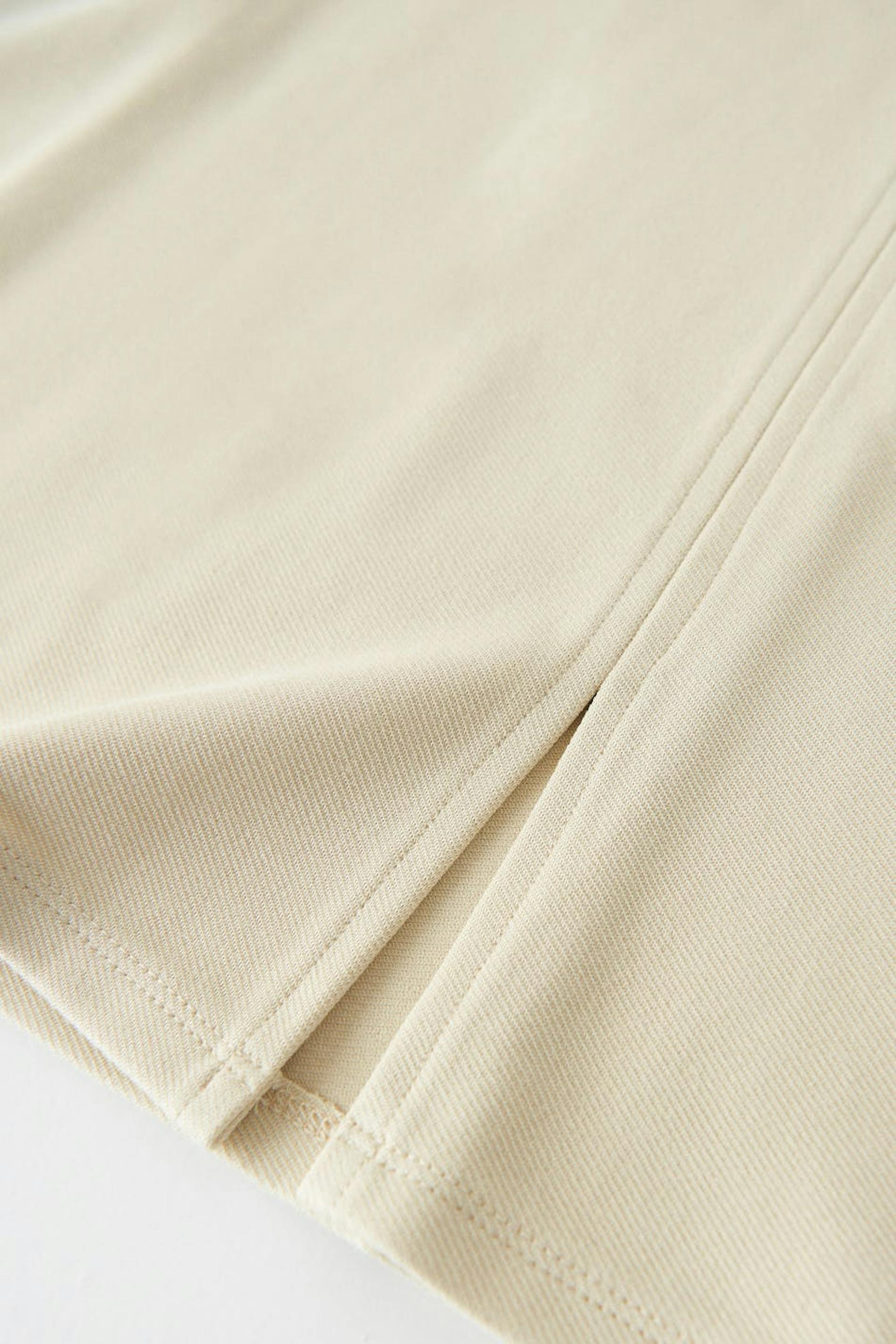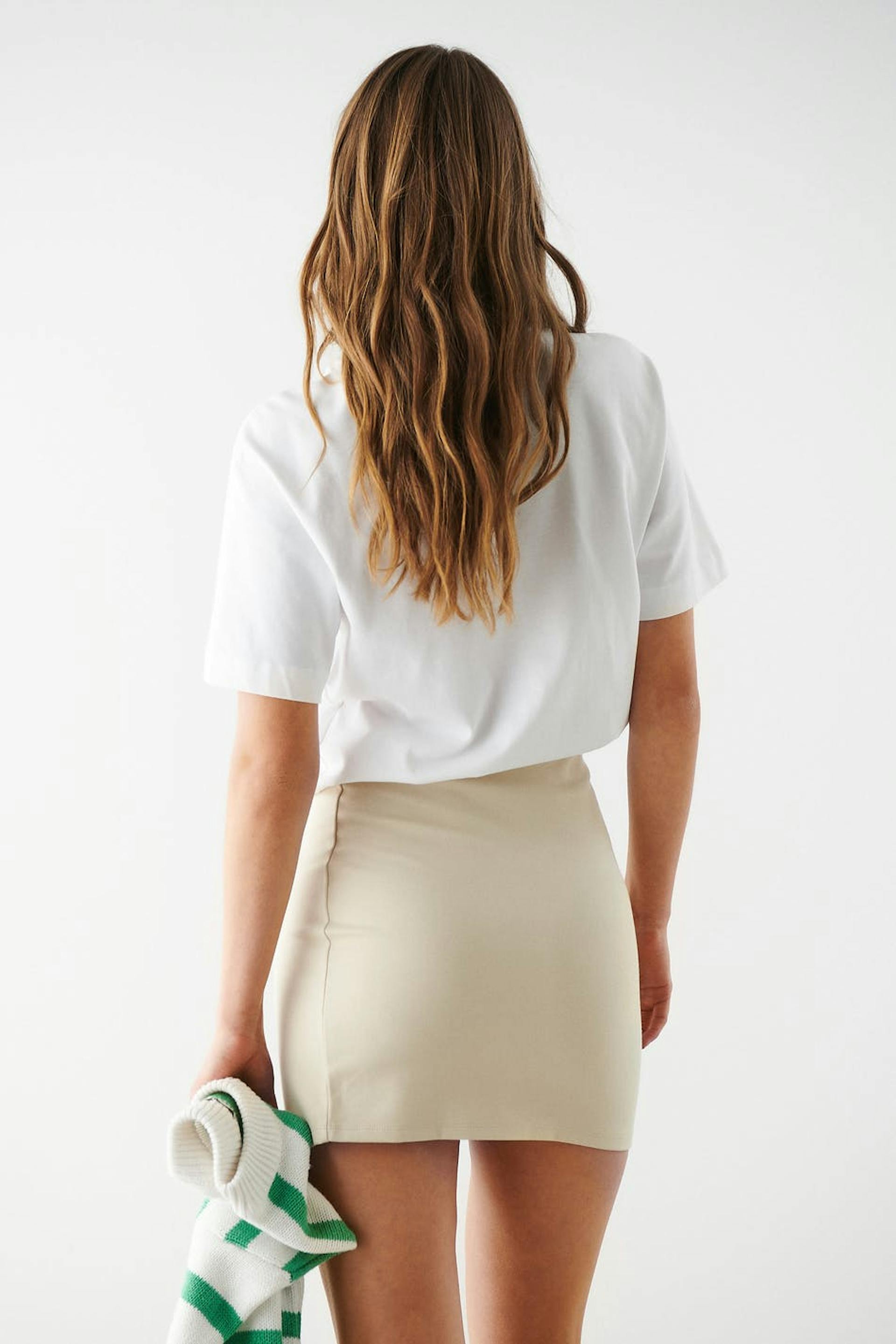 Lyhyt hame vartalonmyötäisellä istuvuudella. Hame on beige ja siinä on halkio sivussa. Siinä on kuminauha vyötäröllä.