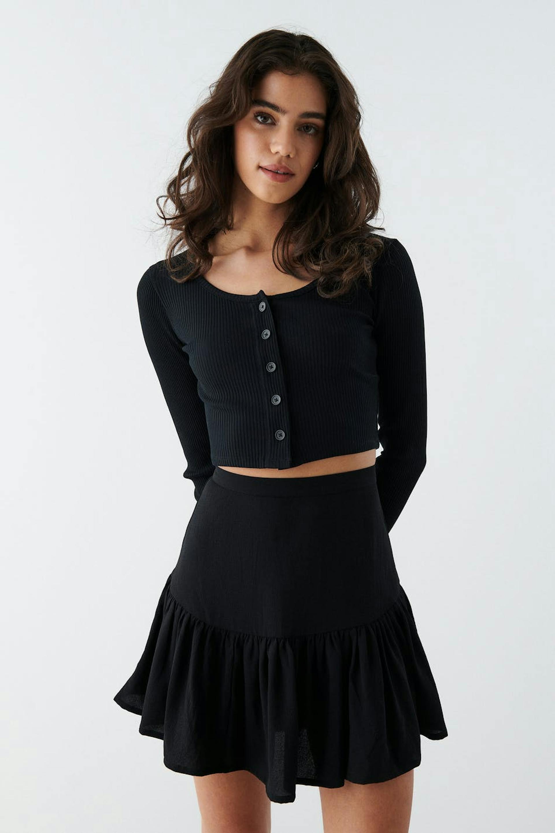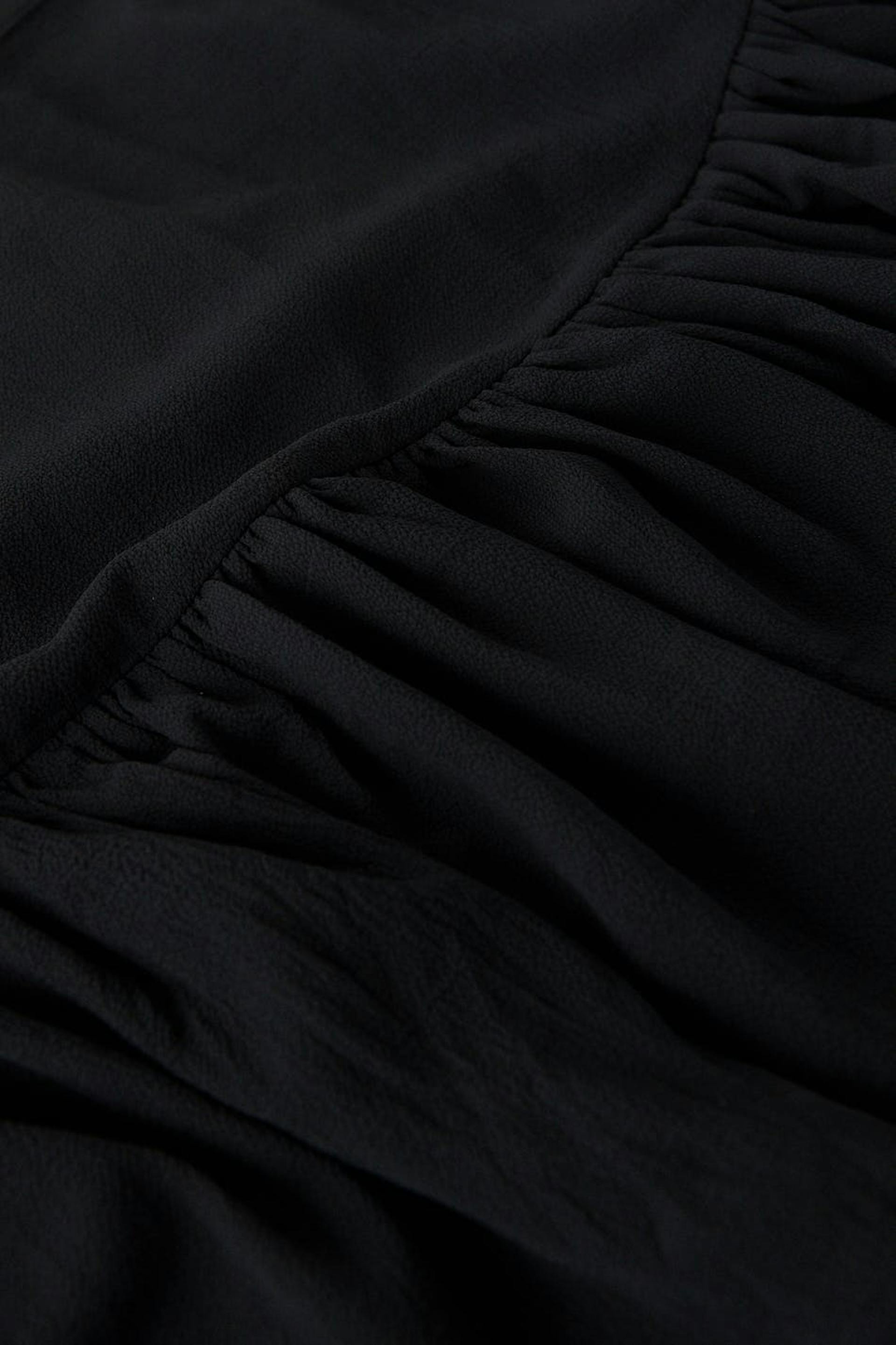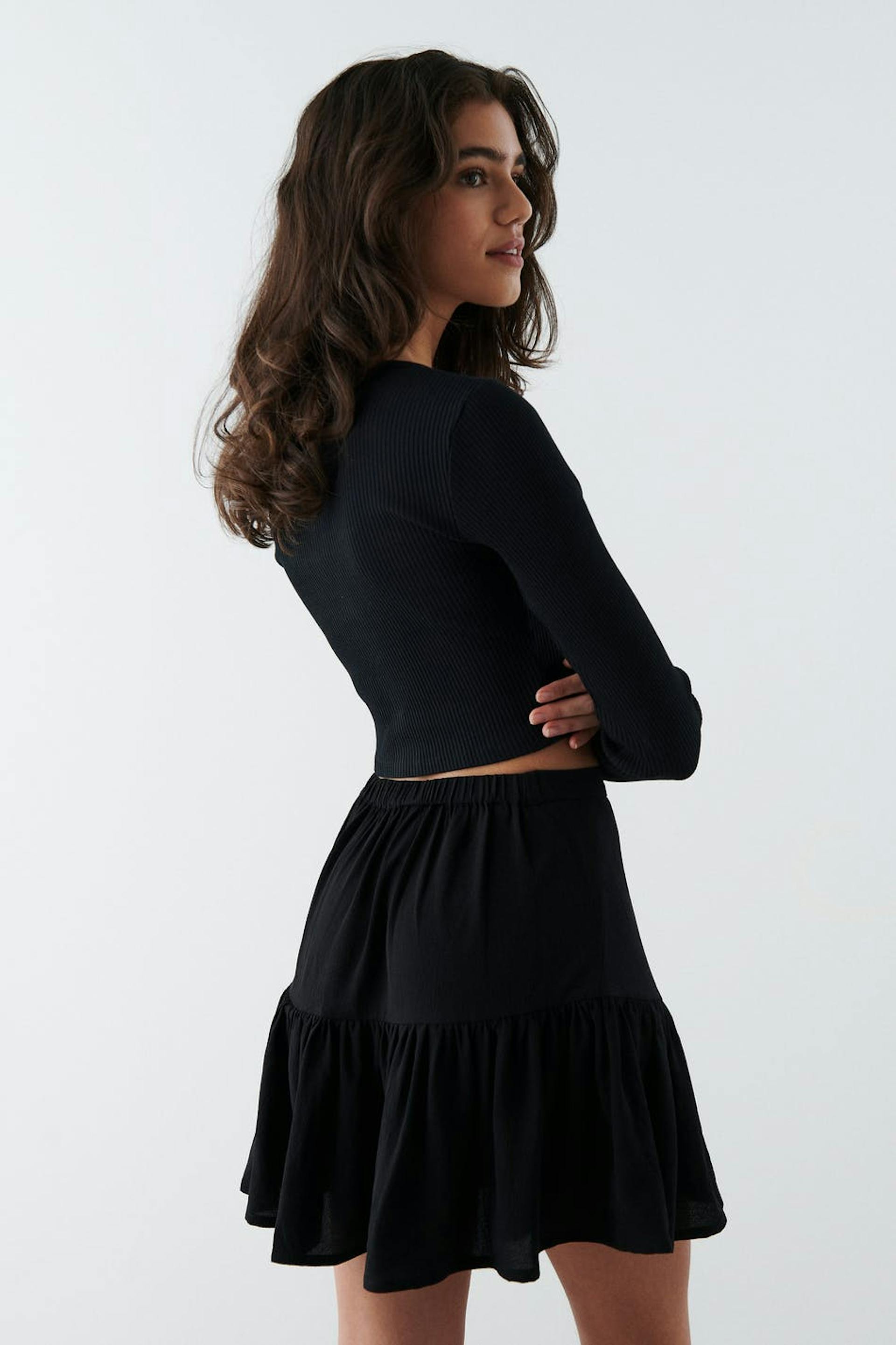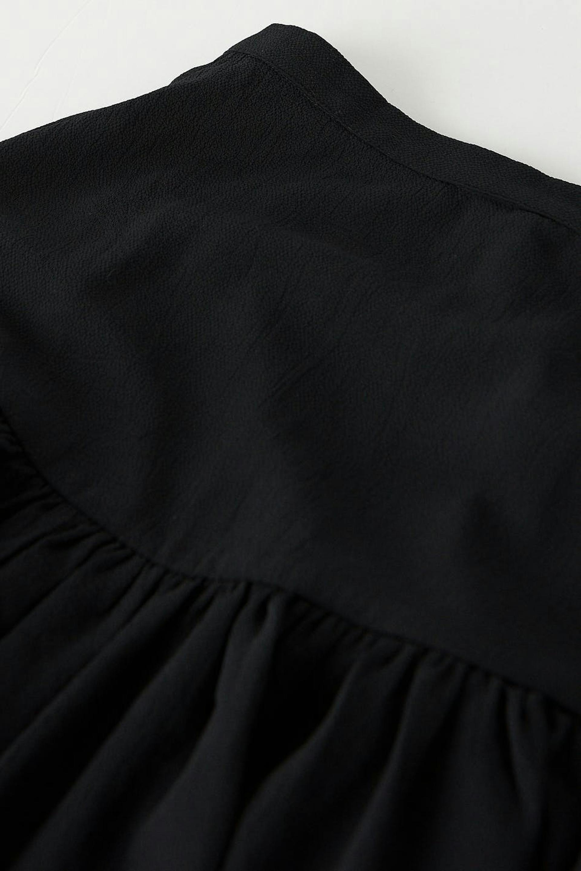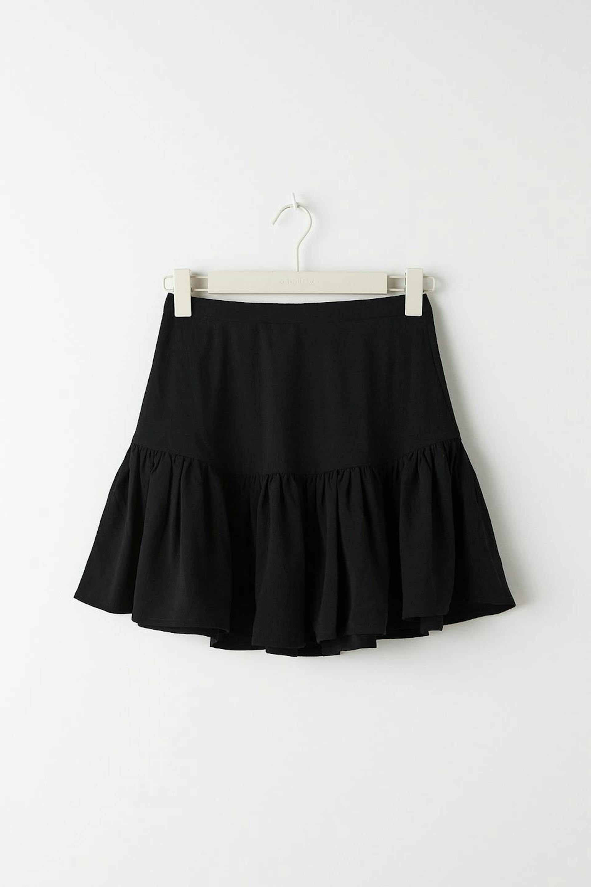 Lyhyt röyhelöhame kuminauhalla takana. Hame on musta ja siinä on materiaali kierrätetystä polyesteristä.