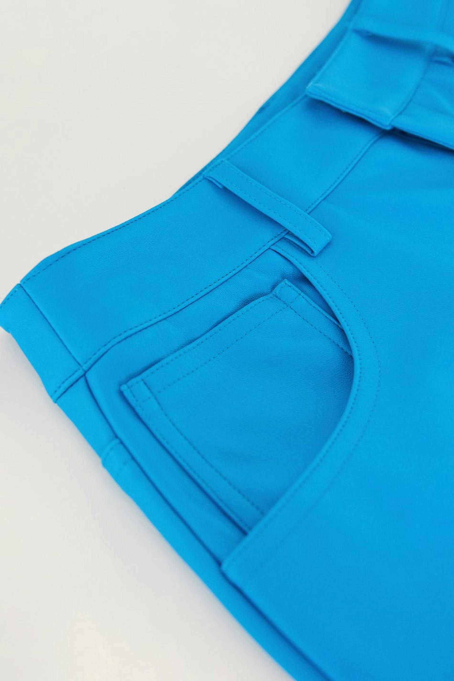 Keinonahkaiset housut 90-luvun innoittavalla istuvuudella. Housut ovat sinisiä ja niissä on suorat jalat täyspituudella. Niissä on vetoketjusepalus ja taskut edessä ja takana.