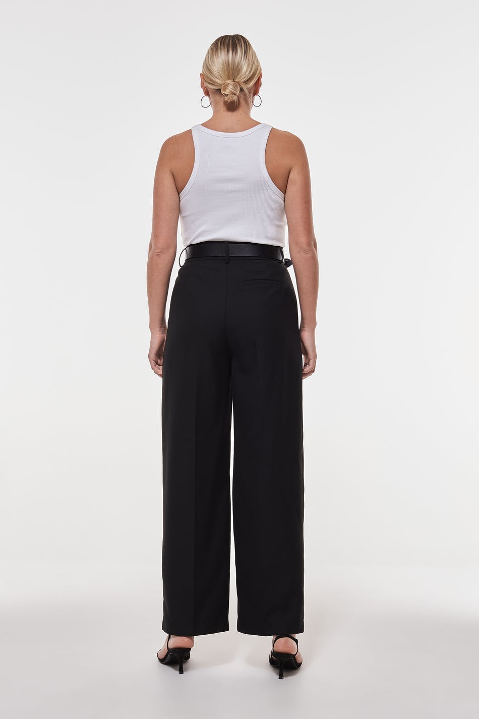 Housut korkealla vyötäröllä. Housut ovat mustia ja niissä on leveät jalat. Niissä on laskos edessä ja takana.