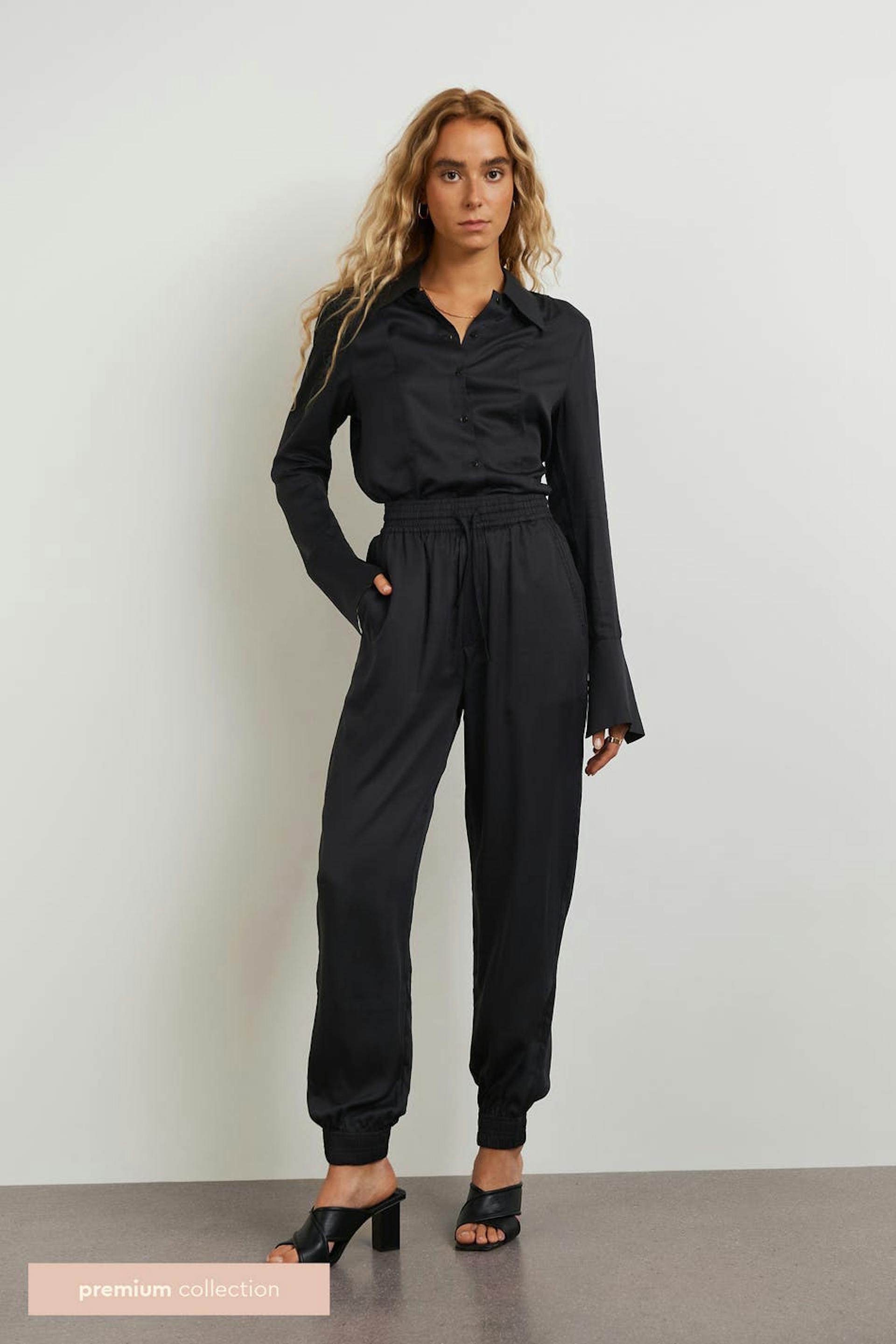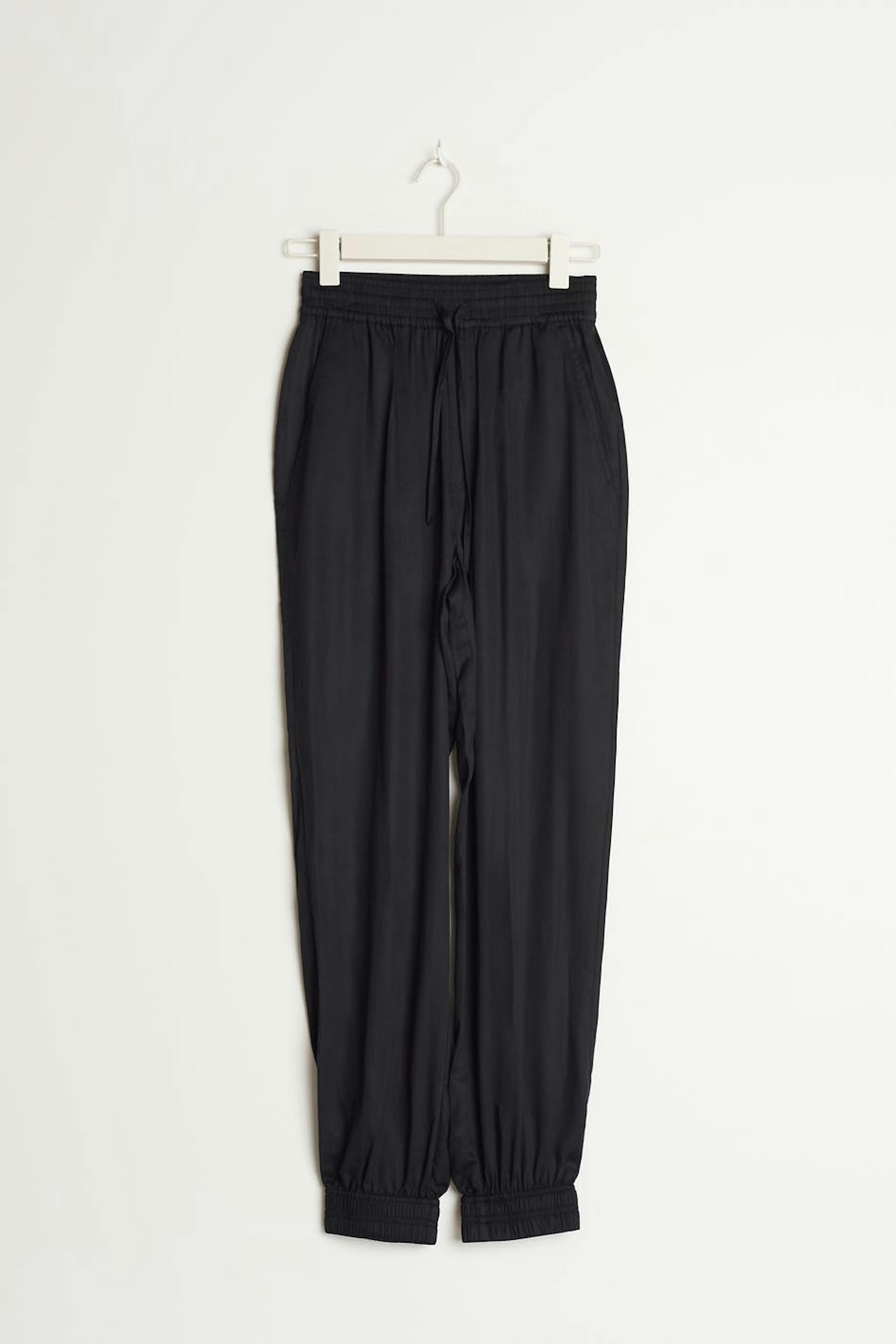Olohousut rennolla istuvuudella. Housut ovat mustia ja niissä on huippulaatu. Niissä on korkea vyötärö solmittavalla vyöllä edessä, laskosdetaljit ylhäällä ja joustonauha vyötäröllä ja lahkeiden lopuissa.