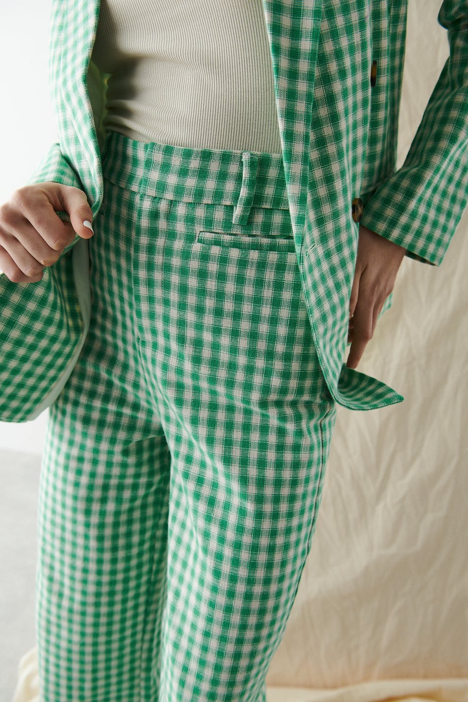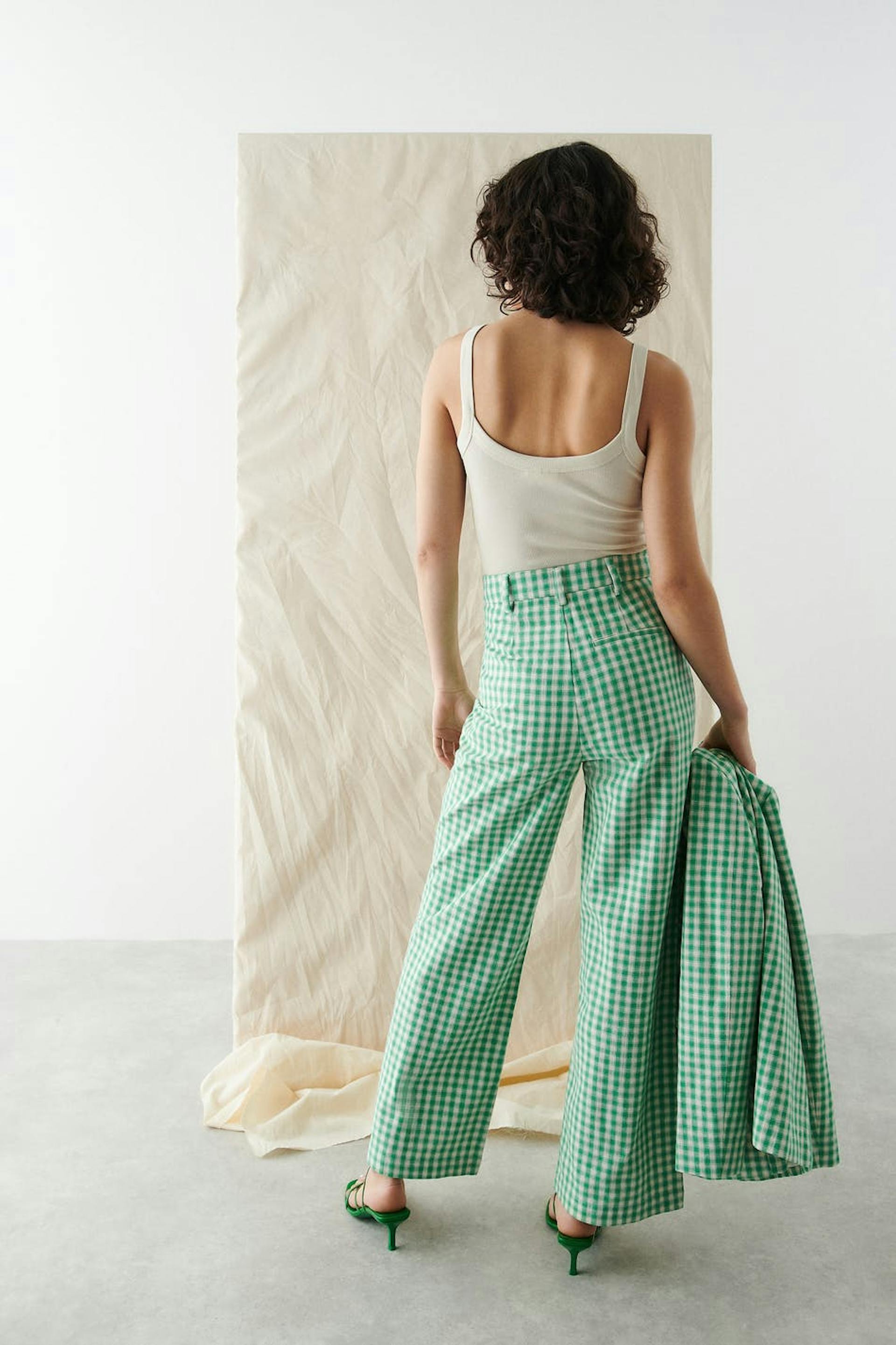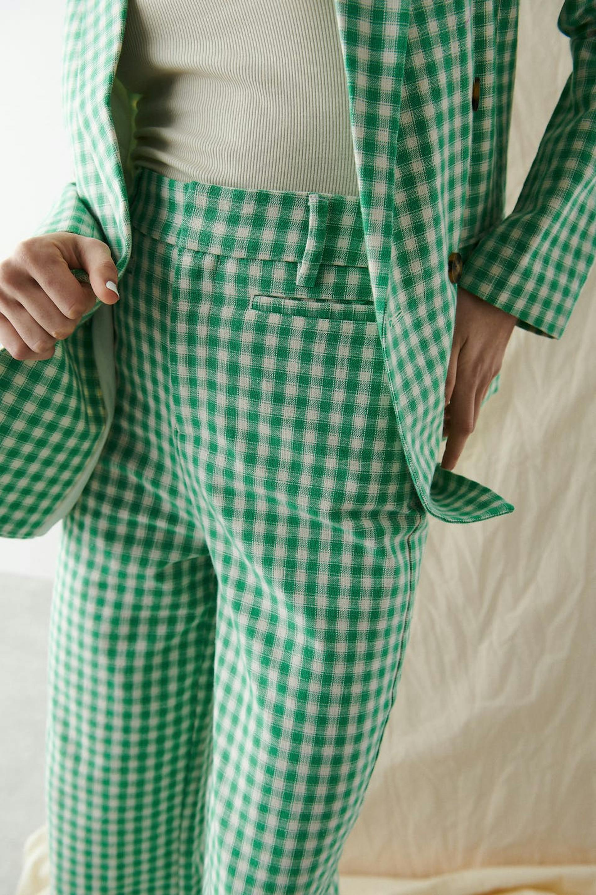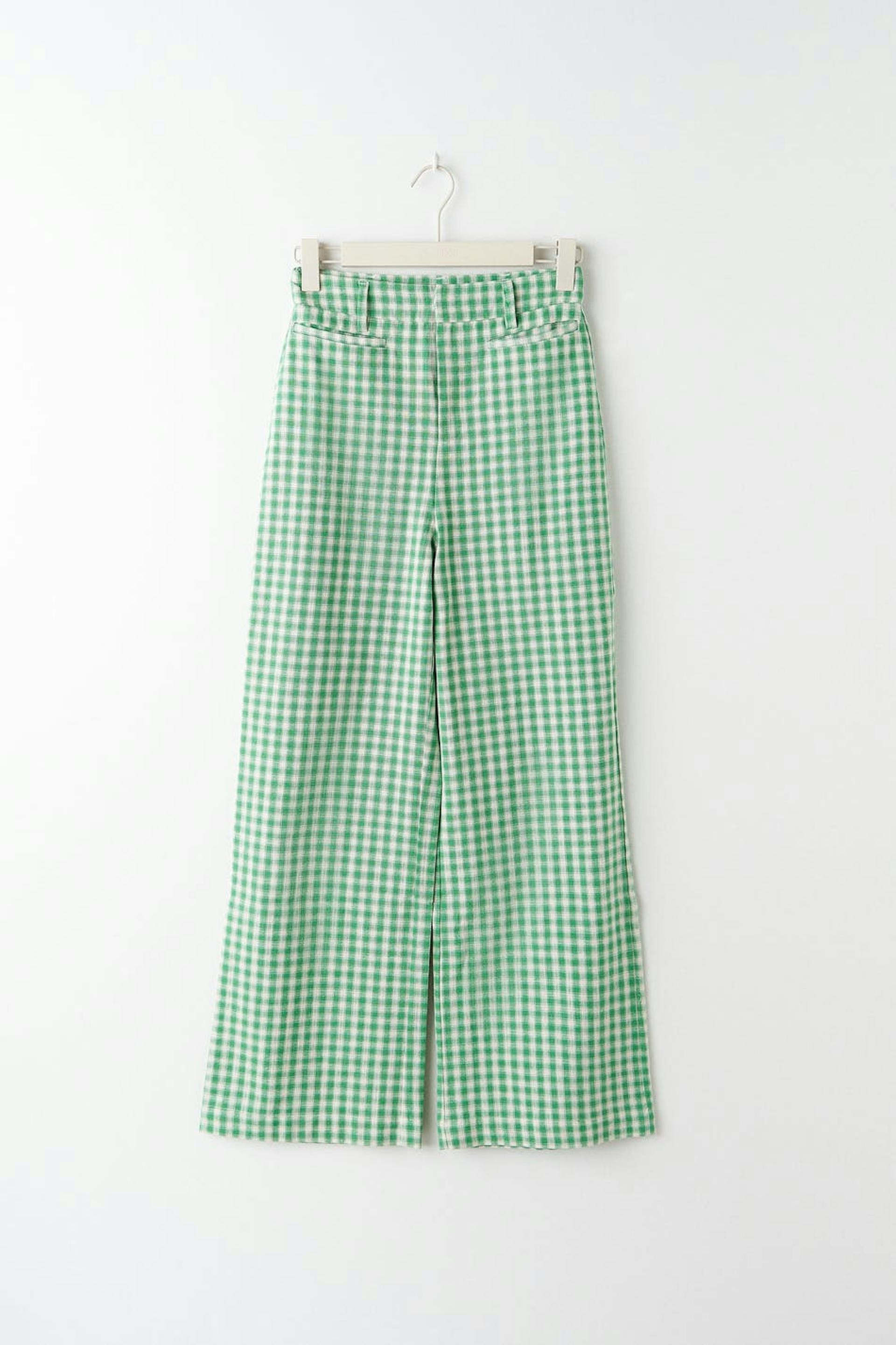 Ruudulliset puvunhousut korkealla vyötäröllä. Housut ovat vihreitä ja niissä on suorat lahkeet. Niissä on viiltotaskut ja vyötärönauha vyönlenkeillä.