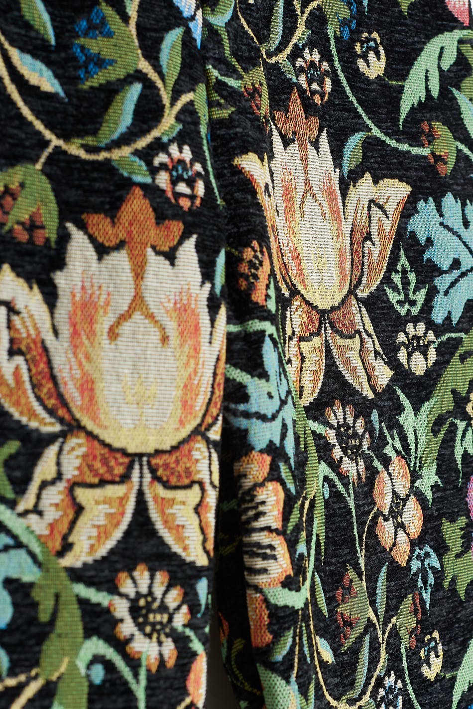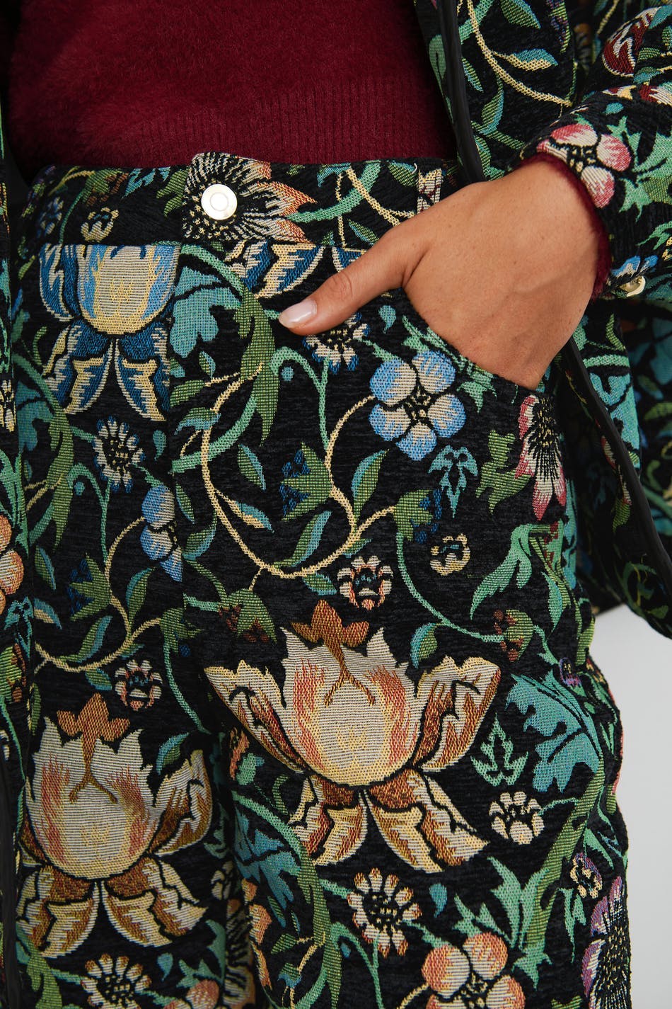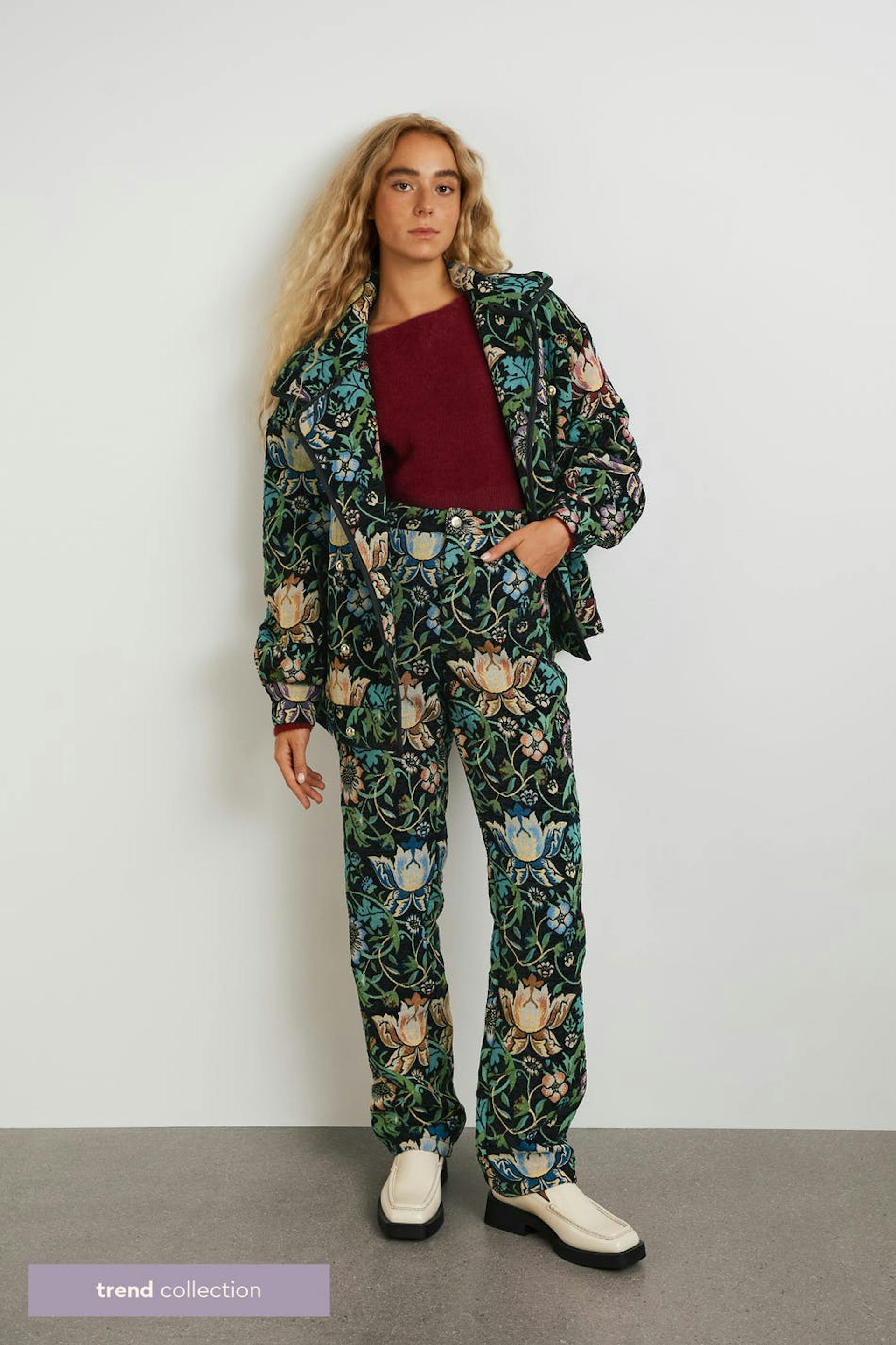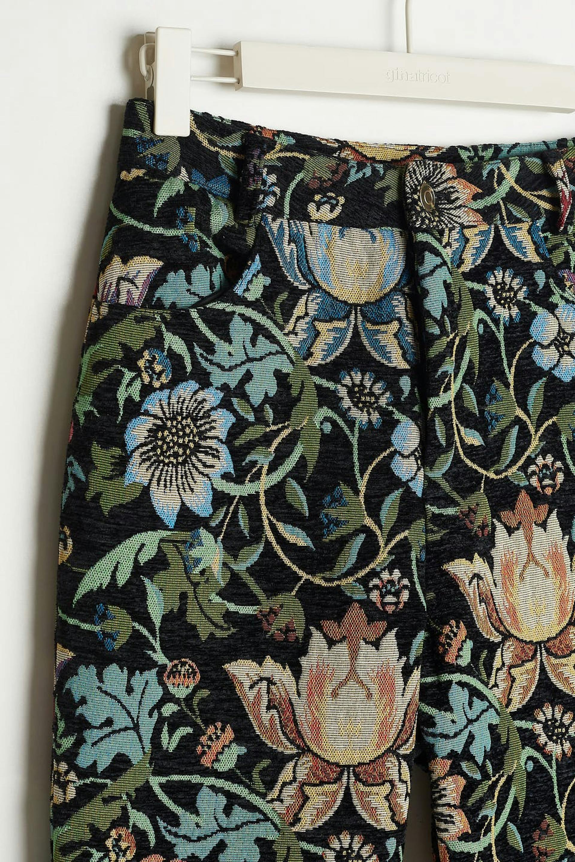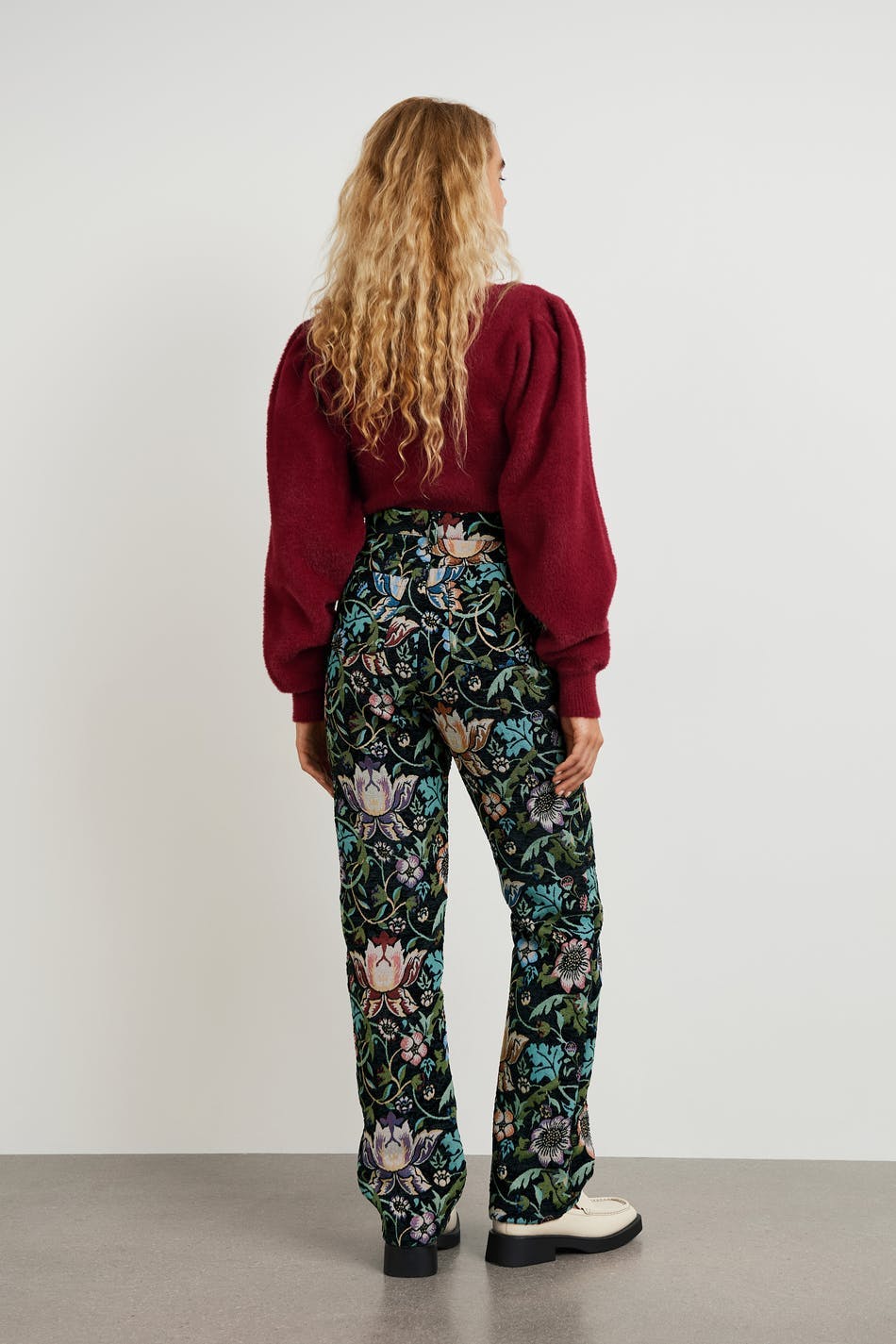 Kukalliset housut korkealla vyötäröllä. Housut ovat kudottuja ja niissä on suorat housujen lahkeet täyspituudella. Niissä on taskut edessä ja takana.