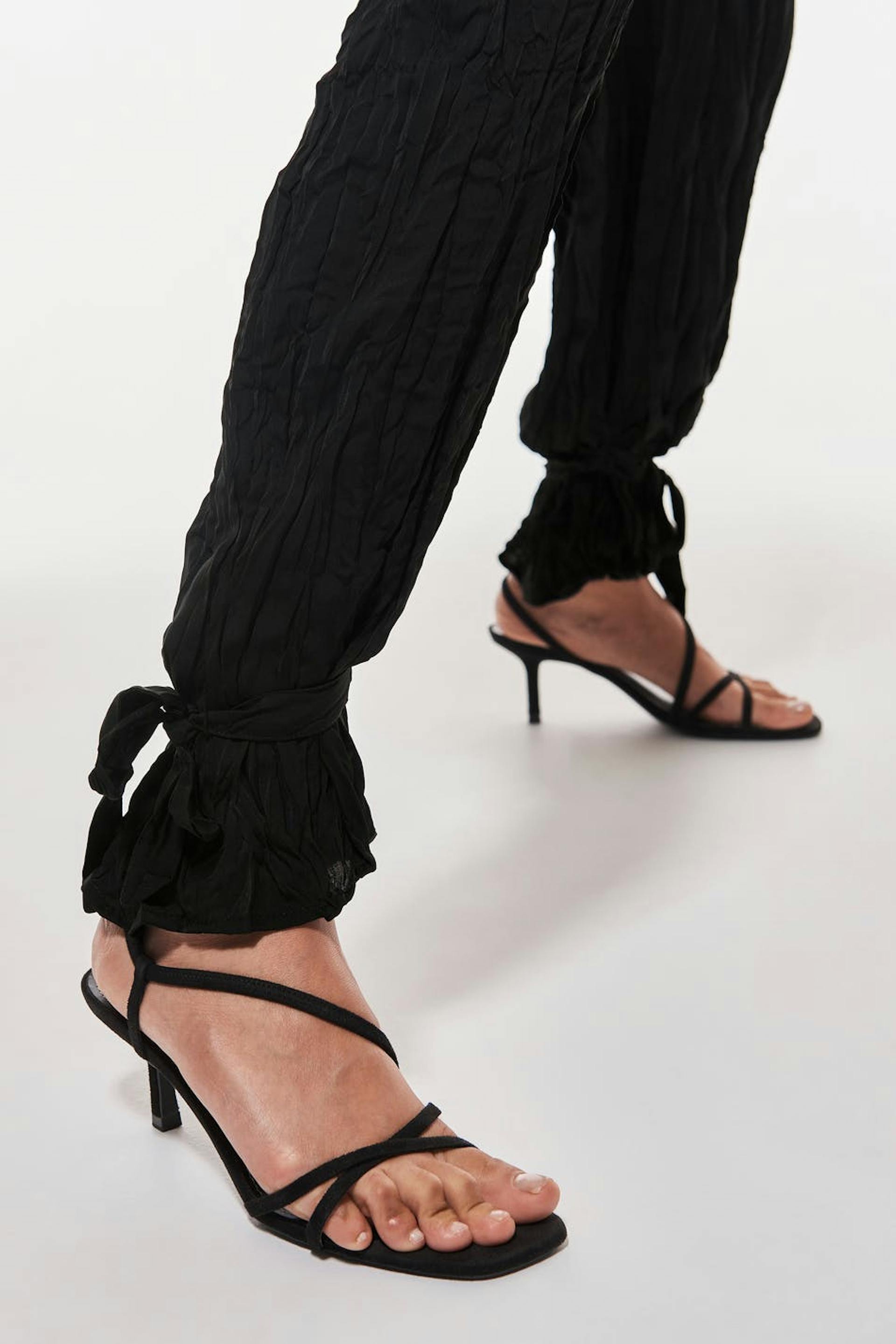Kevyesti rypistetyt housut solmuyksityiskohdalla lahkeiden lopuissa. Housut ovat mustia ja niissä on joustonauha takana.