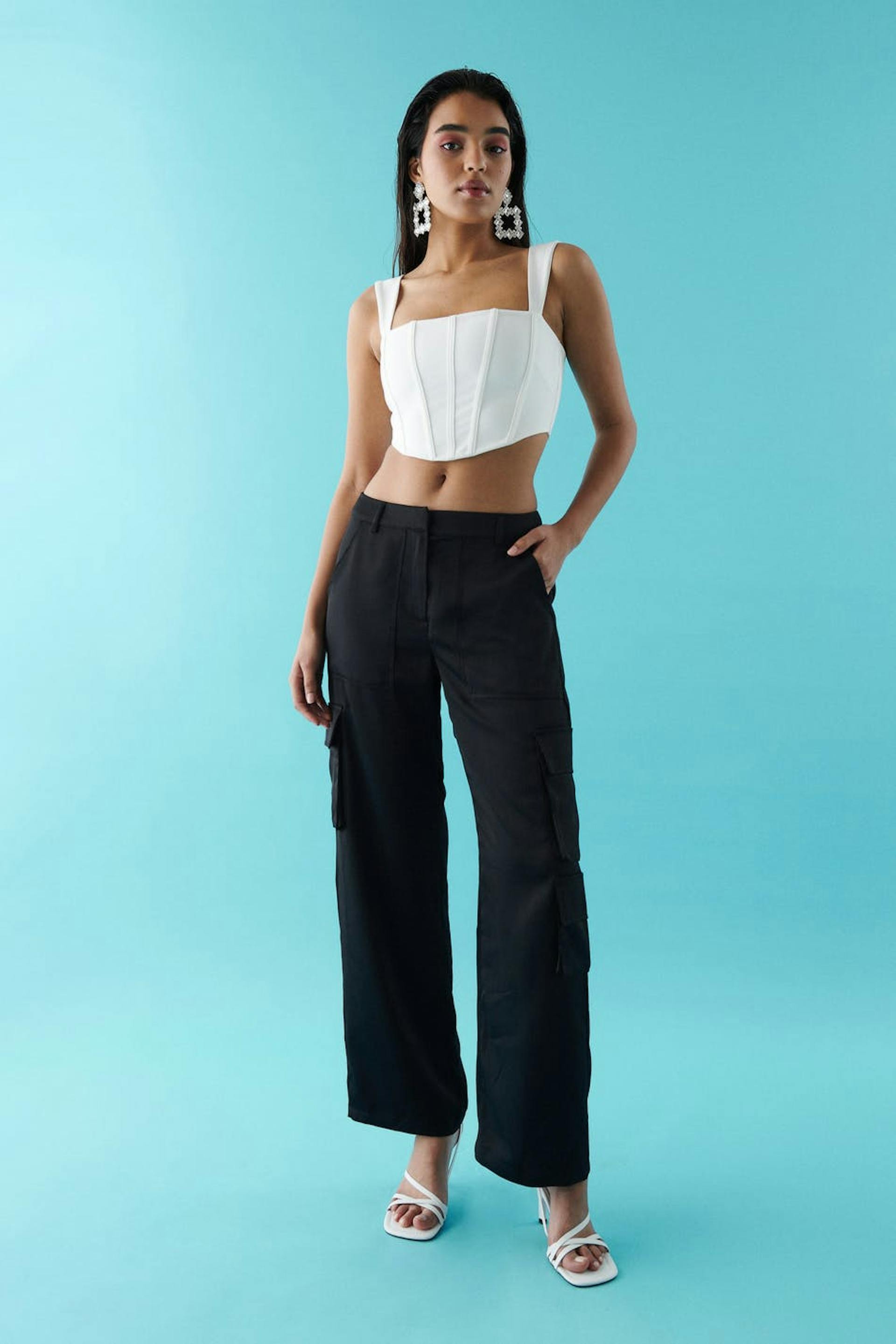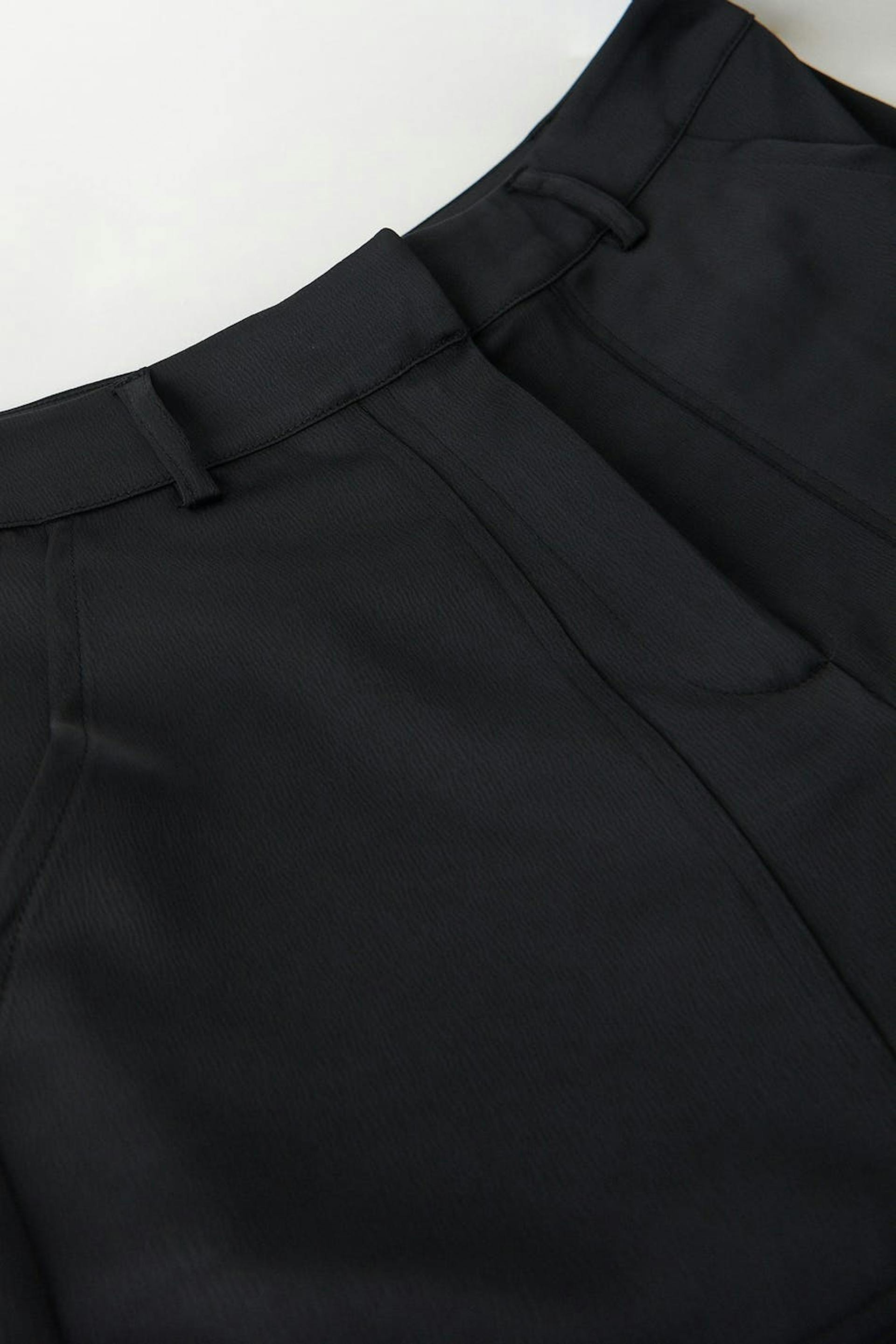 Matalavyötäröiset cargo-housut satiinista suurilla taskuilla jalkojen sivuilla. Housut ovat mustia ja niissä on viiltotasku takana. Niissä on vetoketjusepalus hakaskiinnityksellä ja vyötärönauha vyönlenkeillä.