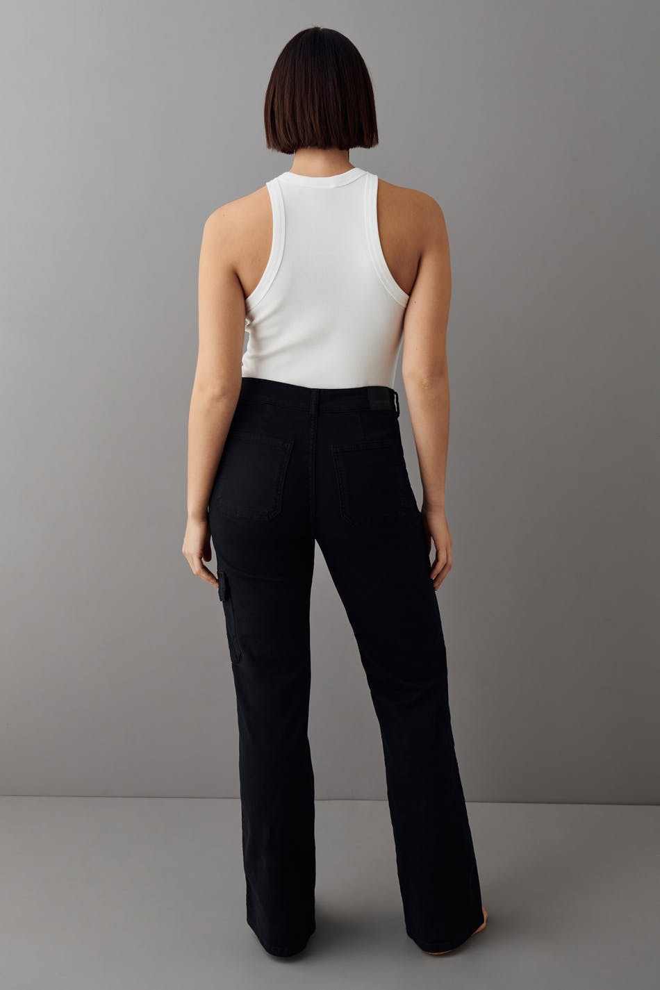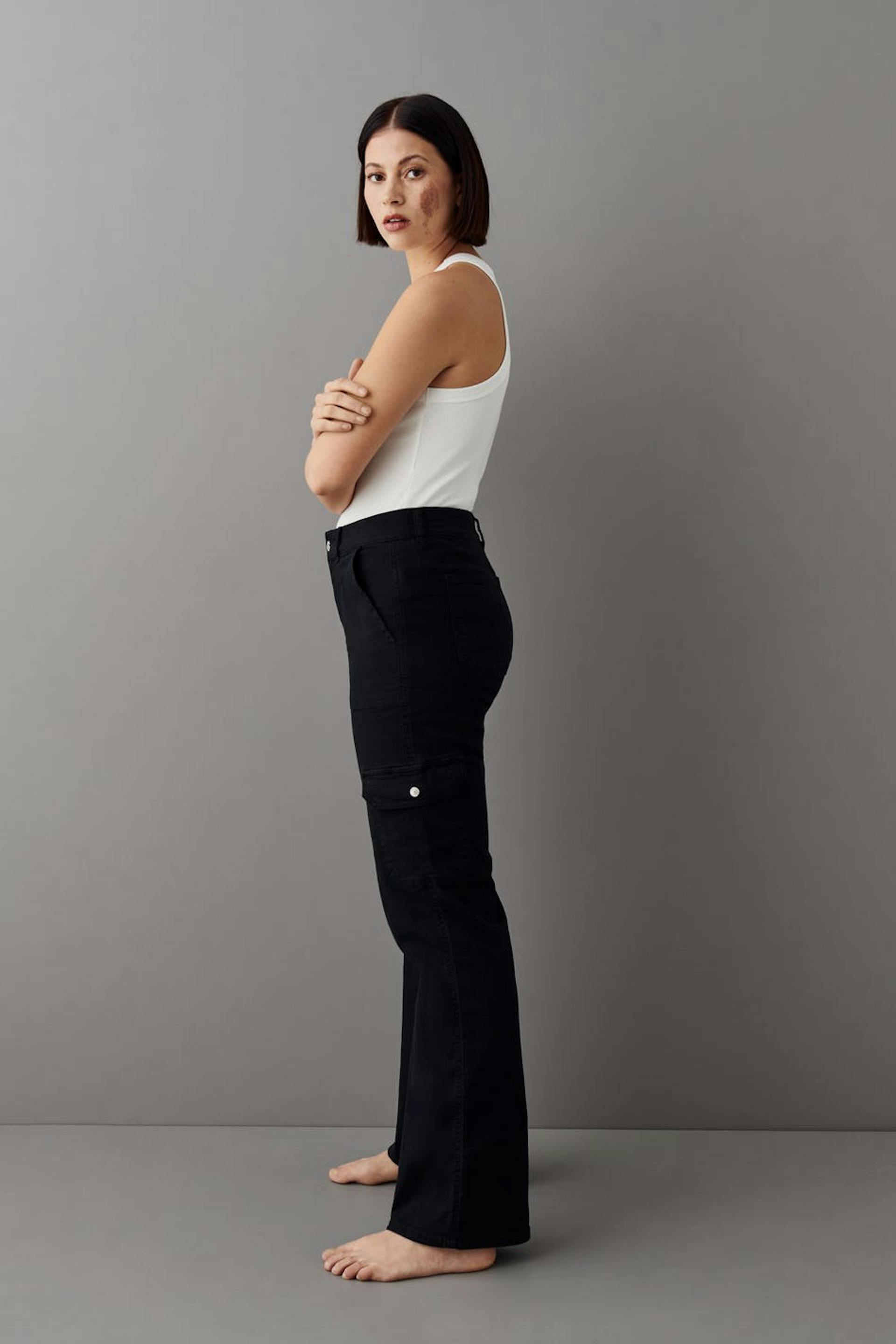 Cargo-farkut keskikorkealla vyötäröllä. Farkut ovat mustia ja niissä on suora, vartalonmyötäinen istuvuus stretch-denimistä. Niissä on vetoketjusepalus ja reisitaskut. Käytä koko-opastamme oikean koon löytämiseksi.