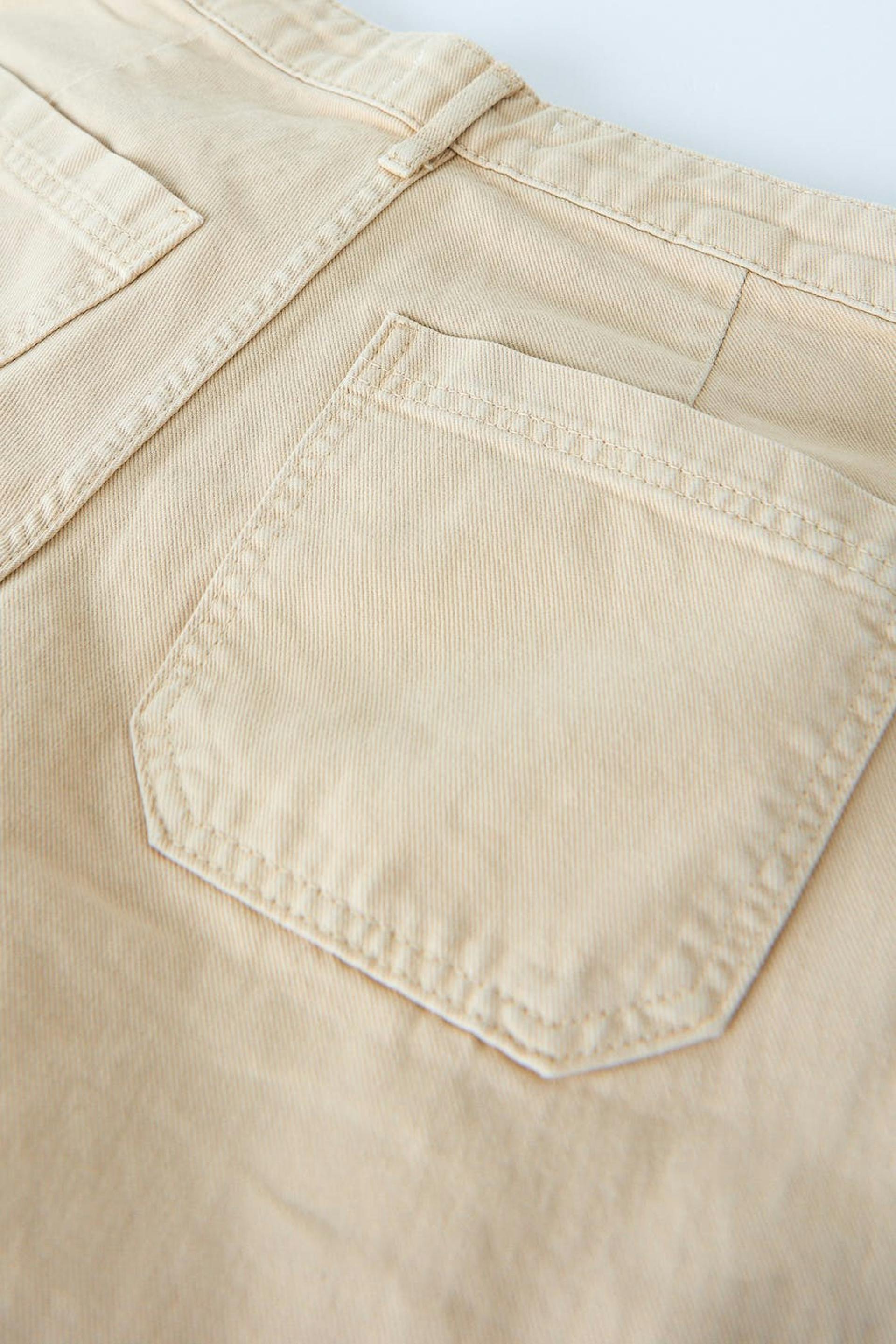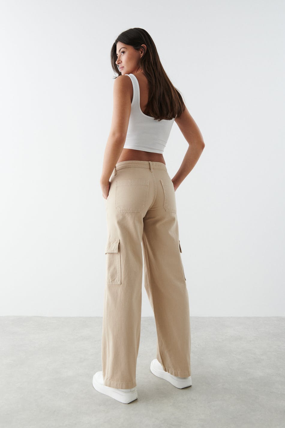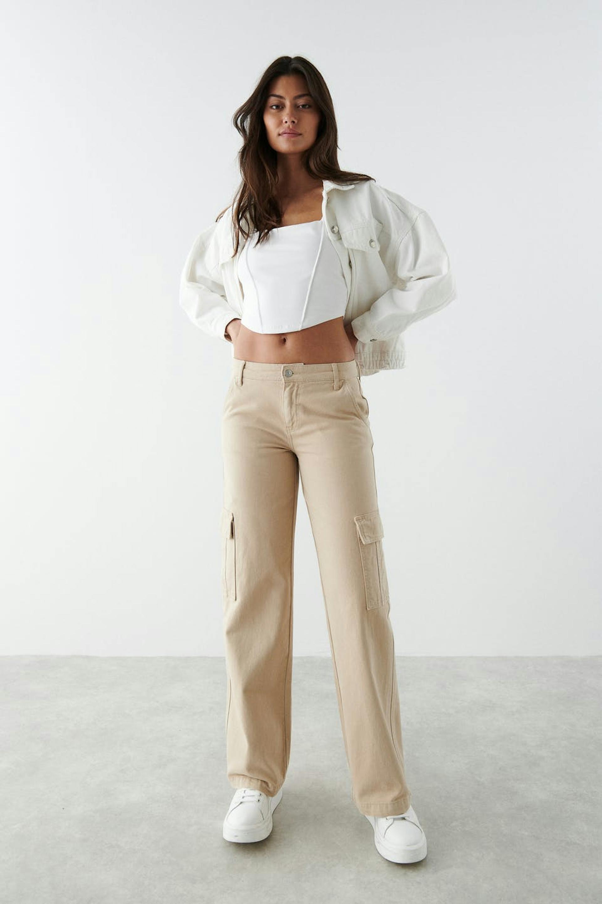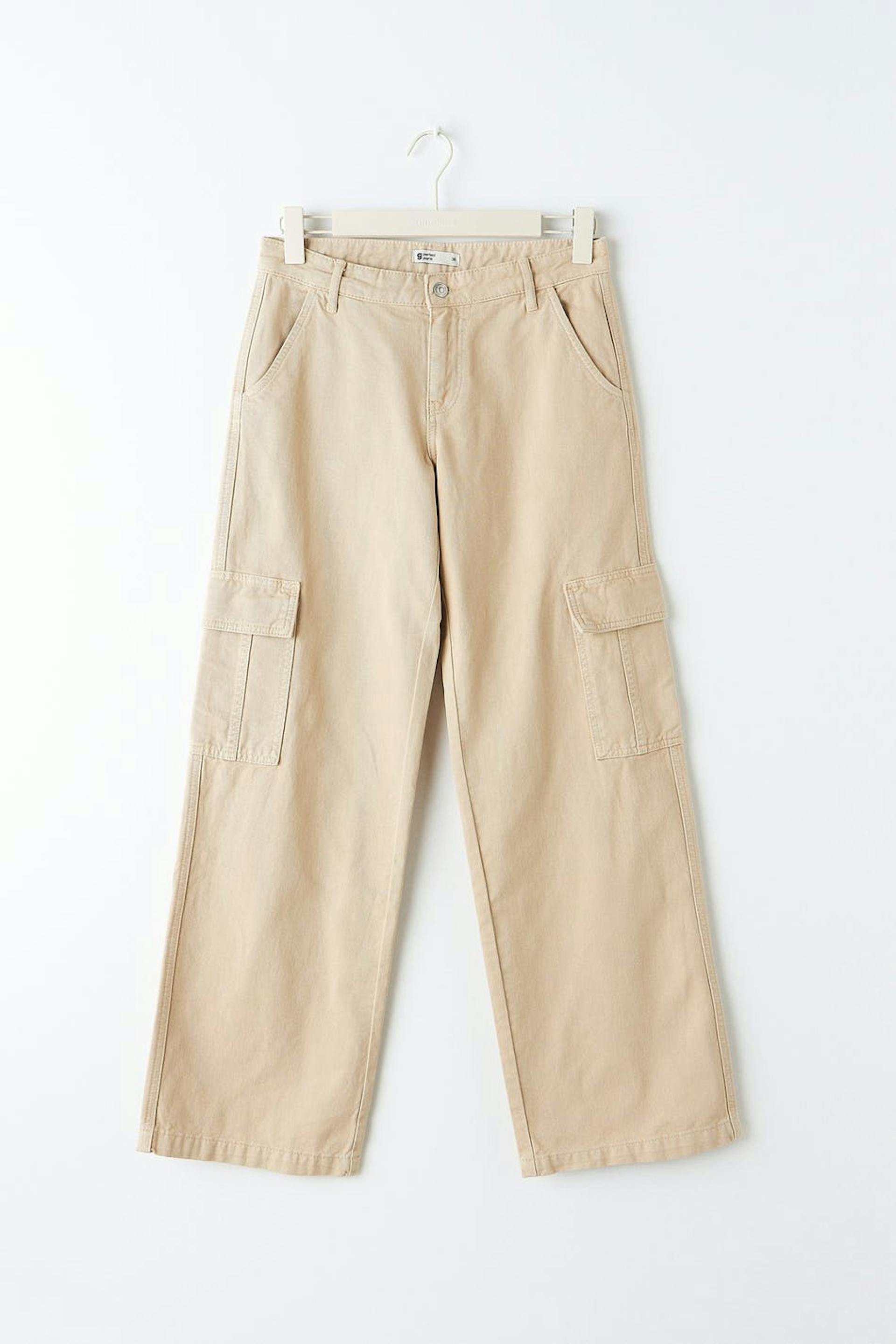Cargo-farkut matalalla vyötäröllä. Farkut ovat beigejä ja niissä on läppätaskut jalkojen sivuilla. Niissä on joustamattomat suorat lahkeet, vyötärönauha vyönlenkeillä ja taskut edessä ja takana.