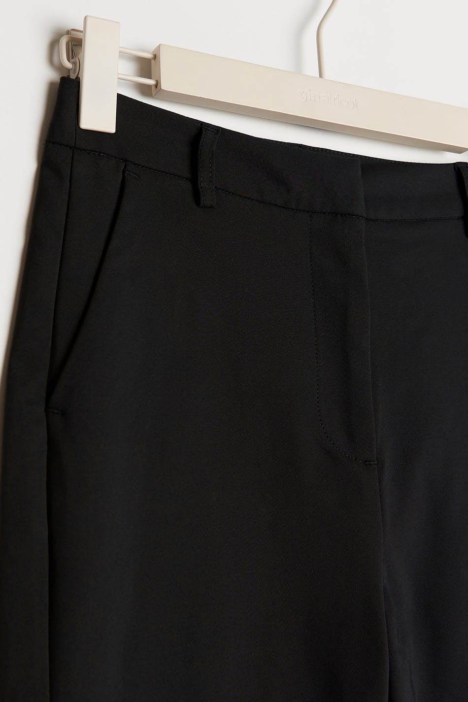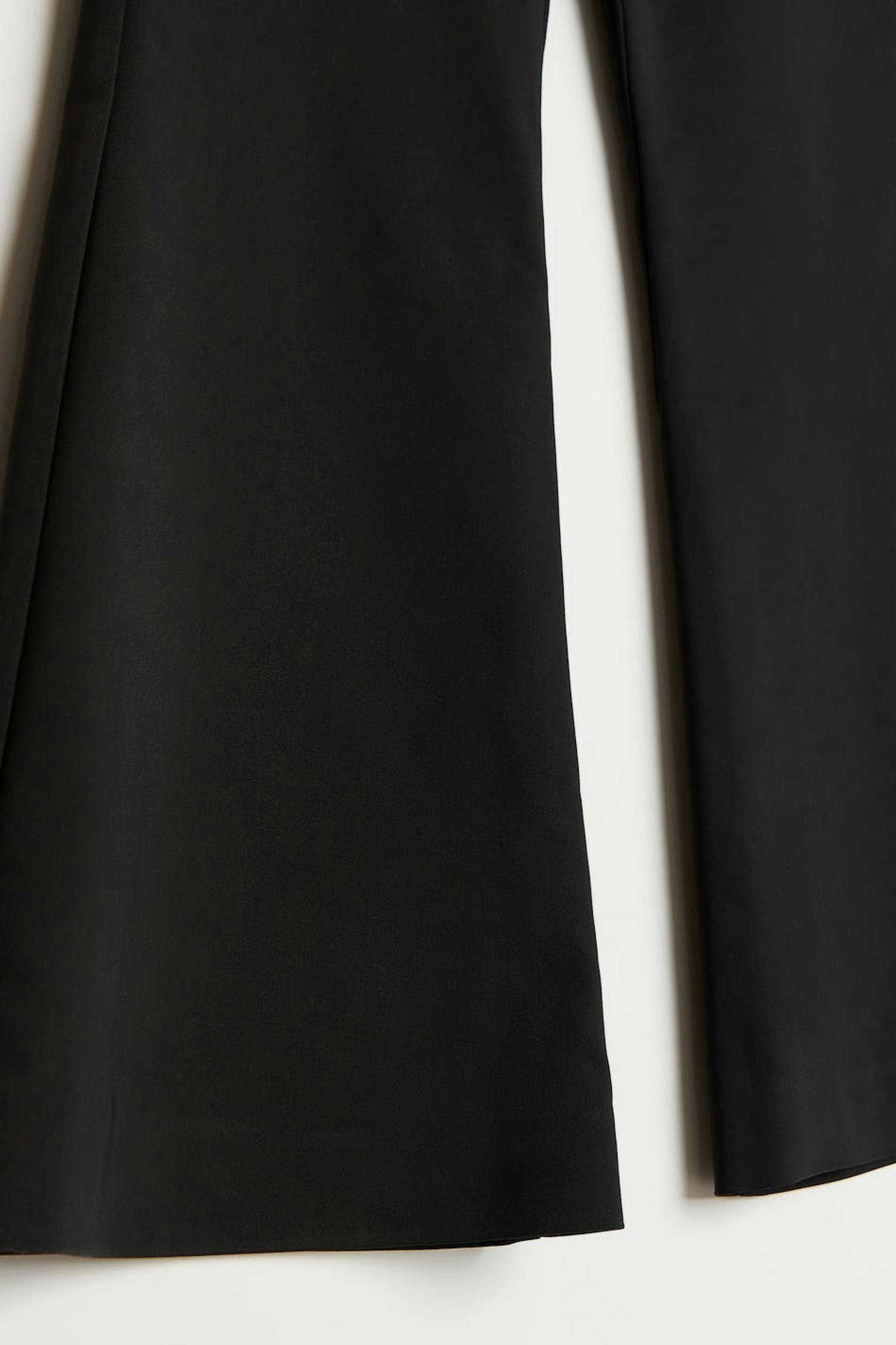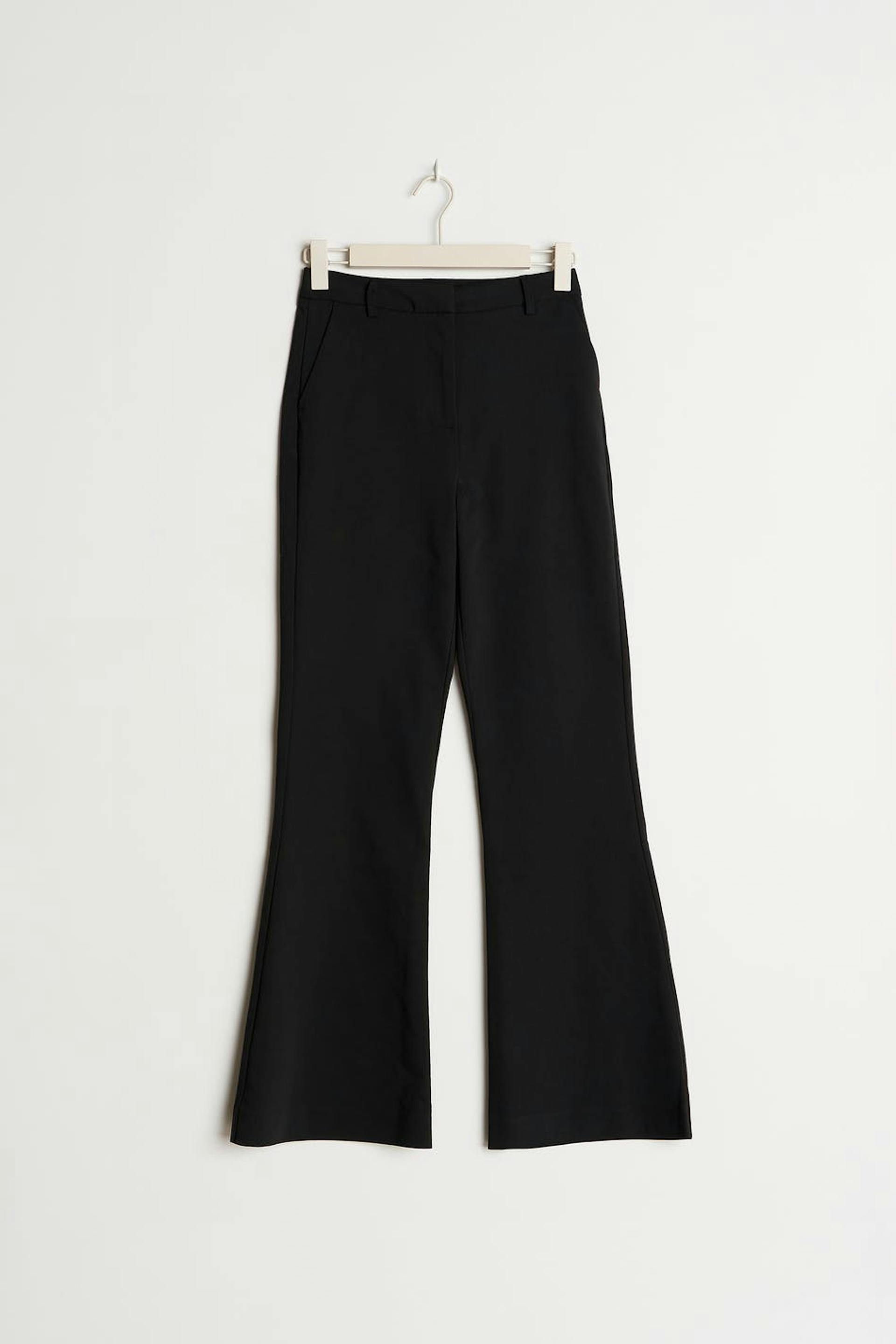 Levenevät puvunhousut korkealla vyötäröllä. Housut ovat mustia ja niissä on vyötärönauha vyönlenkeillä. Niissä on sivutaskut ja sepalus vetoketjulla ja kätketyllä napituslistalla.