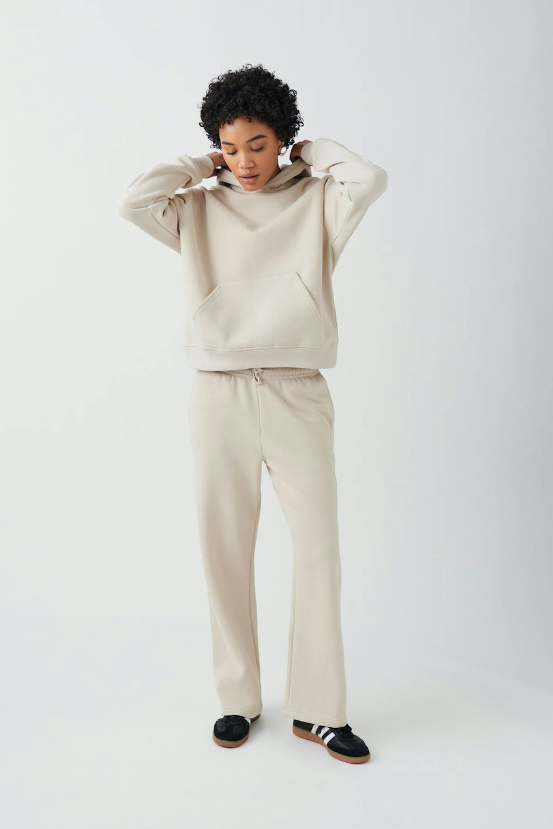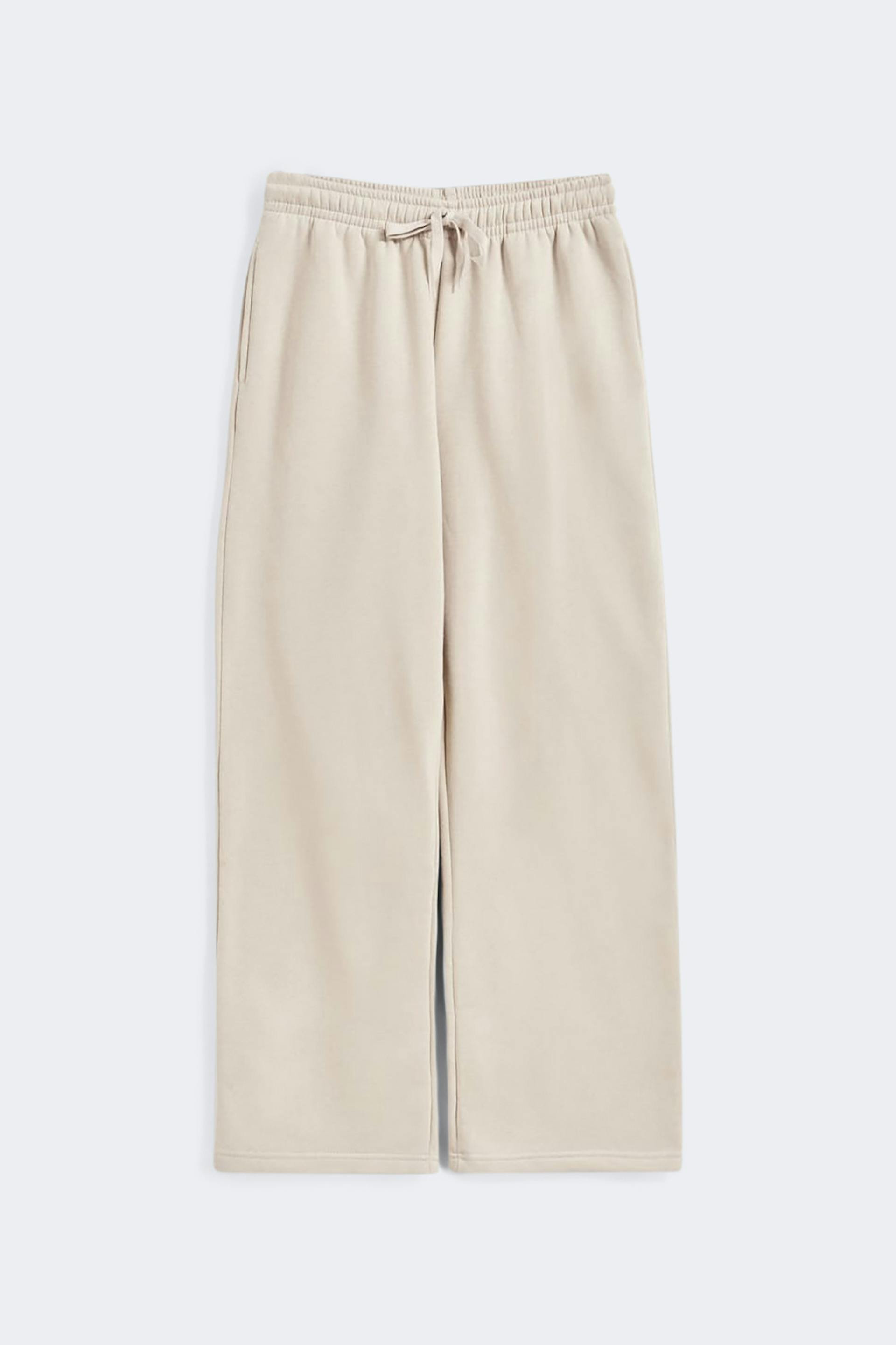 Collegehousut normaalilla leikkauksella. Housut ovat beigejä ja niissä on taskut sivuilla. Niissä on suorat lahkeet ja kuminauha vyötäröllä solmittavalla vyöllä edessä.