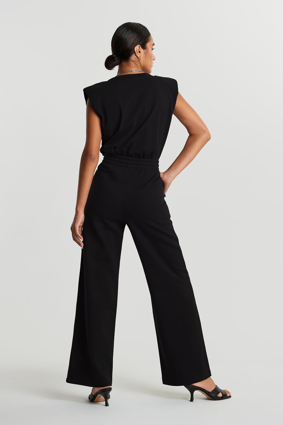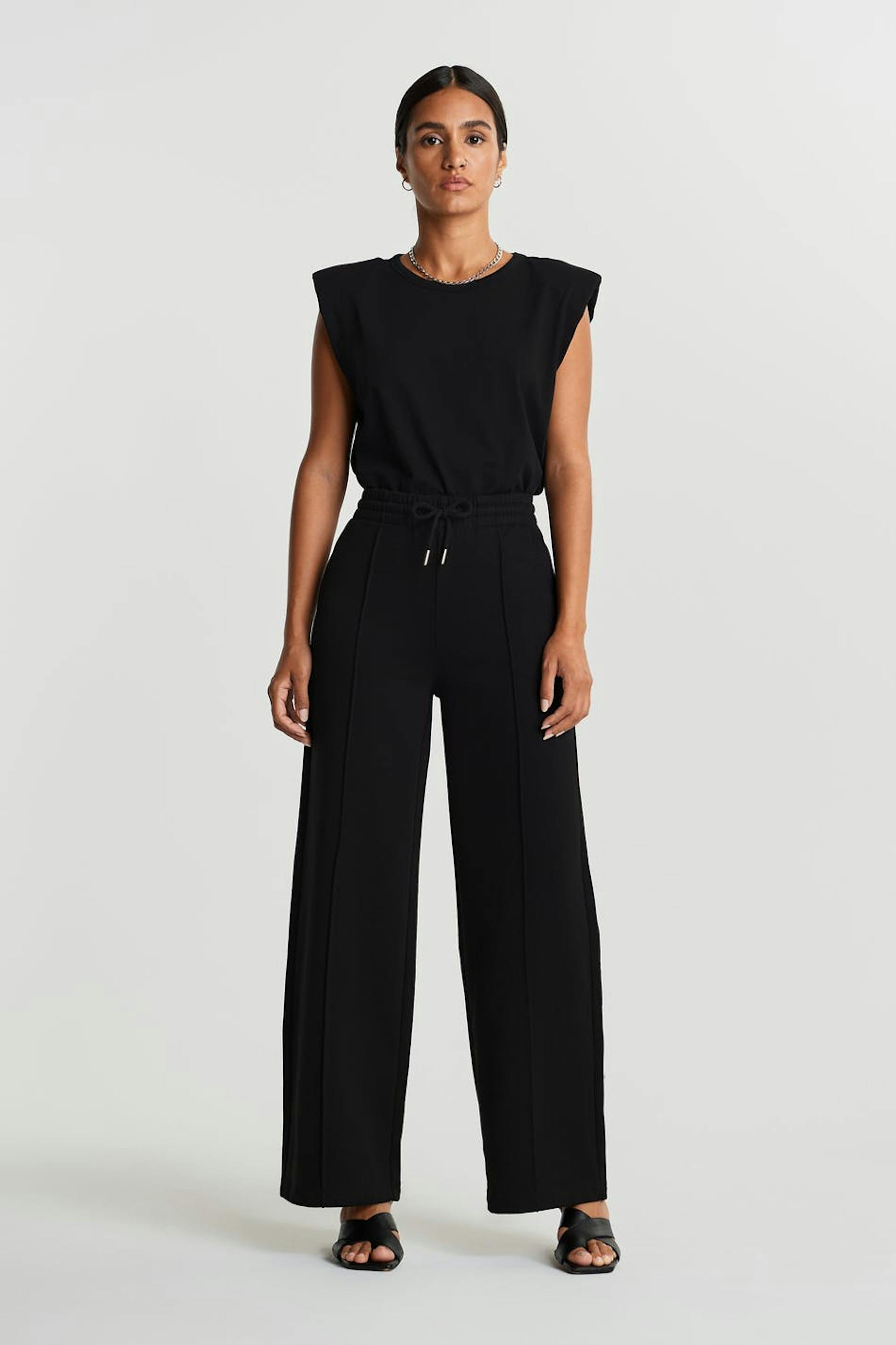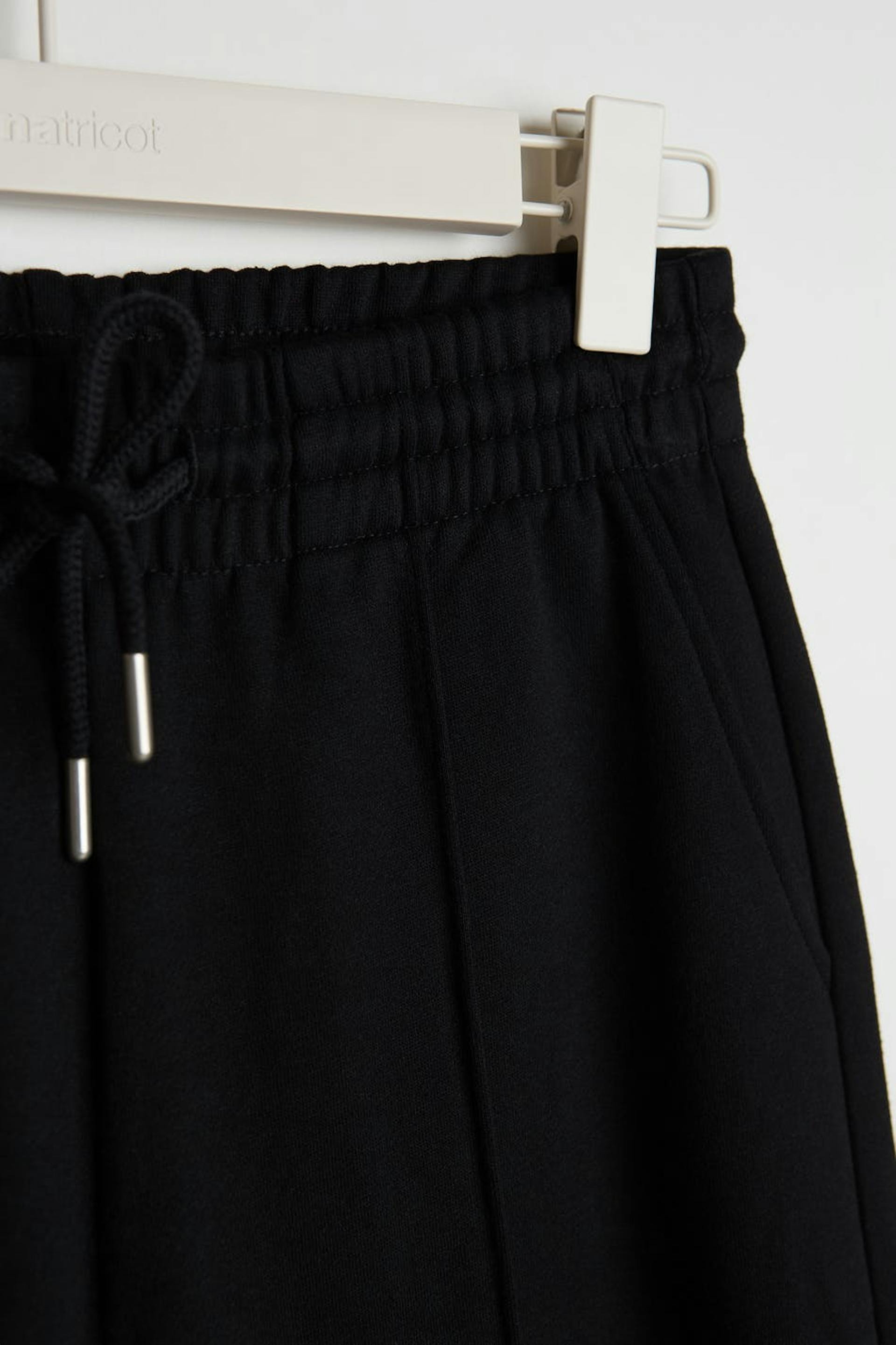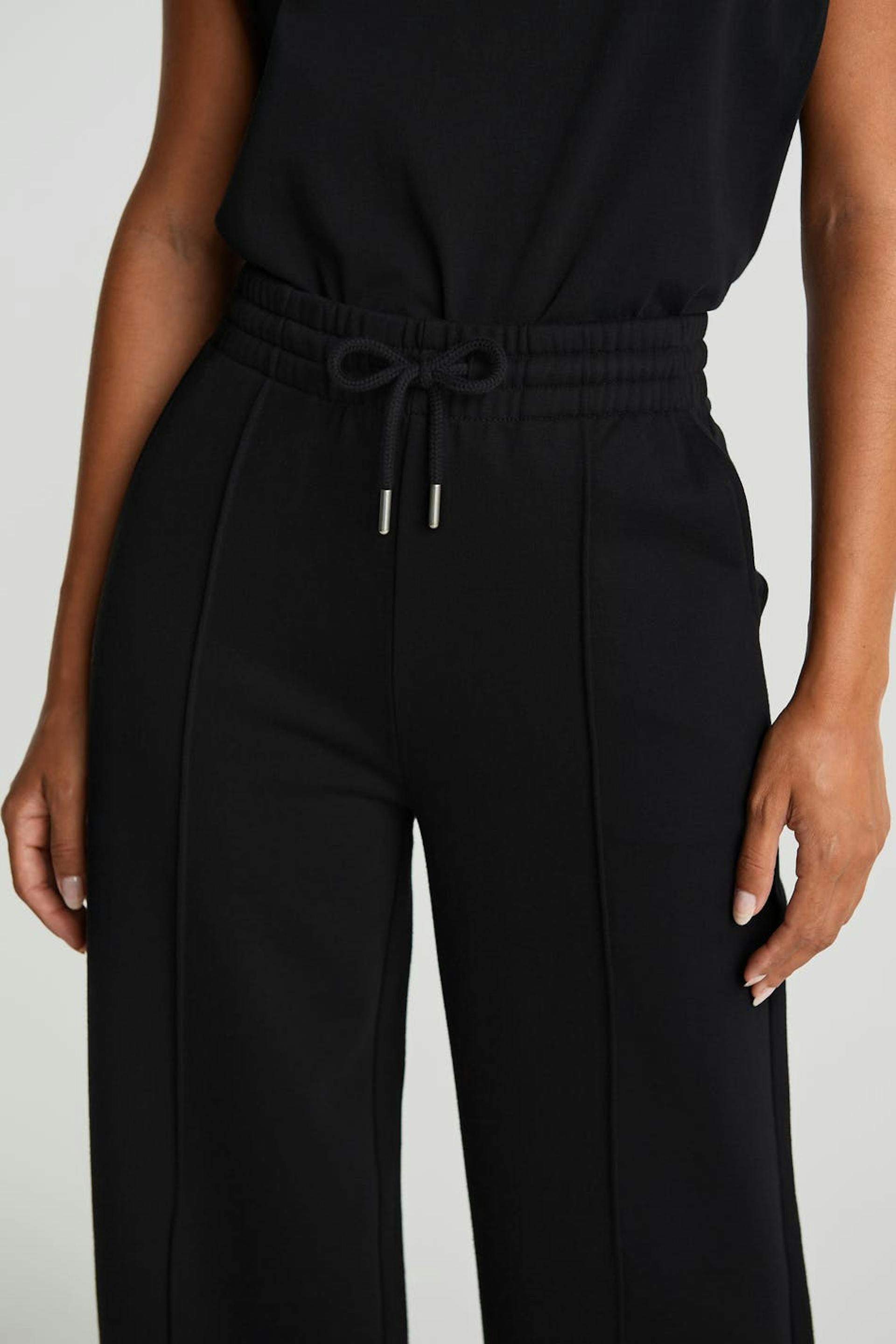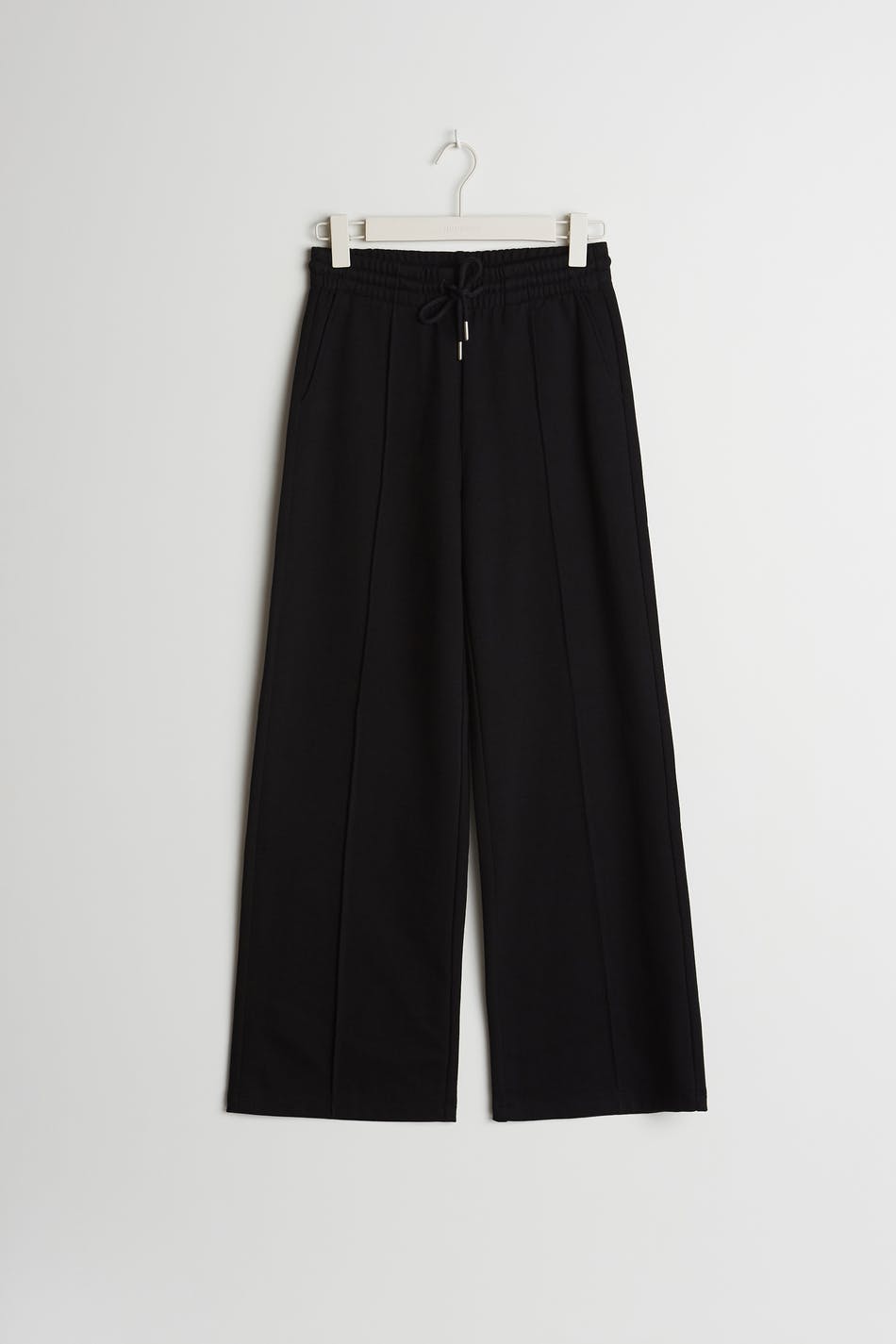 Collegehousut normaalilla leikkauksella. Housut ovat mustia ja niissä on leveät jalat saumayksityiskohdilla vekillä etusivun alaosassa. Niissä on nauhaolkain vyötäröllä.